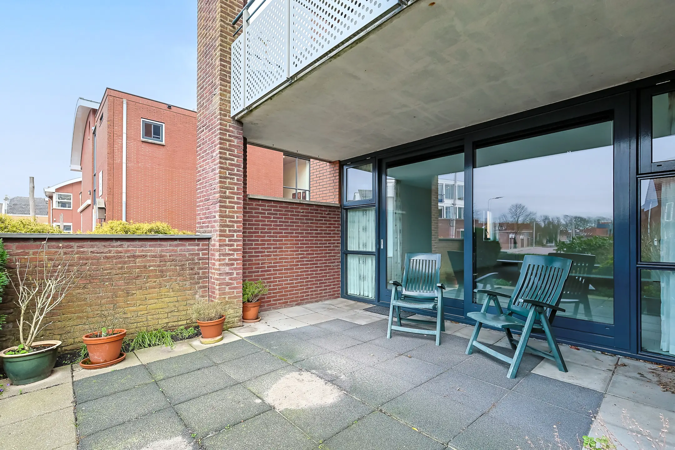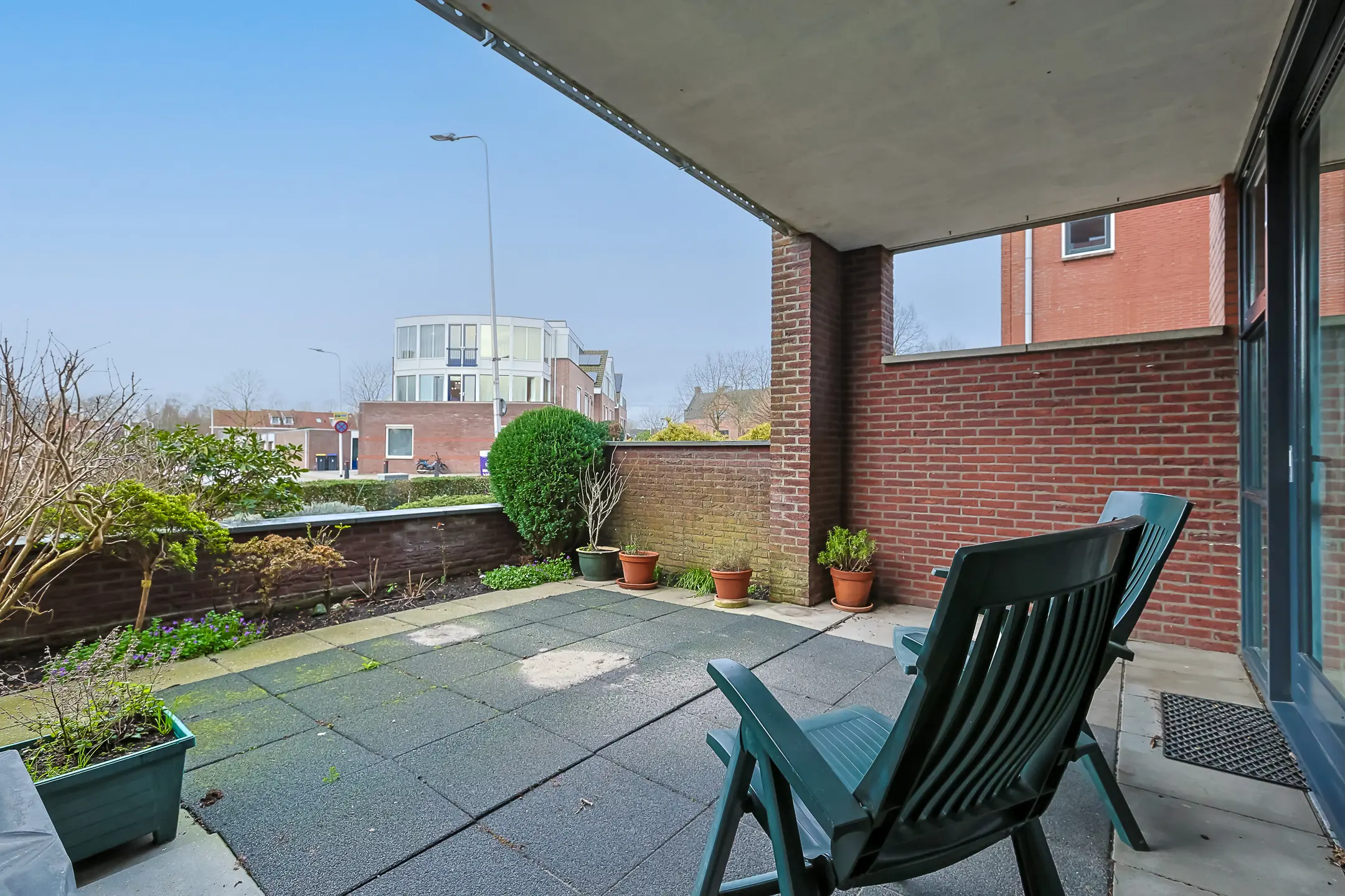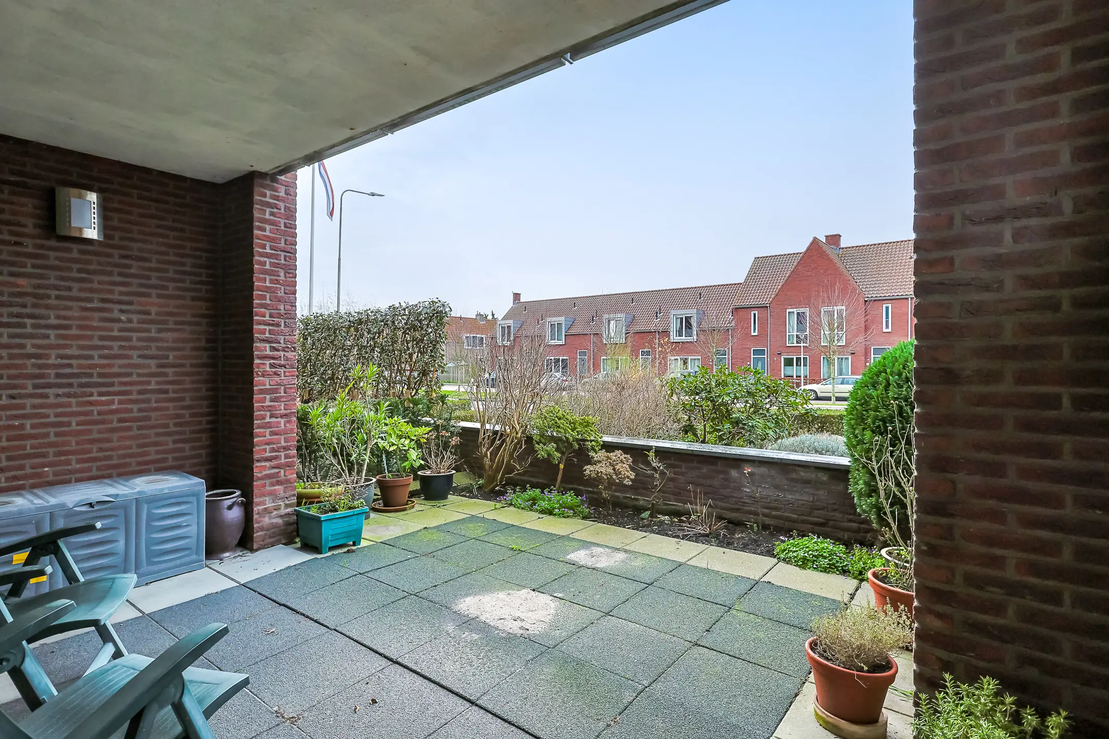 De tuin ligt op het westen en is een fijne plek om buiten te zitten, met een betegeld terras. De buitenruimte is deels overdekt, waardoor je ook bij minder weer comfortabel buiten kunt zitten.