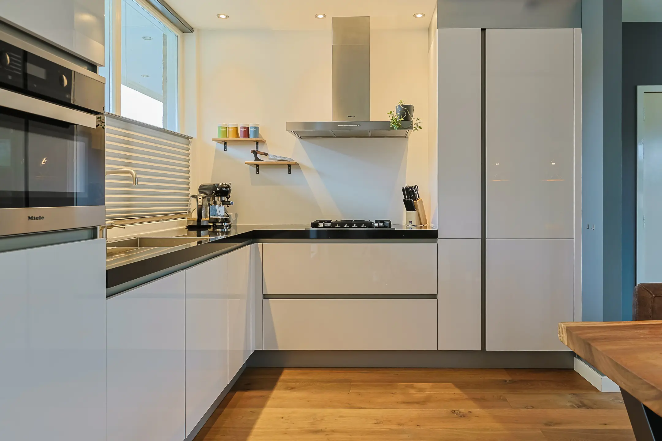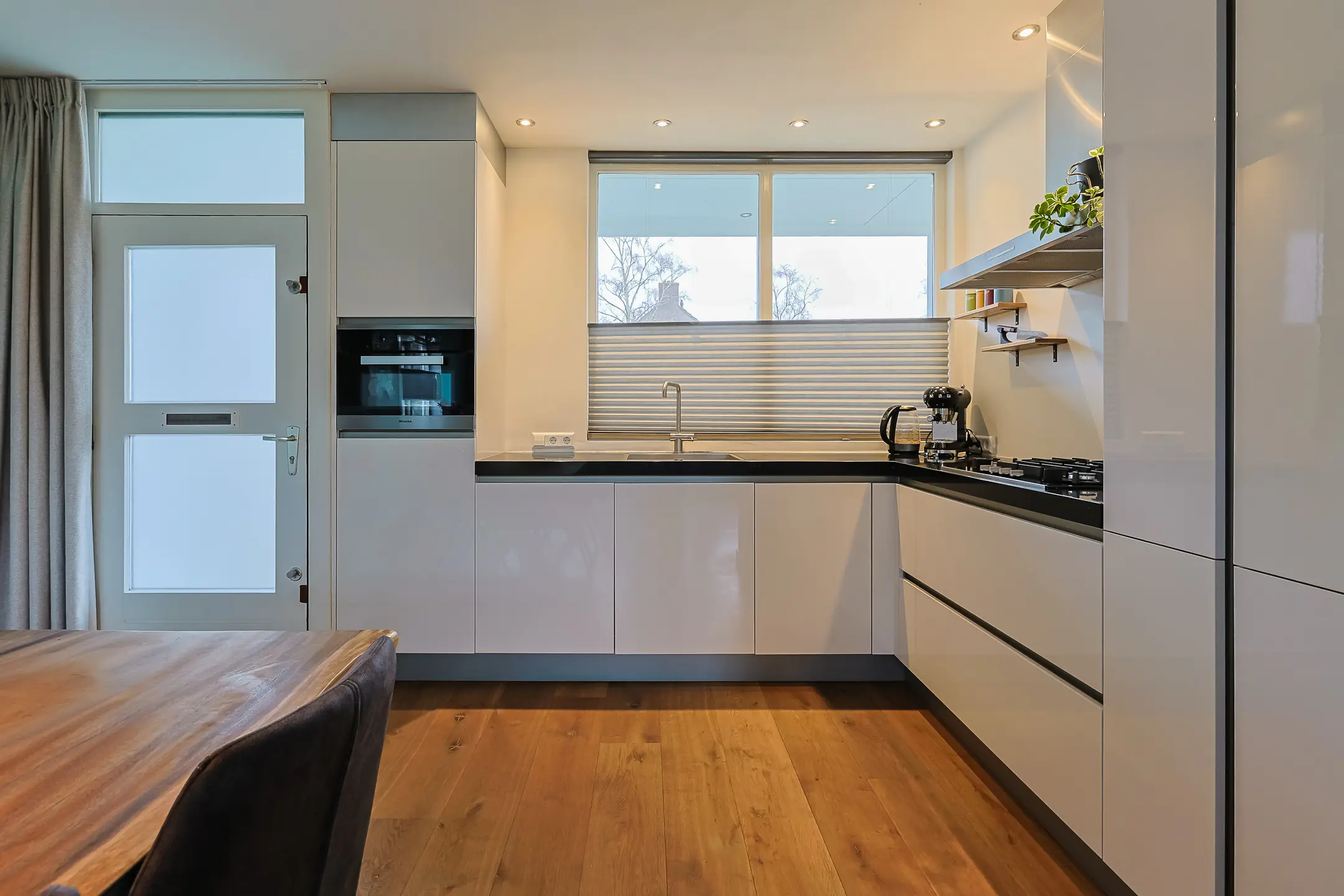 De moderne open hoekkeuken (2017) is aan de voorzijde van de woning gelegen en voorzien van diverse inbouwapparatuur zoals combi-oven, 4-pits gasfornuis, afzuigkap, vaatwasser en koel-vriescombinatie. De keuken is afgewerkt met strakke glans en greeploze fronten, een donker werkblad en inbouwspots. De keuken sluit naadloos aan op de eet- en zithoek, waardoor een gezellige en open leefruimte ontstaat. Vanuit de woonkamer heb je toegang tot het balkon door middel van openslaande deuren, gesitueerd op het zuidwesten, een fijne plek om buiten te zitten!