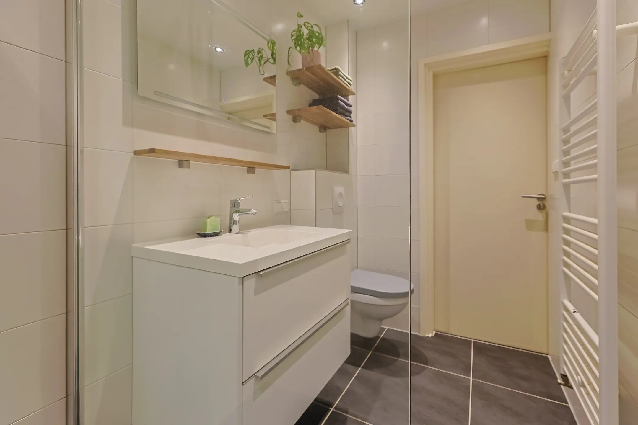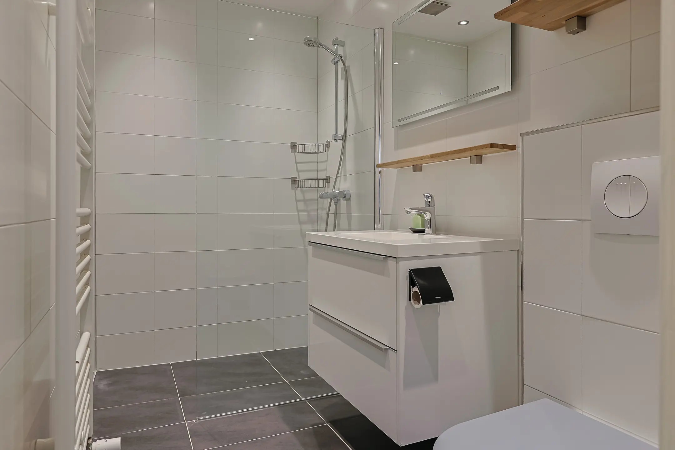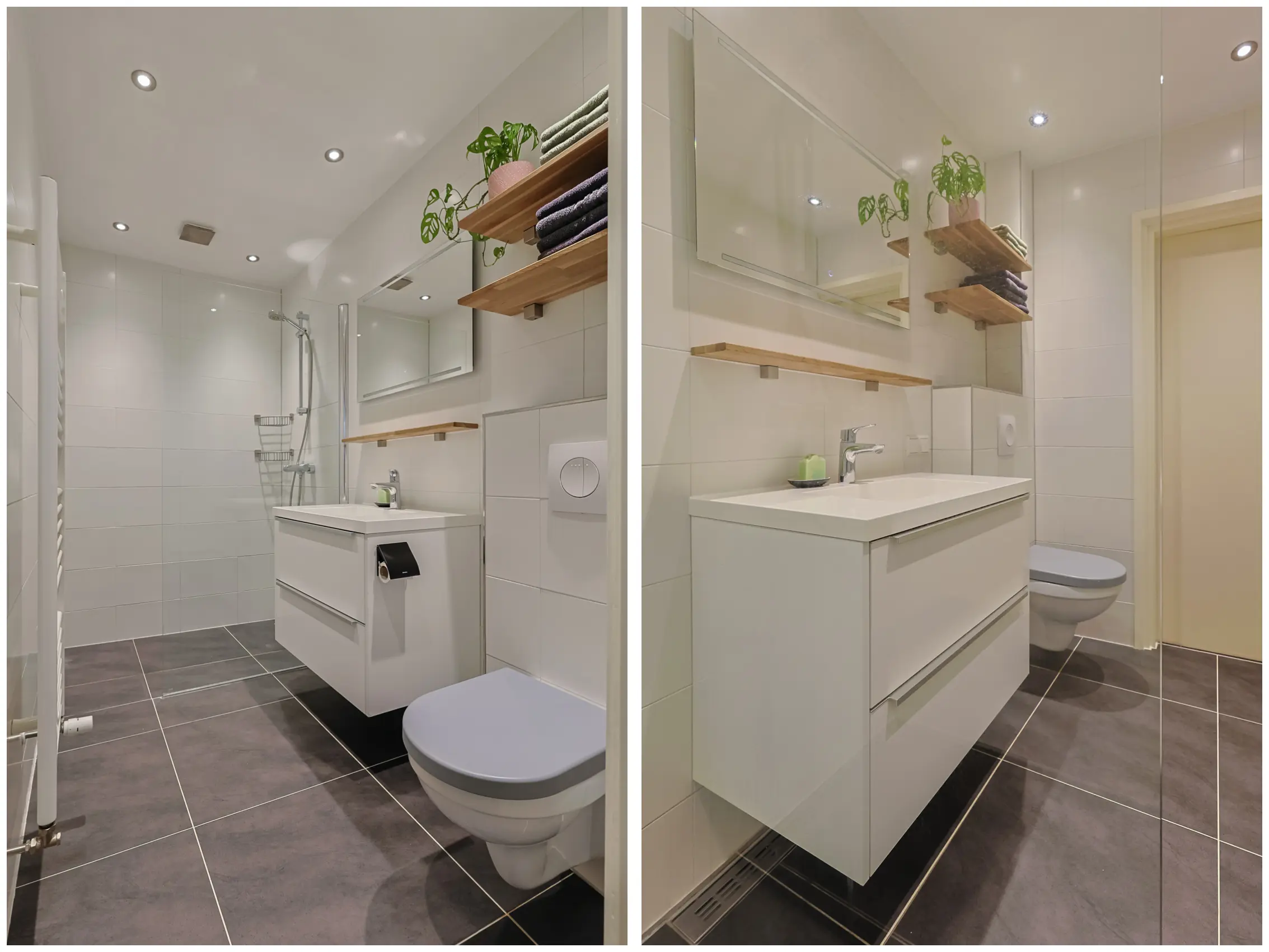 Ook bevindt zich op deze verdieping de nette badkamer met inloopdouche, hangend toilet, wastafelmeubel en designradiator.