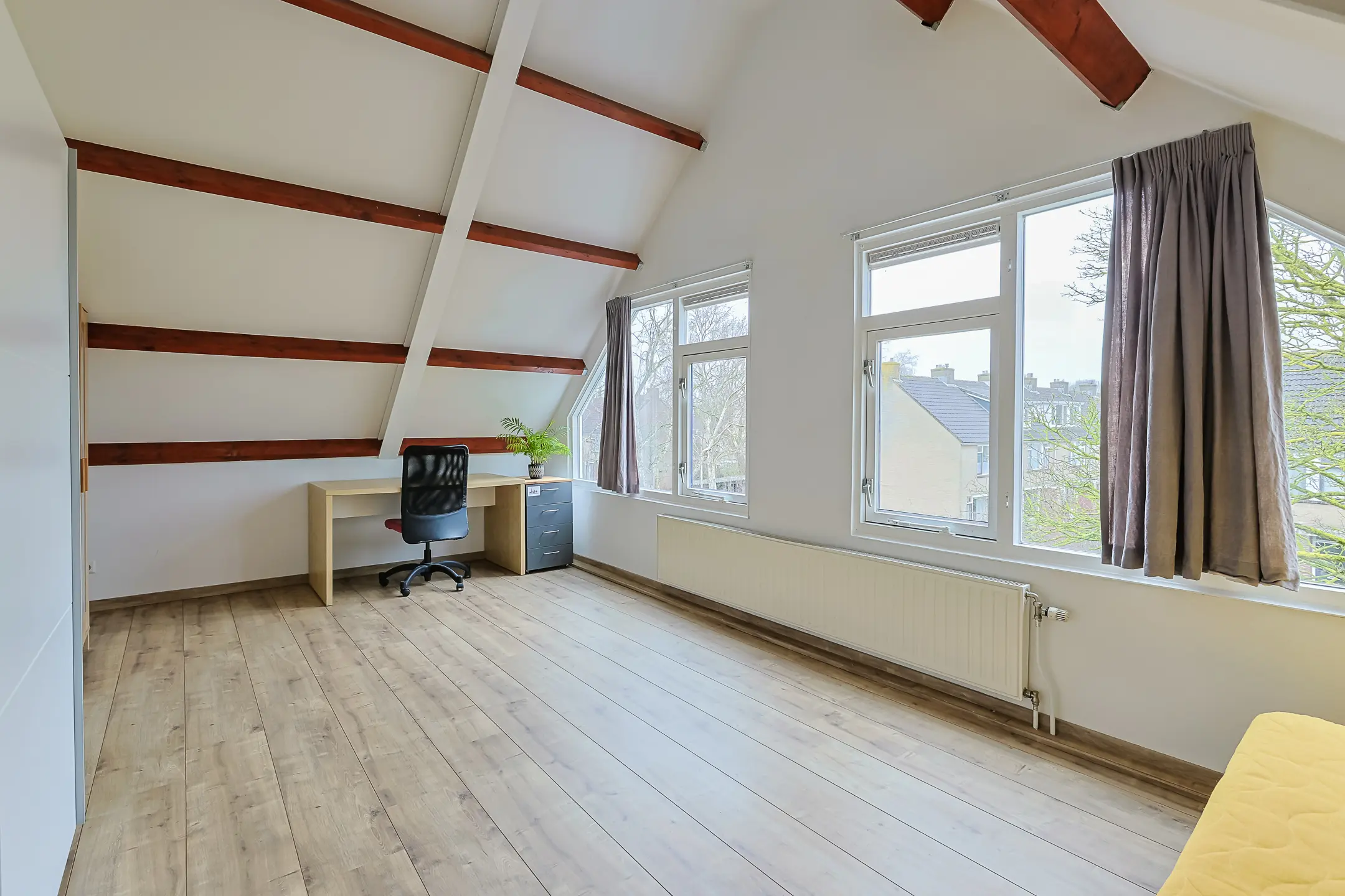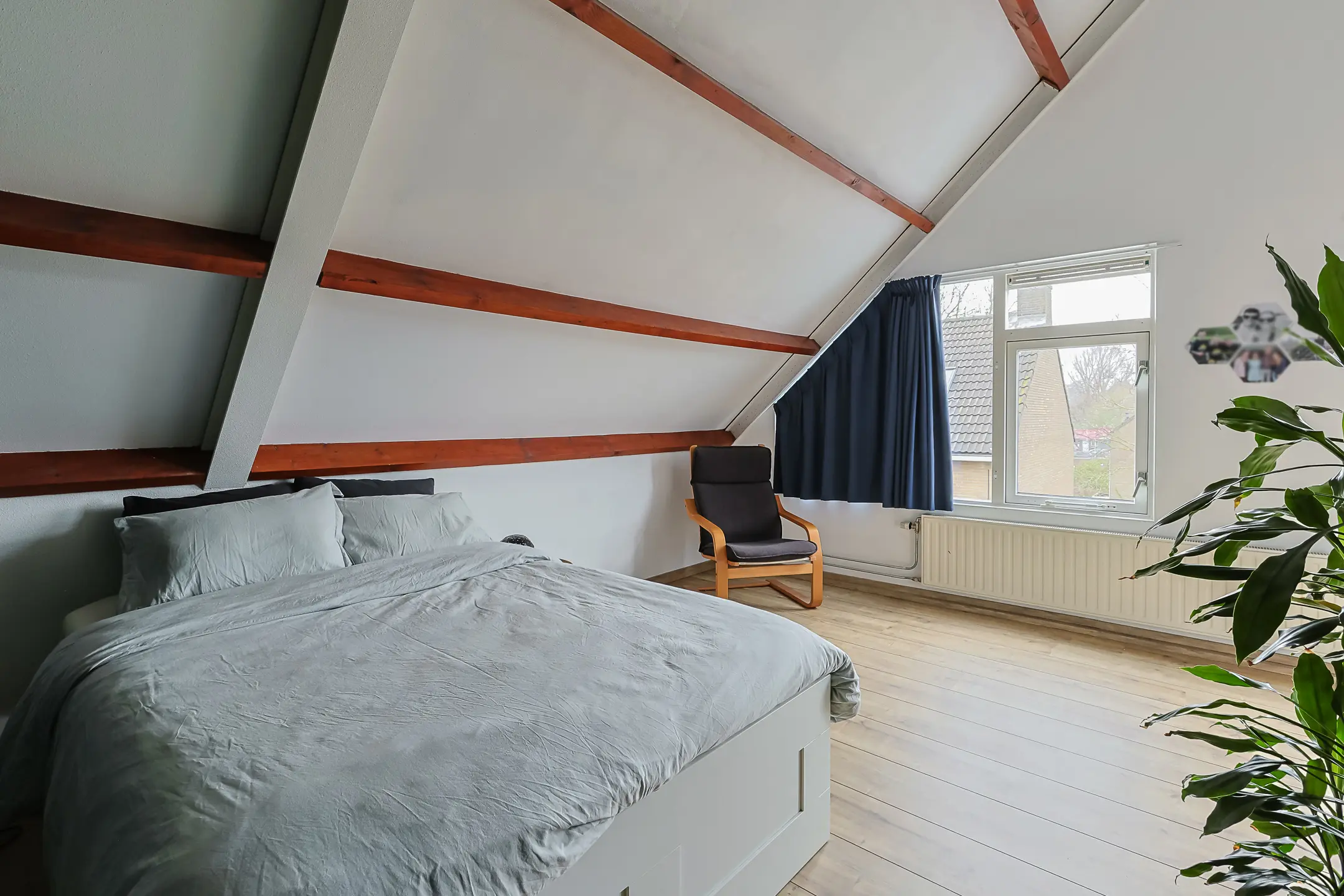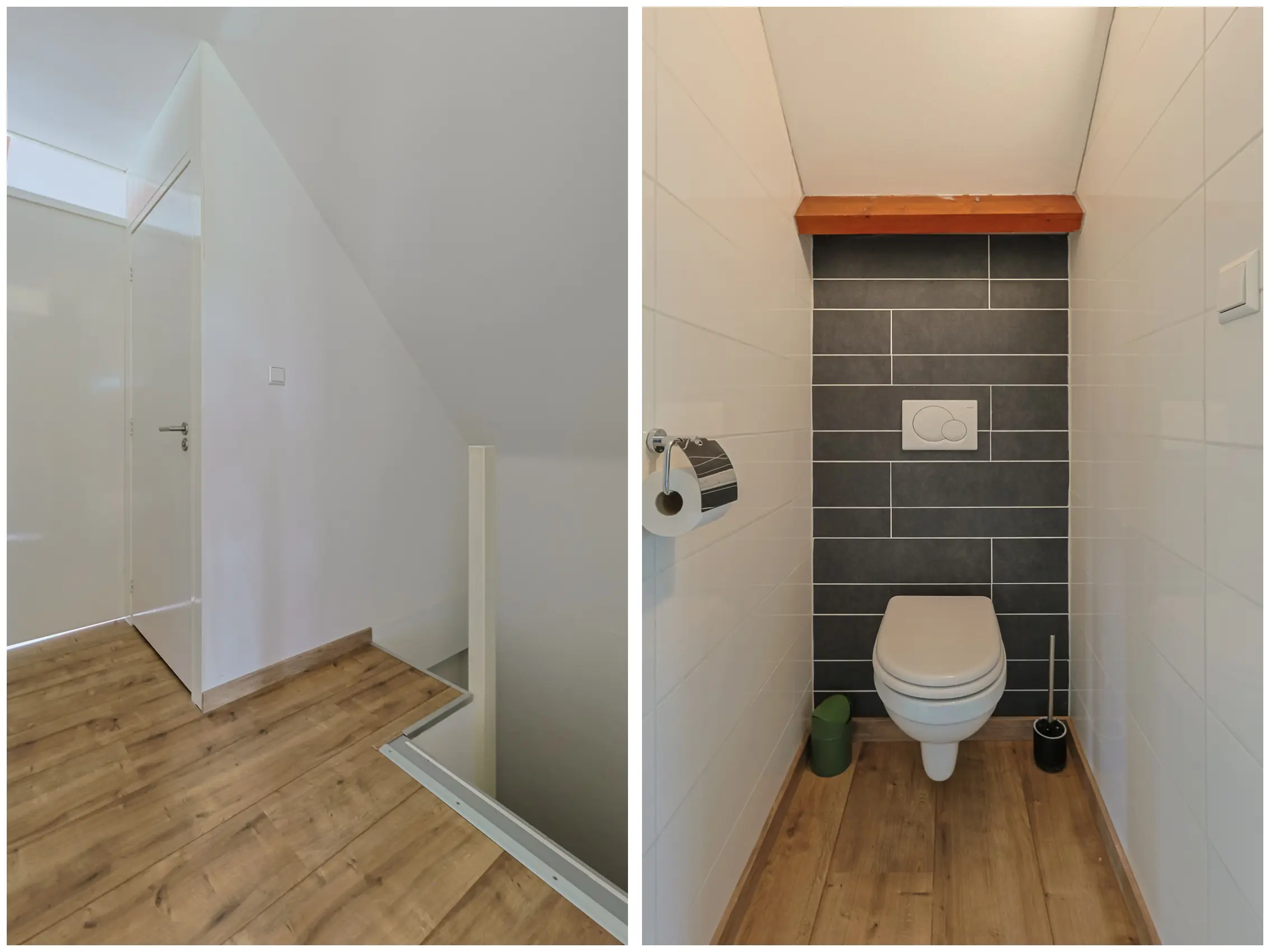 De bovenste verdieping biedt twee ruime slaapkamers voorzien van laminaatvloer. Een royale slaapkamer aan de voorzijde (ca. 5.30 x 3.61 m) met vaste schuifkastruimte en een tweede slaapkamer aan de achterzijde (ca. 4.66 x 3.40 m). Leuk is de hoge nok met houten spanten wat zorgt voor een fijn ruimtelijk effect. Indien gewenst is het mogelijk meer slaapkamers te creëren. Op de overloop bevindt zich een separaat toilet, wat zorgt voor extra comfort.
