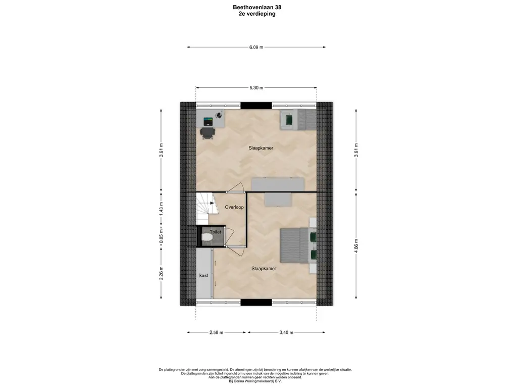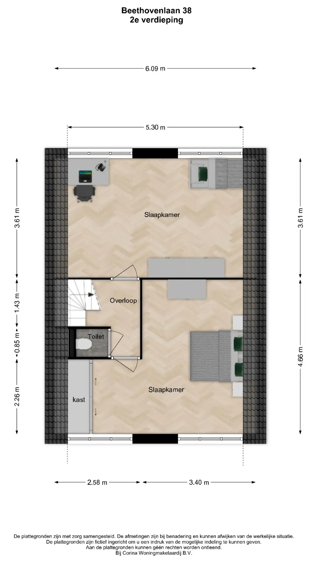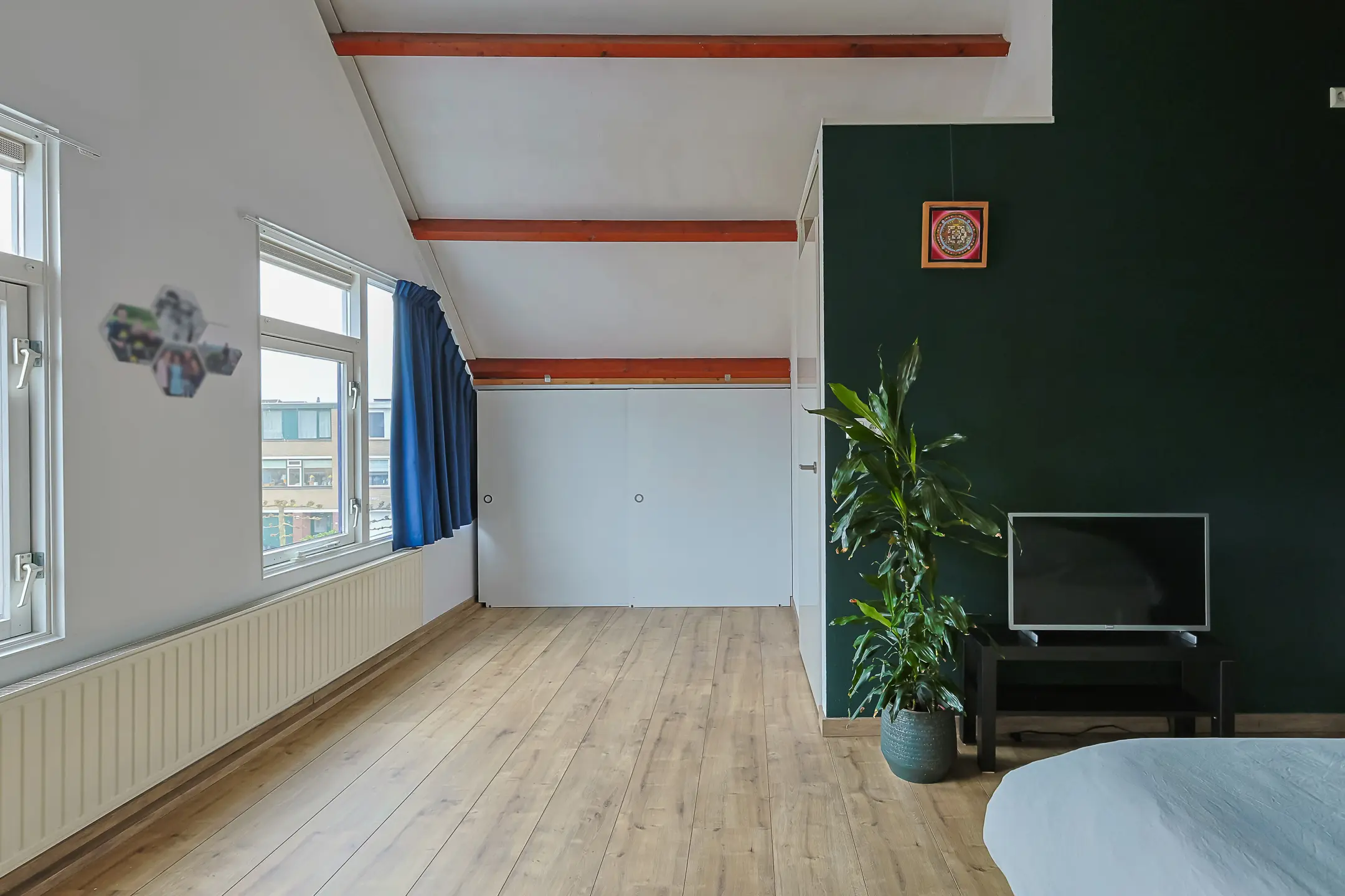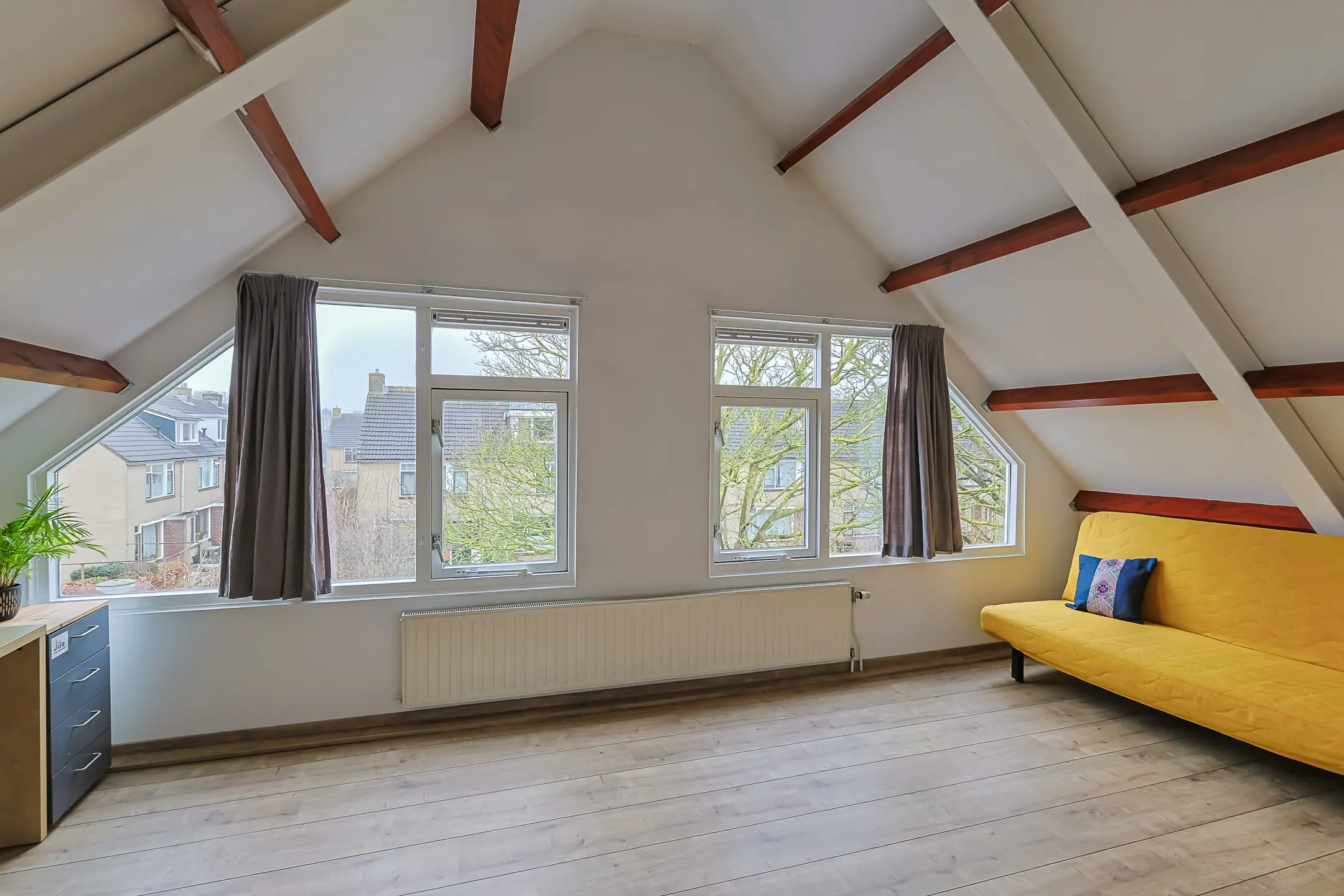 De bovenste verdieping biedt twee ruime slaapkamers voorzien van laminaatvloer. Een royale slaapkamer aan de voorzijde (ca. 5.30 x 3.61 m) met vaste schuifkastruimte en een tweede slaapkamer aan de achterzijde (ca. 4.66 x 3.40 m). Leuk is de hoge nok met houten spanten wat zorgt voor een fijn ruimtelijk effect. Indien gewenst is het mogelijk meer slaapkamers te creëren. Op de overloop bevindt zich een separaat toilet, wat zorgt voor extra comfort.