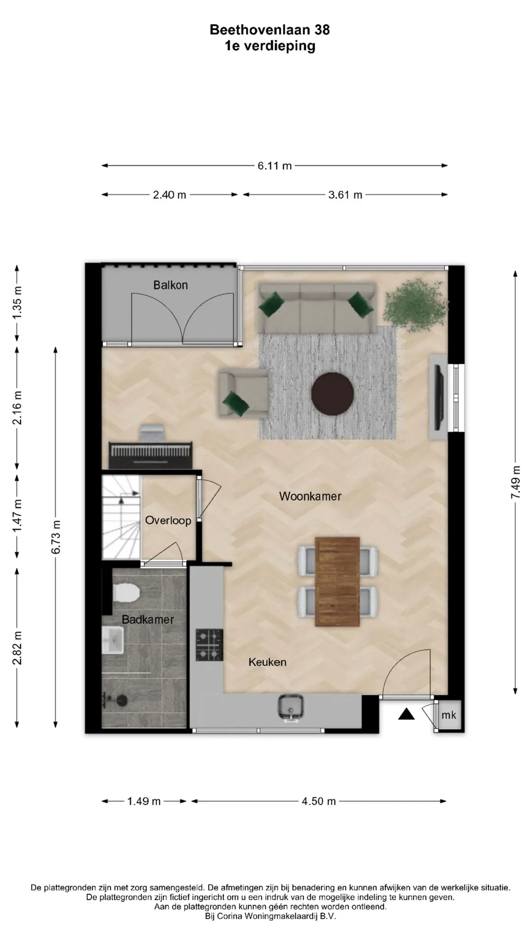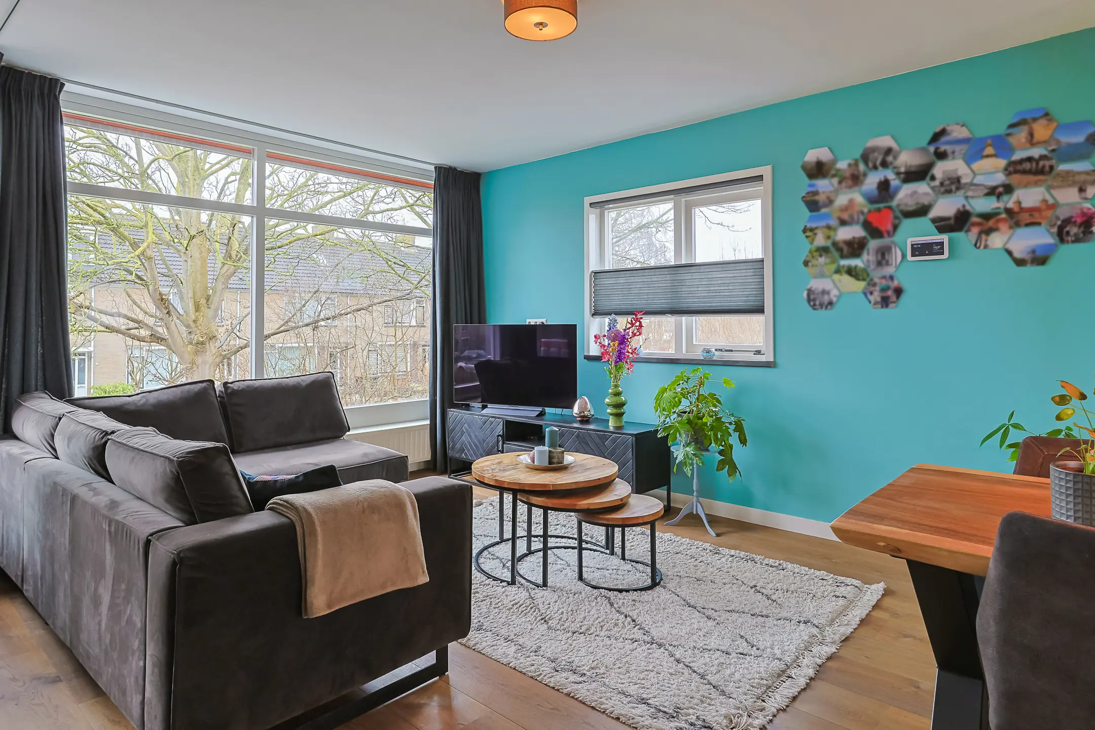 Op de eerste verdieping bevindt zich de lichte woonverdieping welke afgewerkt is met een mooie houten vloer. De woonkamer beschikt aan de achterzijde over grote raampartijen en kijkt weg over een groenplantsoen. Doordat de woning op de hoek is gelegen heeft deze woning ook een zijraam waardoor er nog meer licht door naar binnen komt. Een hele fijne ruimte om te verblijven!