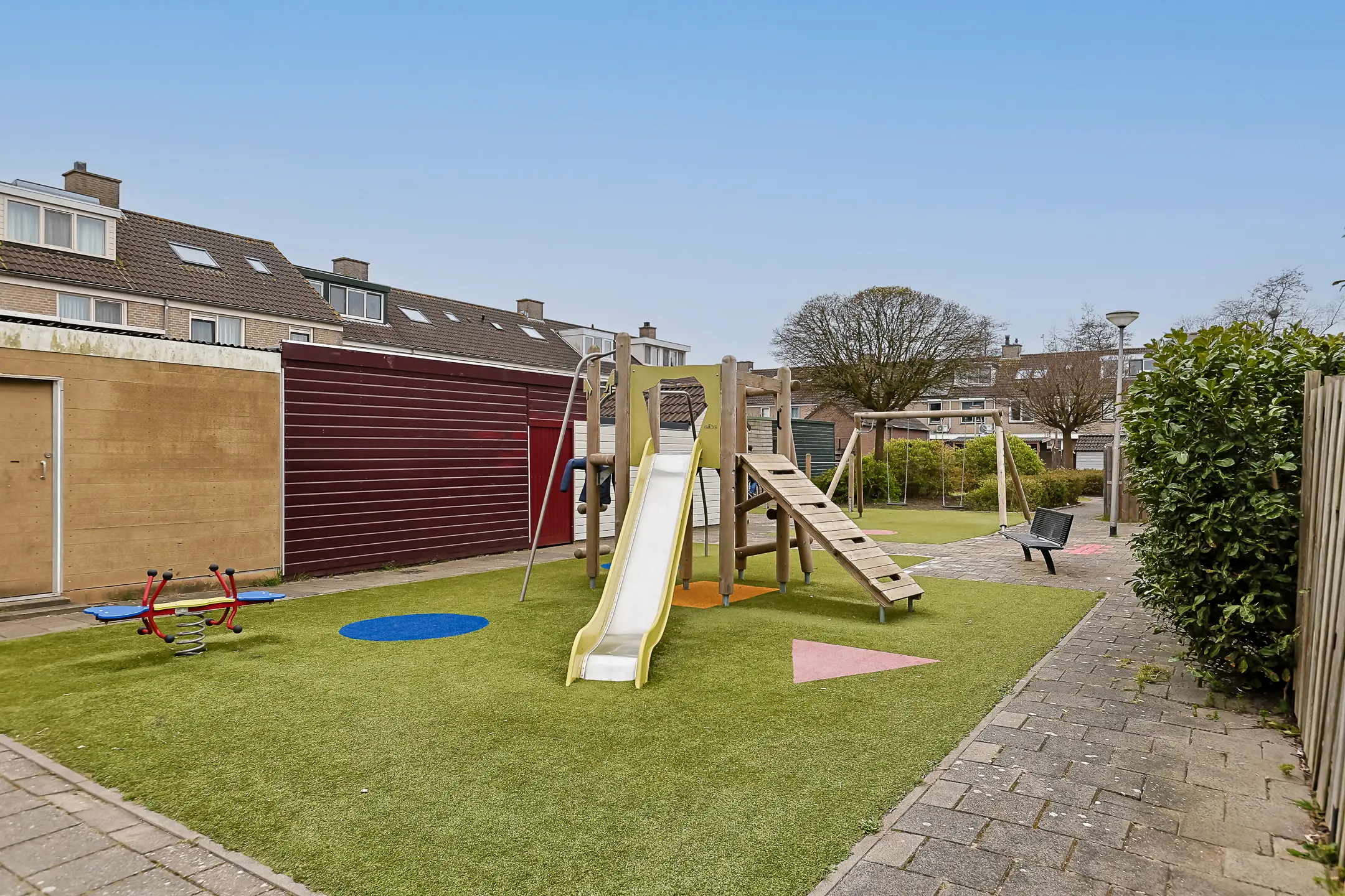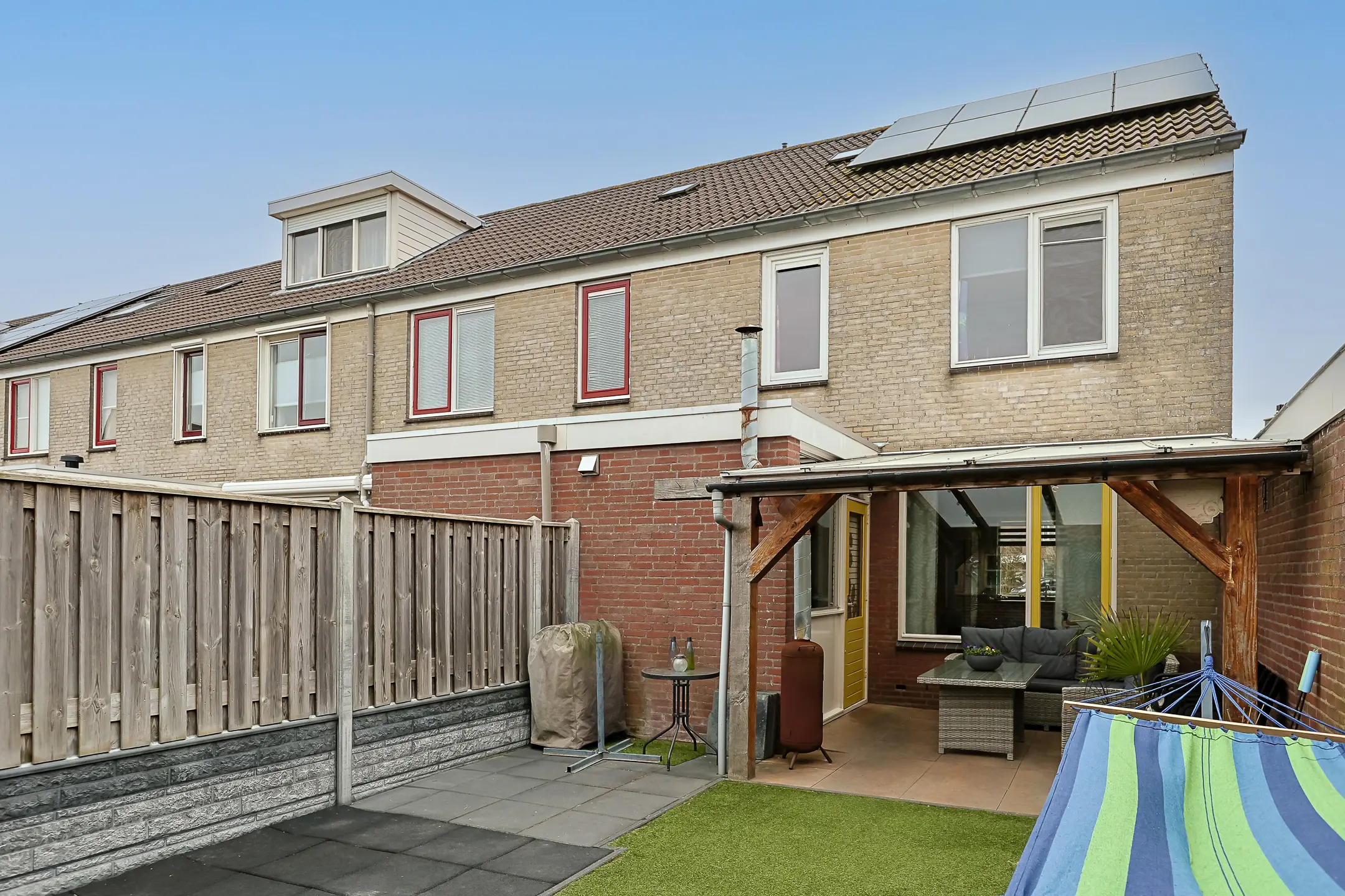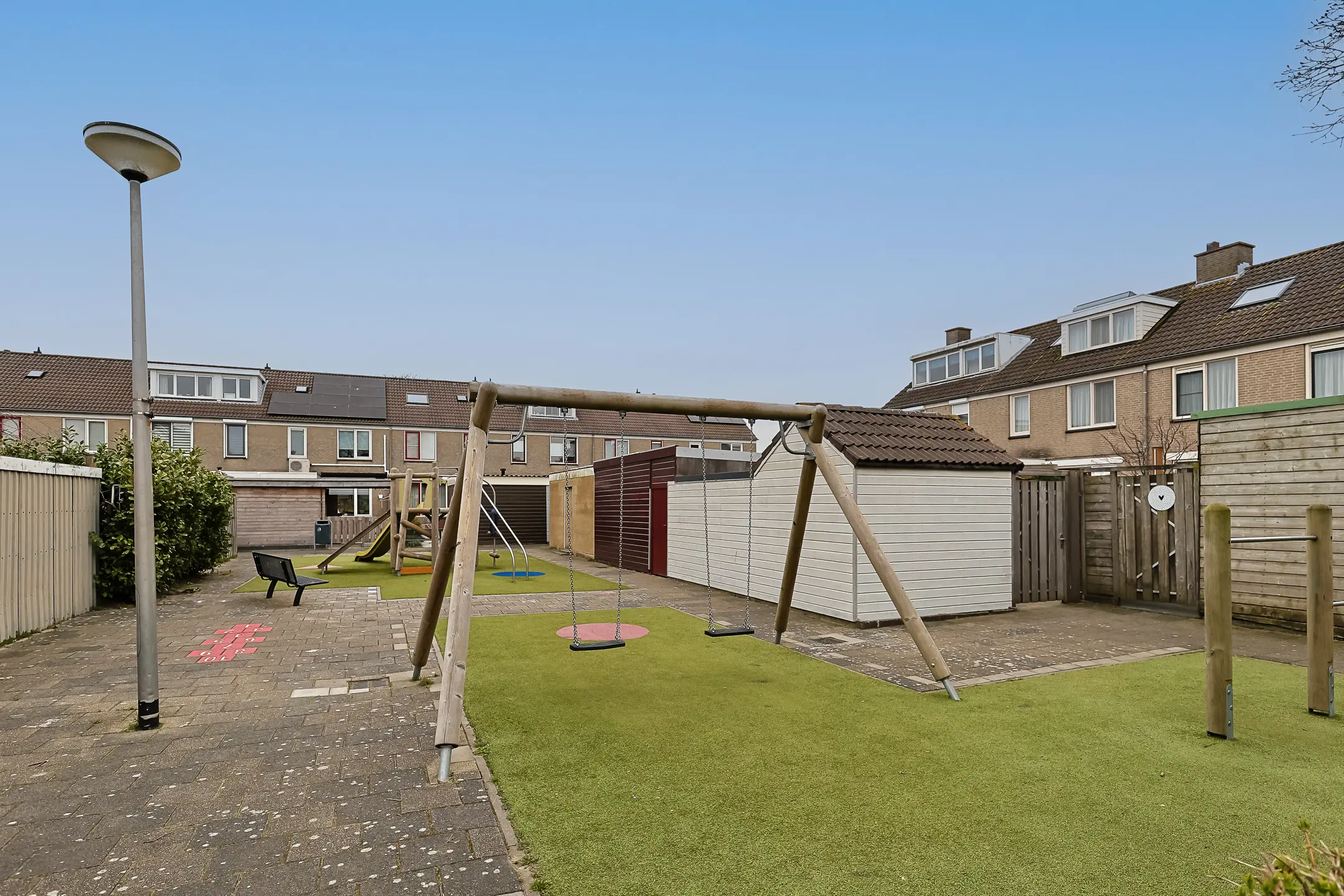 De zonnige achtertuin ligt op het zuidwesten en beschikt over een overkapping, ideaal om het hele jaar door buiten te zitten. Achterin de tuin staat een grote vernieuwde gemetselde schuur met betonnen vloer, raampjes, overkapping en voorzien van elektra. De schutting met de buren is recent vervangen. De tuin is voorzien van kunstgras en een terras aan de woonkamerzijde. Vanuit de tuin loop je zó het aangrenzende speeltuintje in, wat deze woning extra aantrekkelijk maakt voor gezinnen met kinderen. Aan de voorzijde van de woning heb je de beschikking over maar liefst twee parkeerplaatsen op eigen terrein.