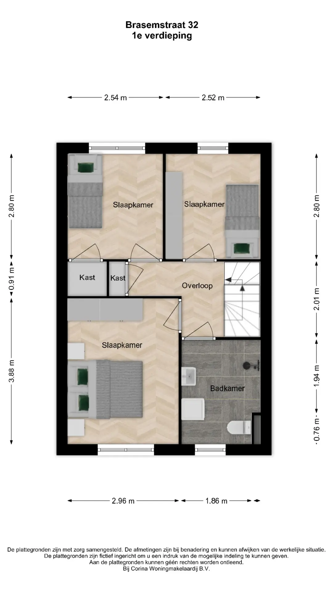 Op deze verdieping vind je de overloop met bergkast, 3 slaapkamers van goed formaat. Twee slaapkamers met kantel-/kiepramen zijn aan de achterzijde gesitueerd, waarvan 1 met een inbouwkast. De ouderslaapkamer bevindt zich aan de voorzijde. De badkamer is een functioneel ruimte met een raam, toilet, douche, wastafel, planchet, spiegel, wasmachineaansluiting en biedt de mogelijkheid om geheel naar eigen smaak te moderniseren.