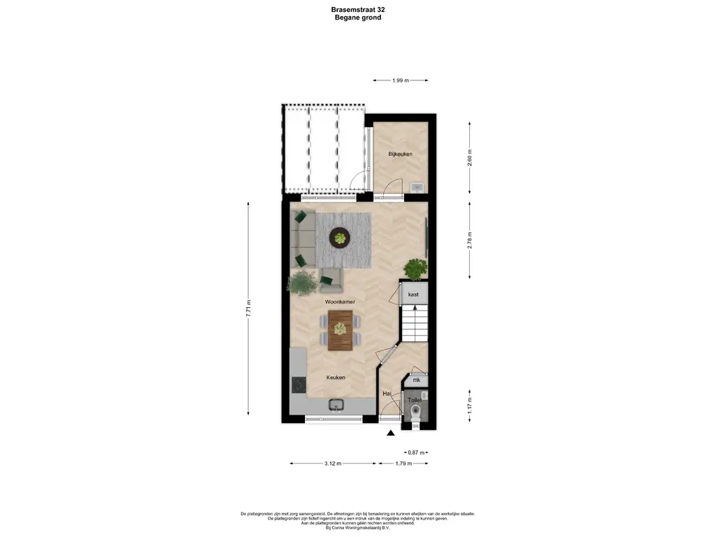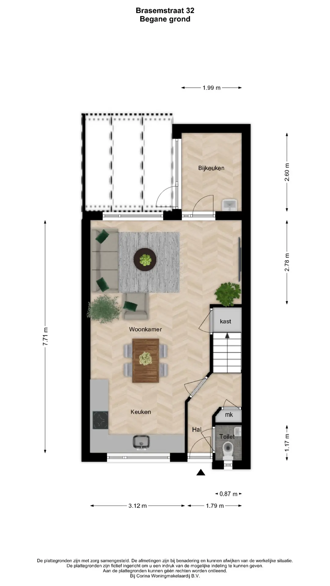 Je betreedt de woning via de hal met een meterkast en een modern afgewerkt toilet met fonteintje. Vanuit hier kom je in de lichte en tuingerichte woonkamer met een praktische uitbouw aan de achterzijde, momenteel in gebruik als bijkeuken. De woonkamer is voorzien van een trapkast, laminaatvloer en geschilderde wanden. Aan de voorzijde bevindt zich de moderne open keuken, uitgerust met diverse inbouwapparatuur, een fijne plek om te koken en in contact te blijven met het gezin. Het is een functionele en eigentijdse leefruimte waar nog veel potentie in zit. Door de verplaatsing van de keuken naar de voorzijde is bovendien een nieuw kozijn geplaatst.