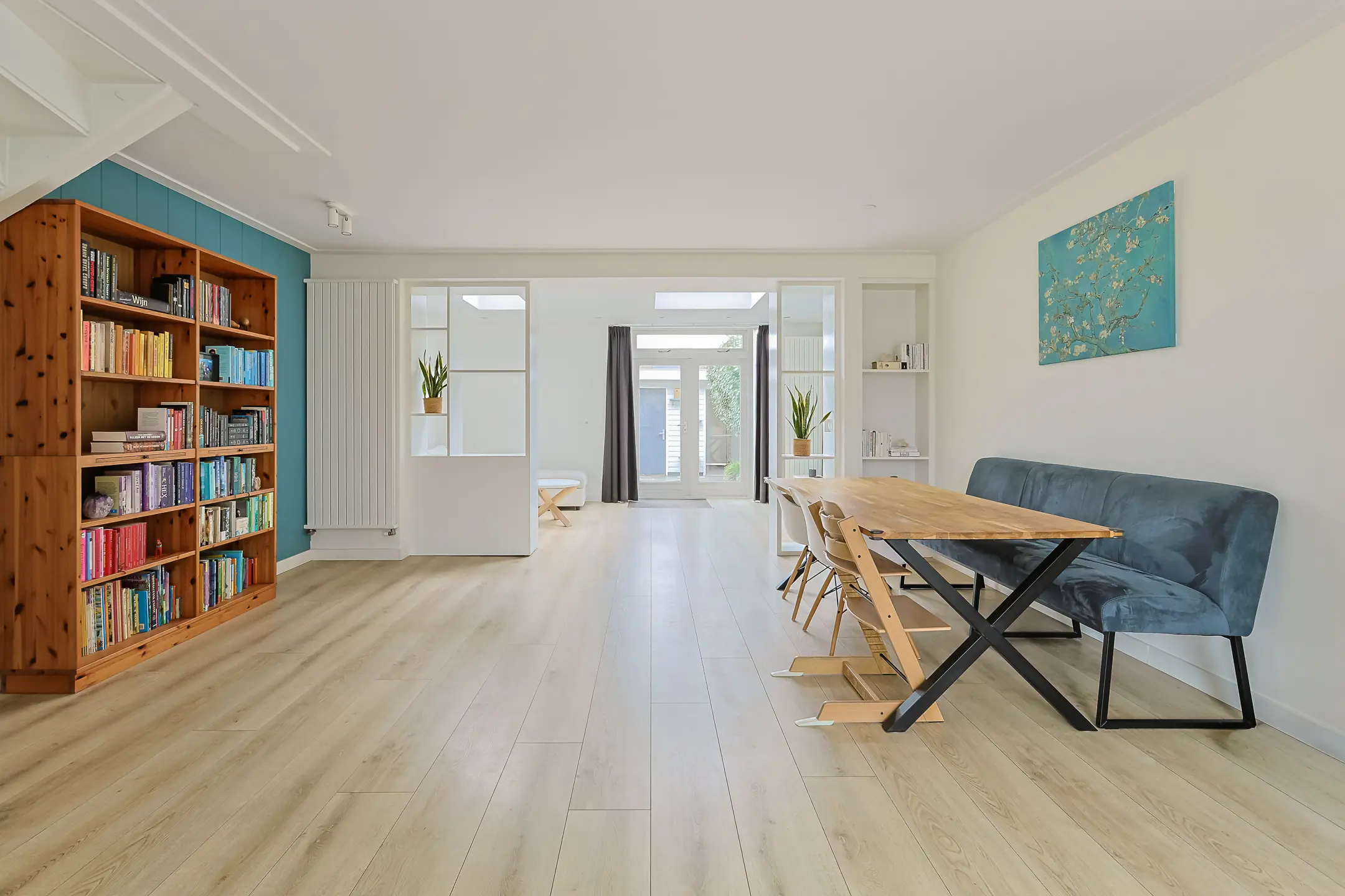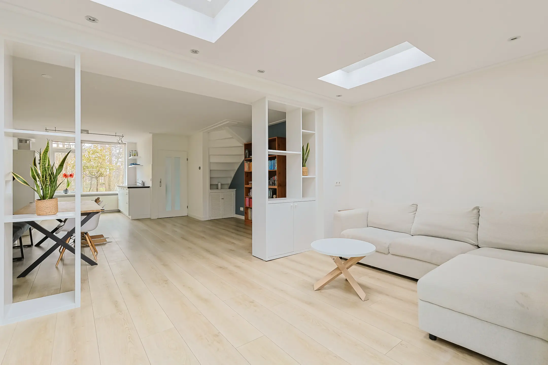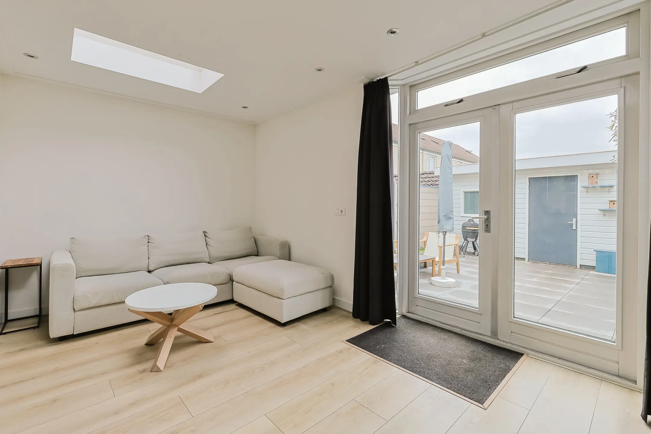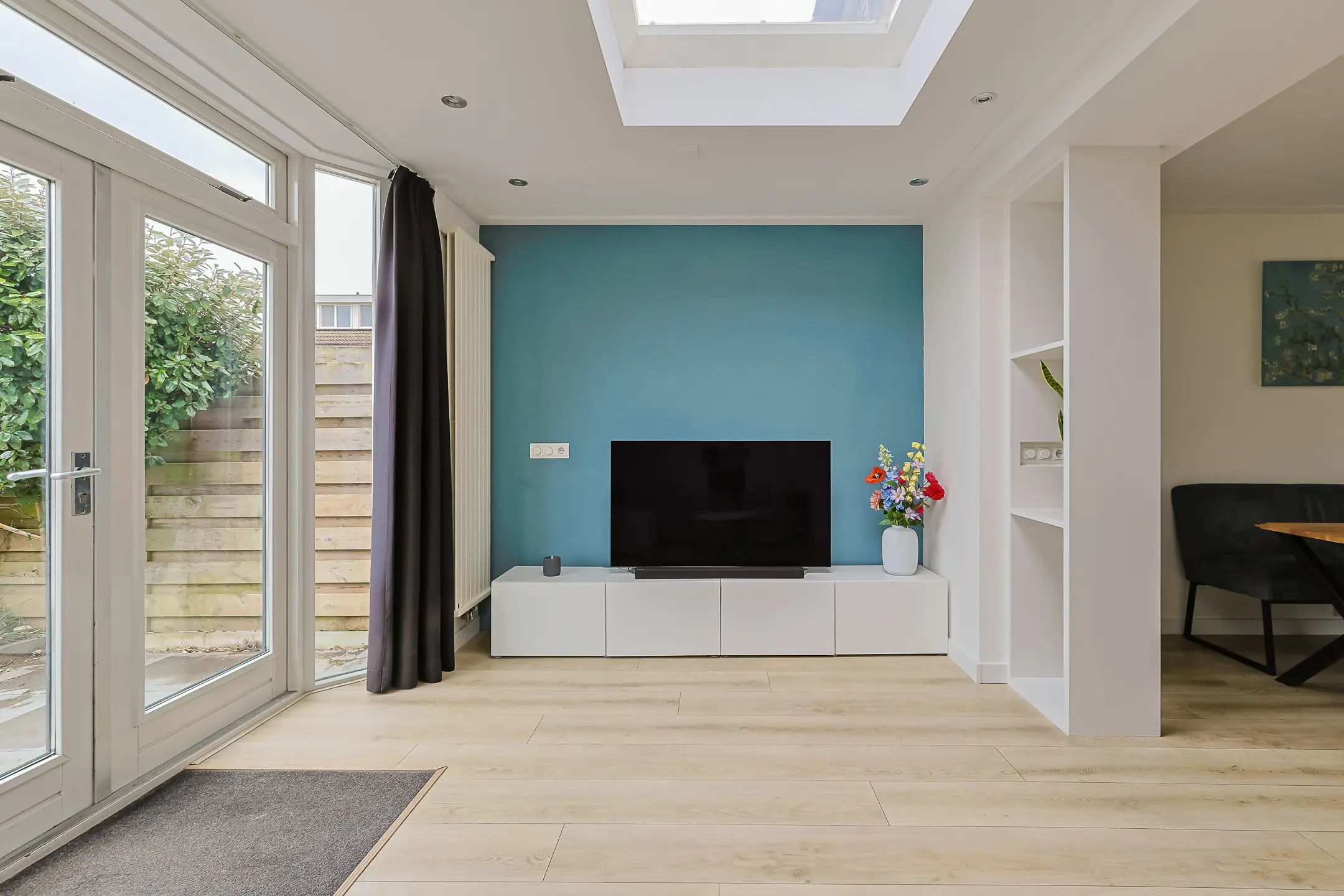 De uitgebouwde achterzijde biedt ruimte aan een knusse zitruimte met openslaande deuren naar de tuin. Binnen en buiten lopen hier naadloos in elkaar over, ideaal voor lange zomeravonden of gezellige etentjes.