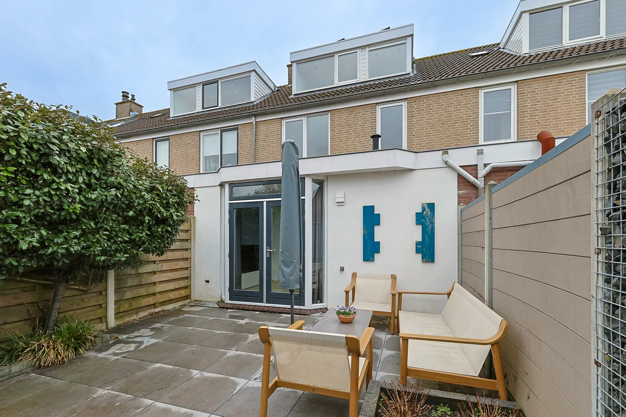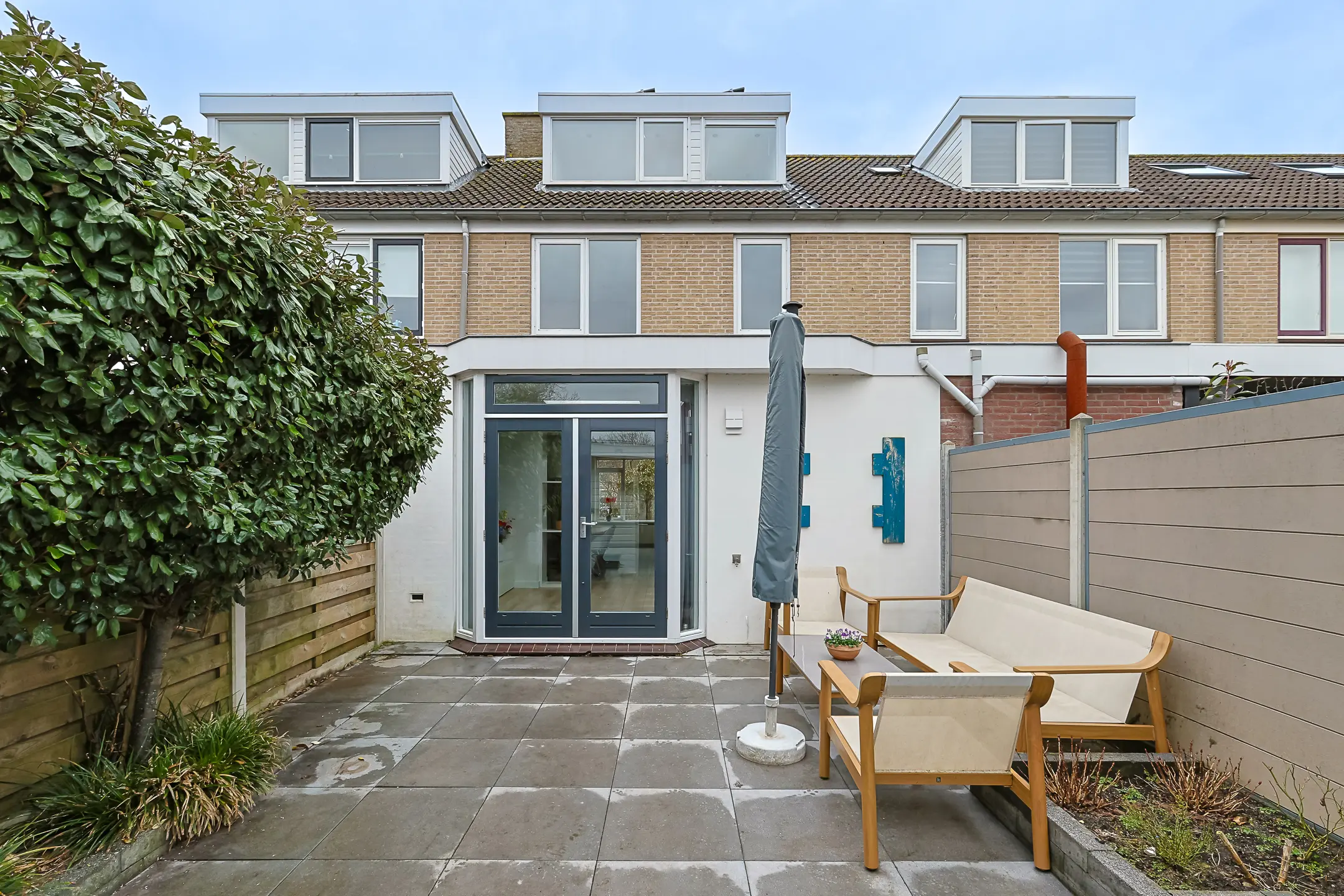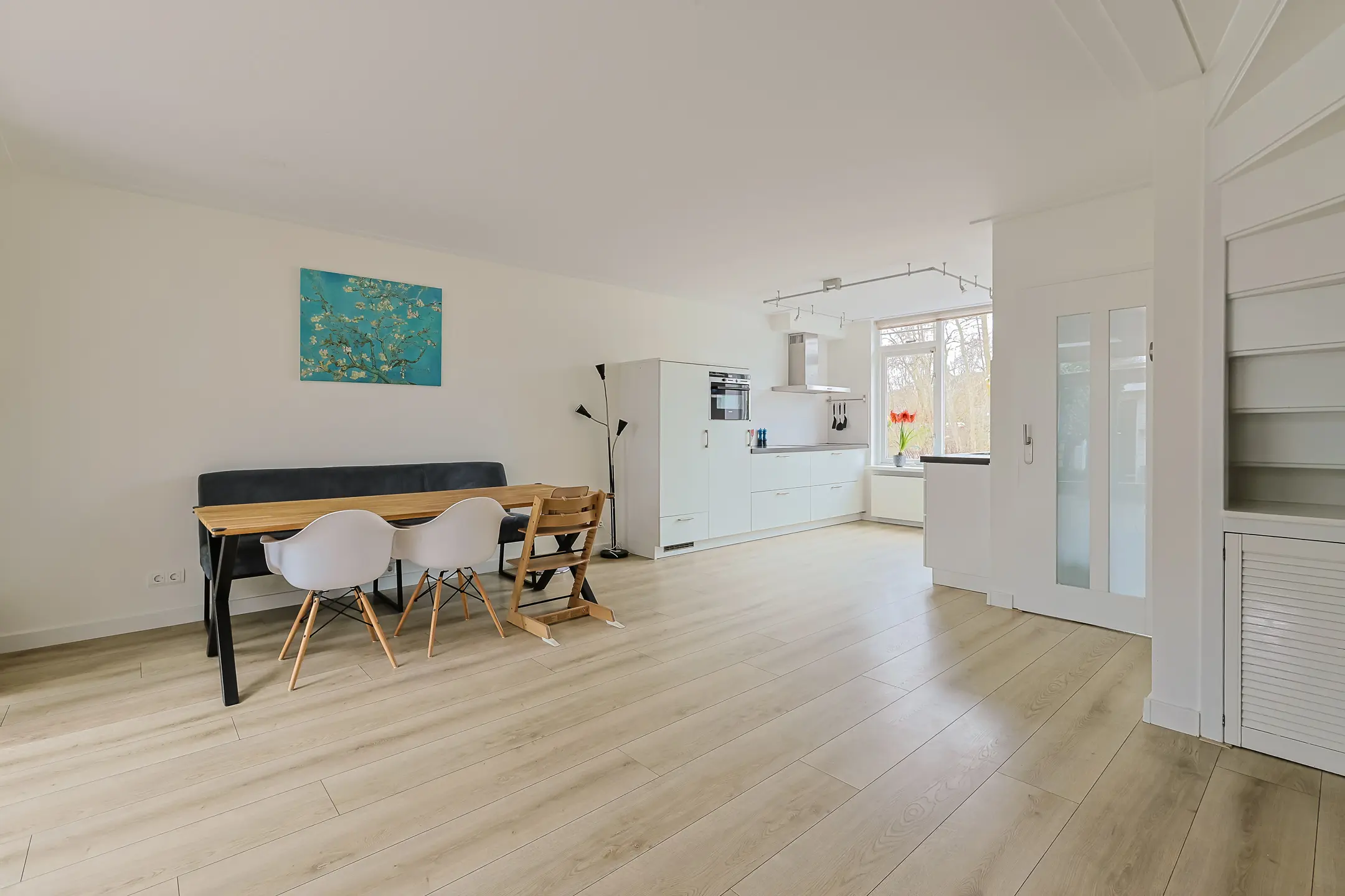 De uitgebouwde achterzijde biedt ruimte aan een knusse zitruimte met openslaande deuren naar de tuin. Binnen en buiten lopen hier naadloos in elkaar over, ideaal voor lange zomeravonden of gezellige etentjes.