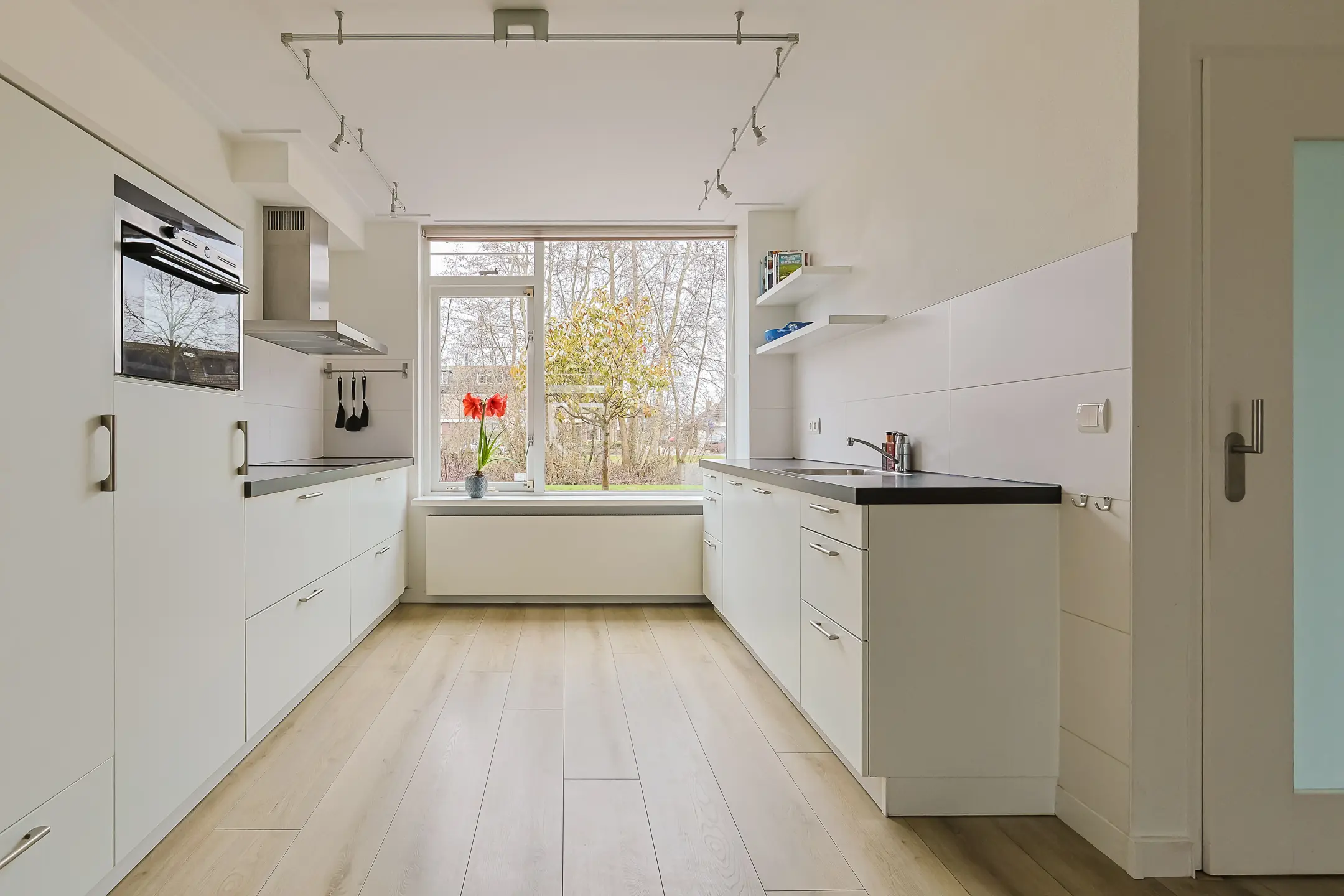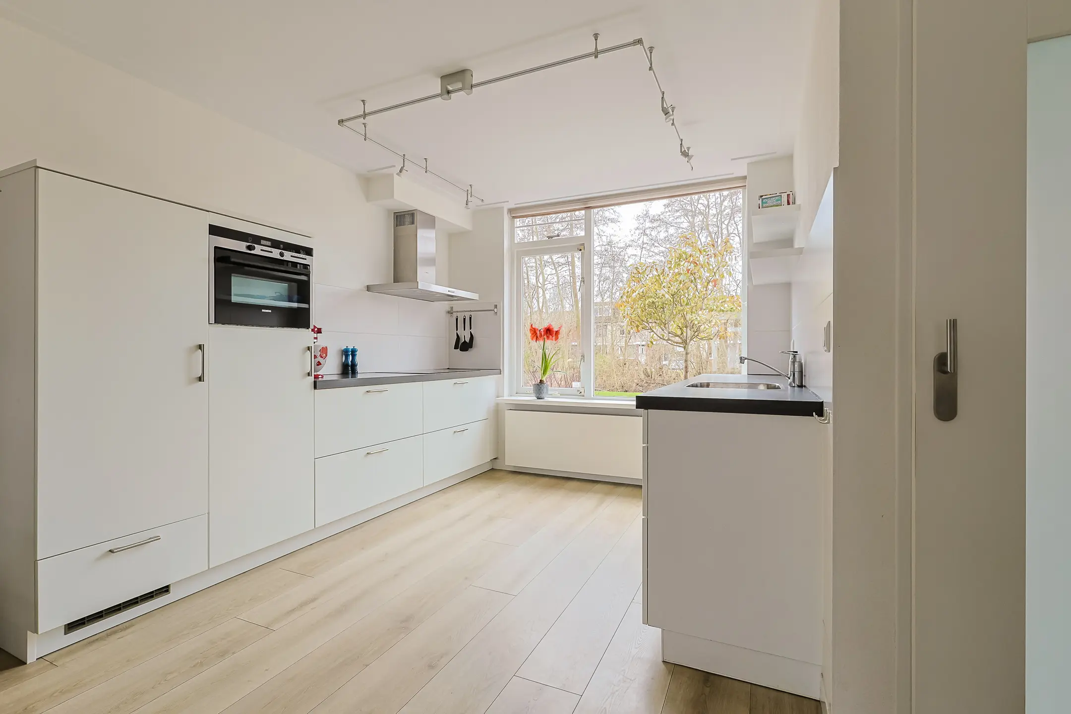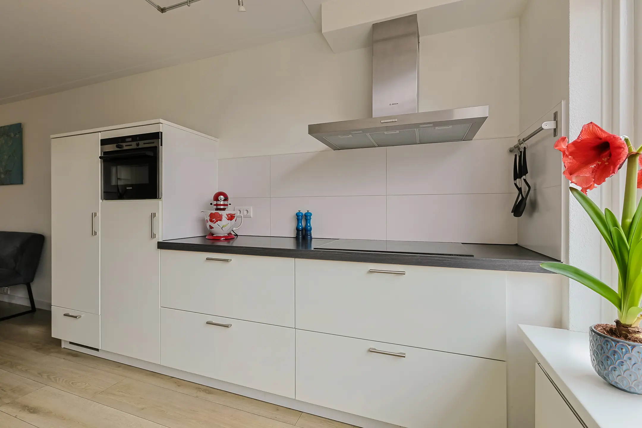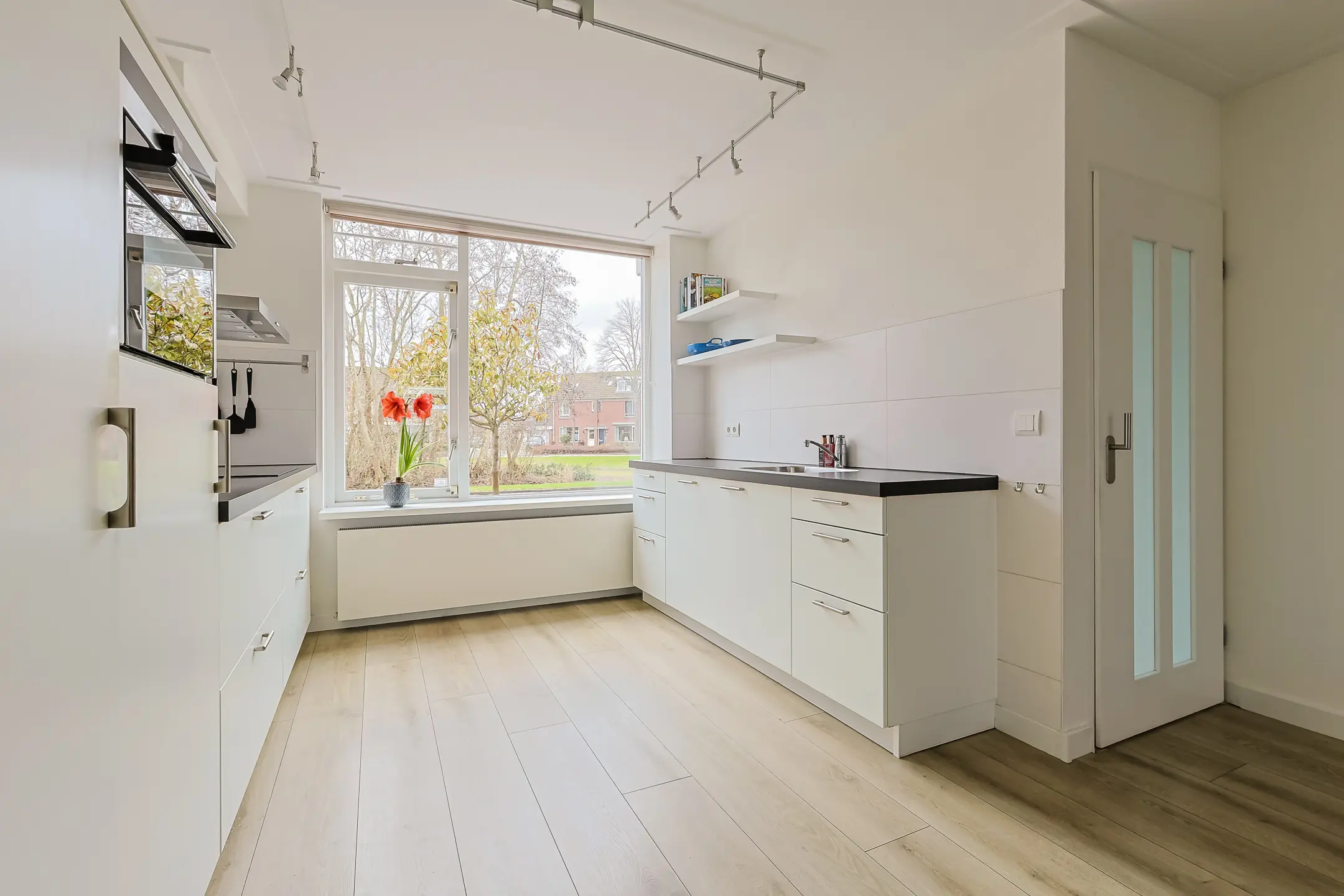 De uitgebouwde achterzijde biedt ruimte aan een knusse zitruimte met openslaande deuren naar de tuin. Binnen en buiten lopen hier naadloos in elkaar over, ideaal voor lange zomeravonden of gezellige etentjes.