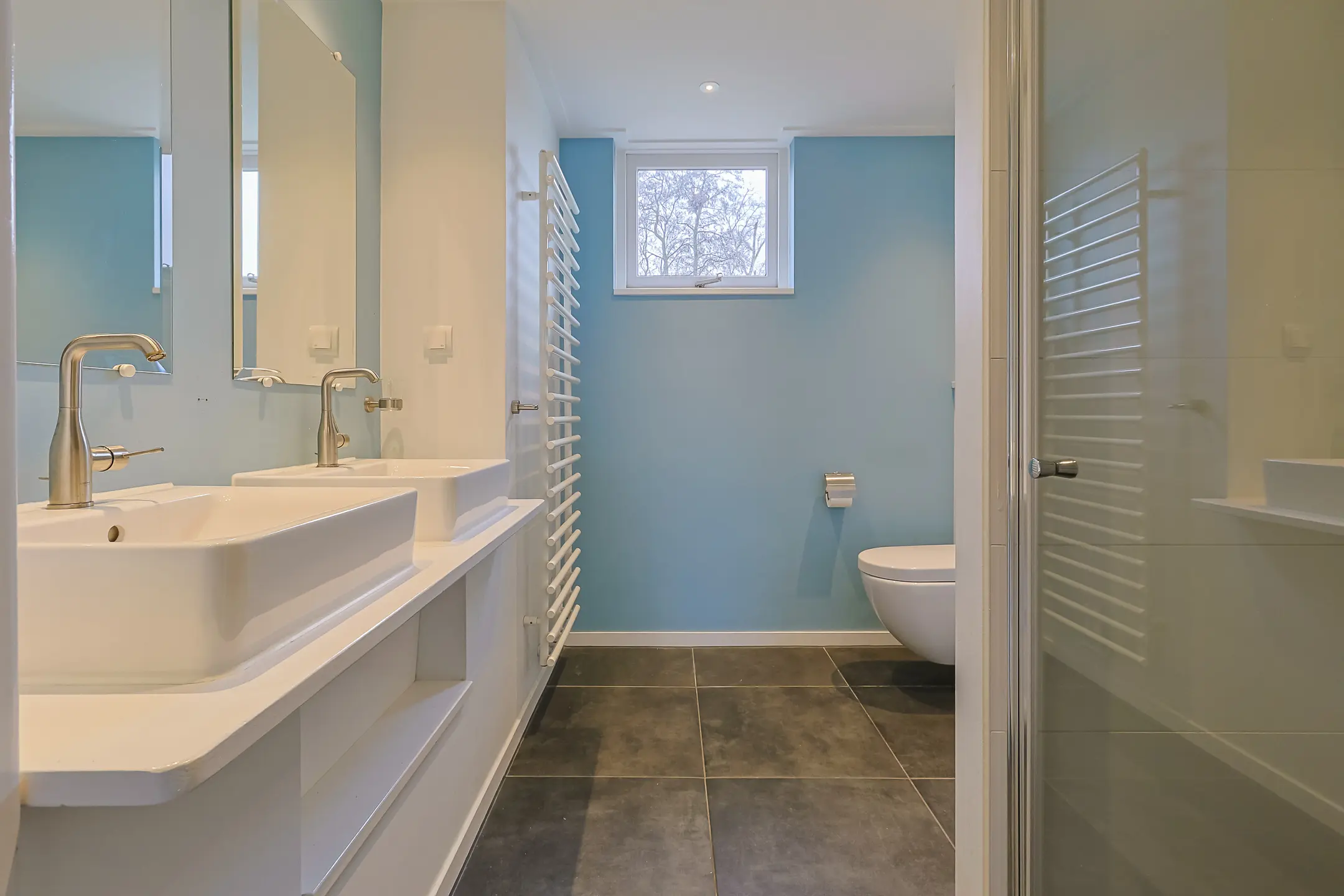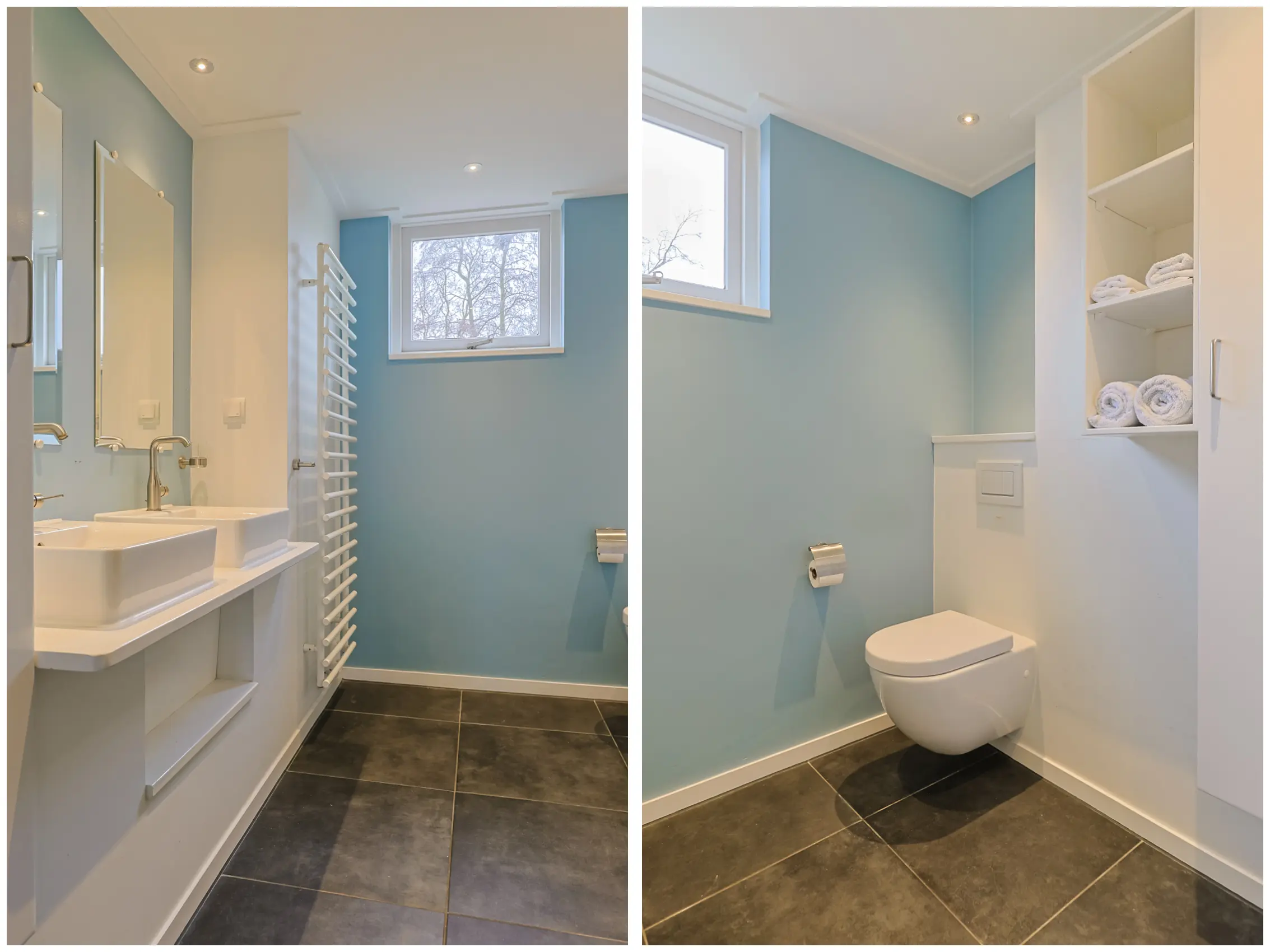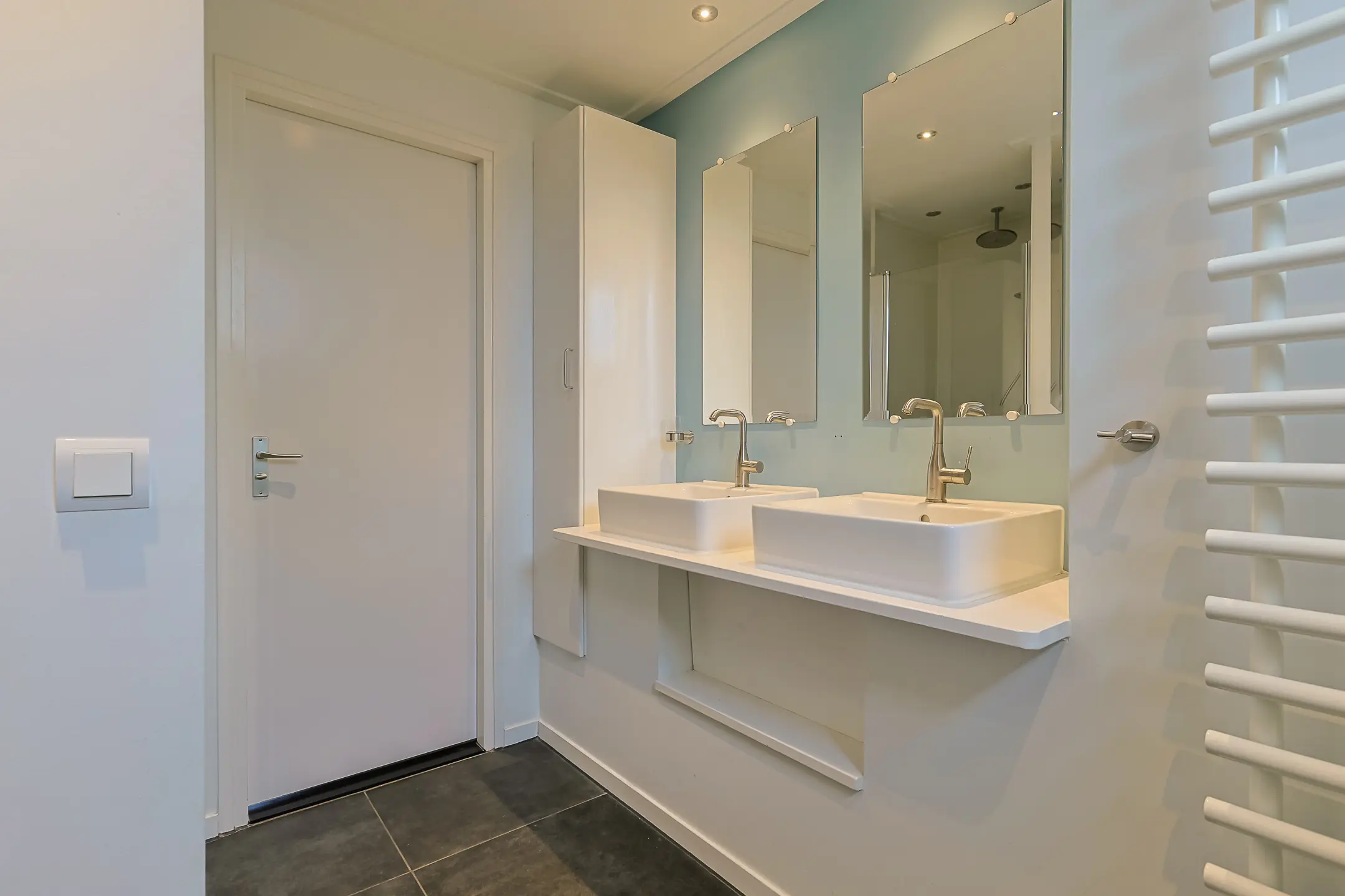 De badkamer (2017) is voorzien van een dubbele wastafel, een ruime inloopdouche met regendouche en handdouche, een toilet en een designradiator. Dit een fijne ruimte om de dag ontspannen te beginnen of af te sluiten.