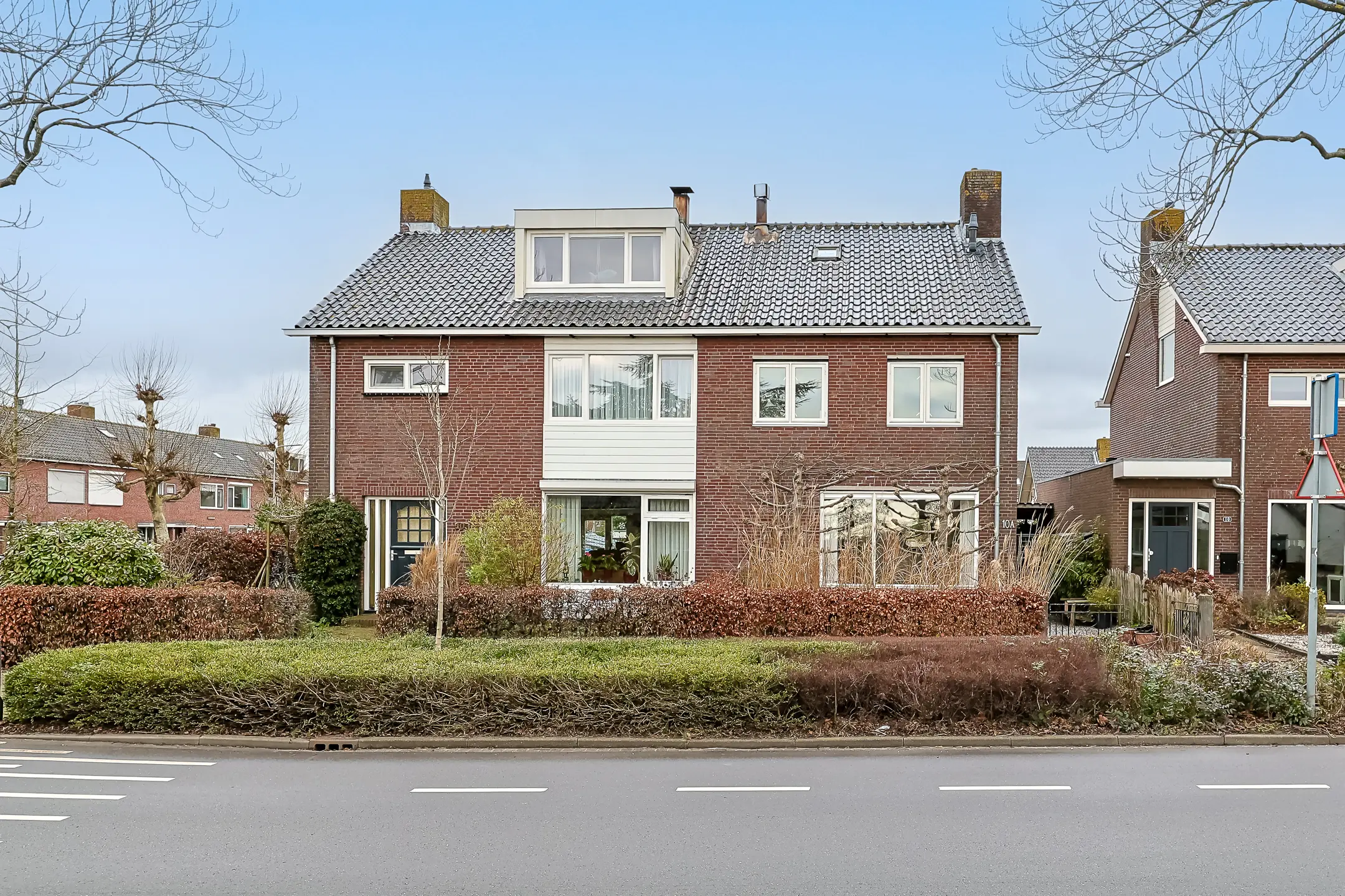 Via de verzorgd aangelegde voortuin met leilinde bomen en een mooie blauwe regen die het geheel een groene en sfeervolle uitstraling geven en een praktische houtopslag bereik je de entree aan de zijkant van de woning.
