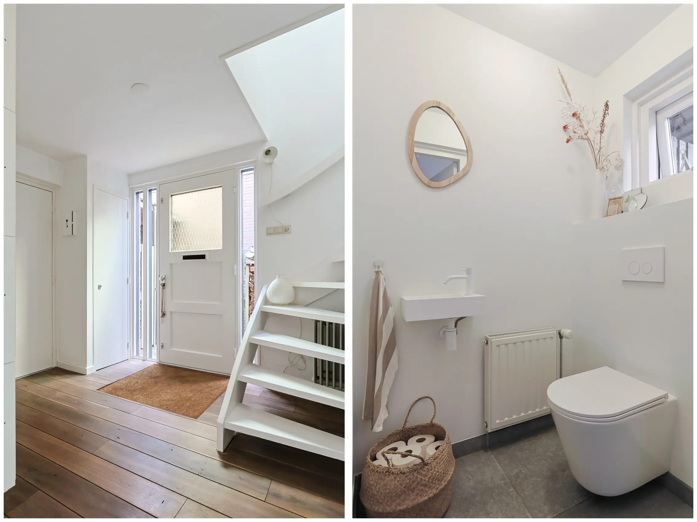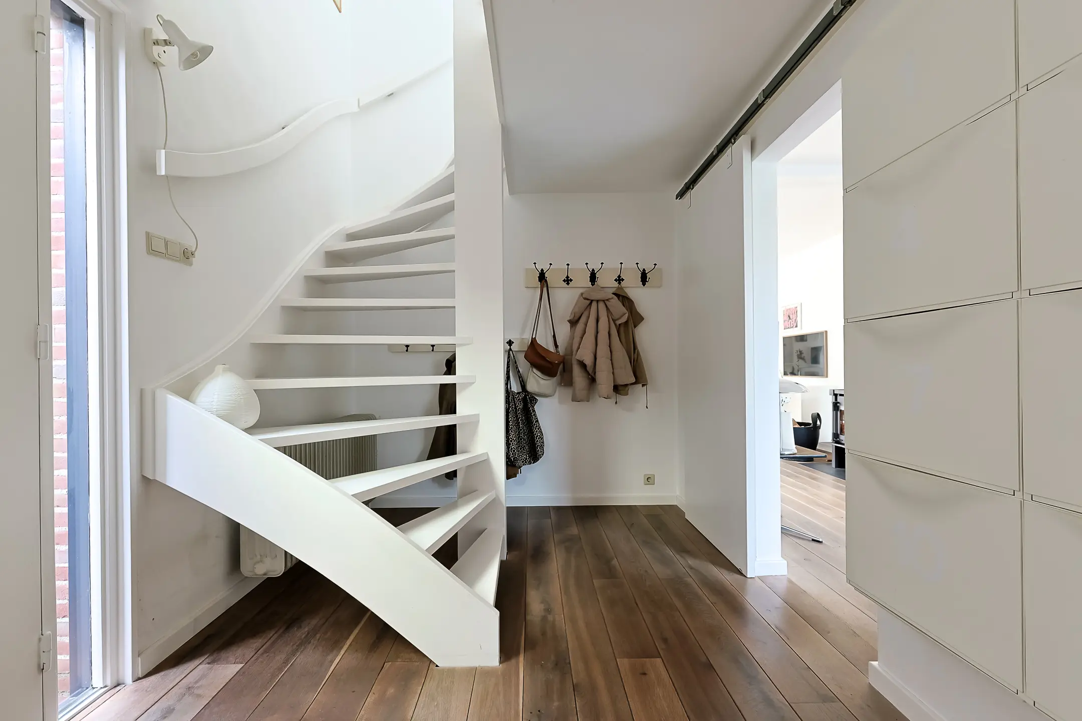 In de ruime hal met trapopgang naar de eerste verdieping vind je het toilet en de doorgang naar de bijkeuken met wasmachine-aansluiting, spoelbak en extra kastruimte. Deze ruimte geeft ook toegang tot de achtertuin.
