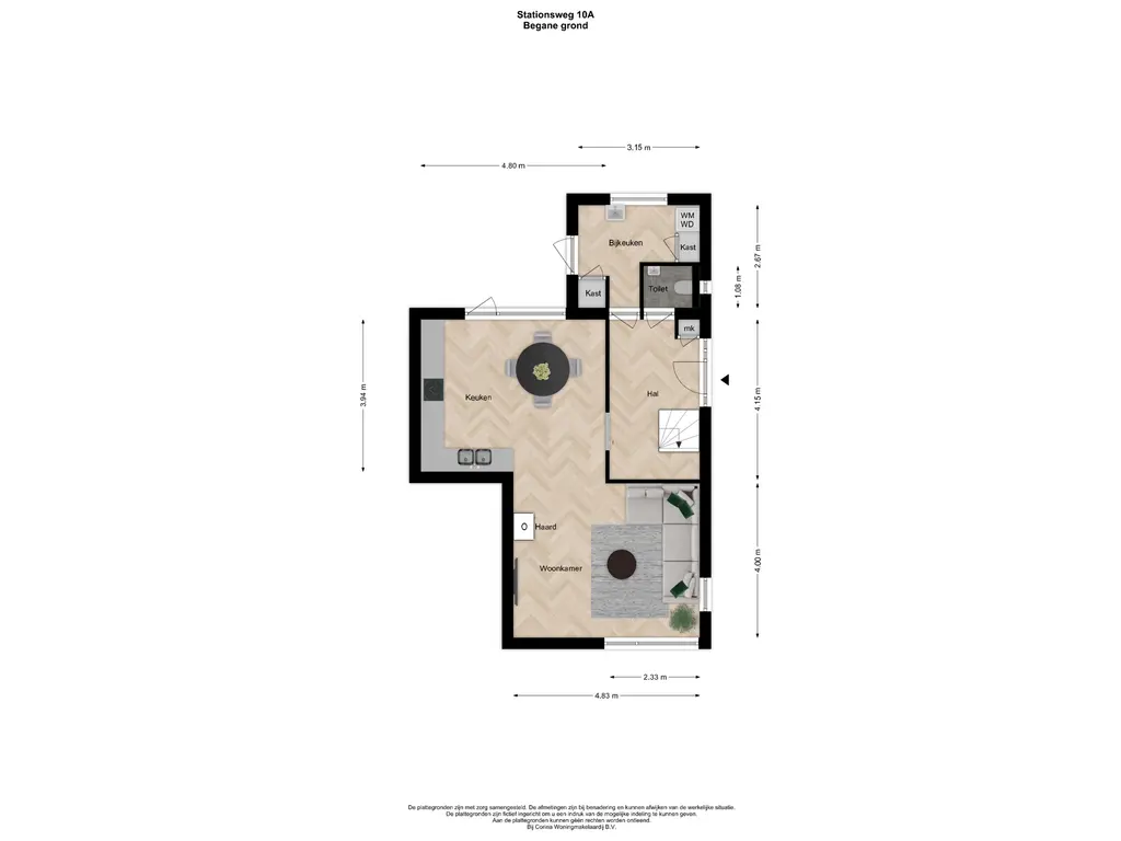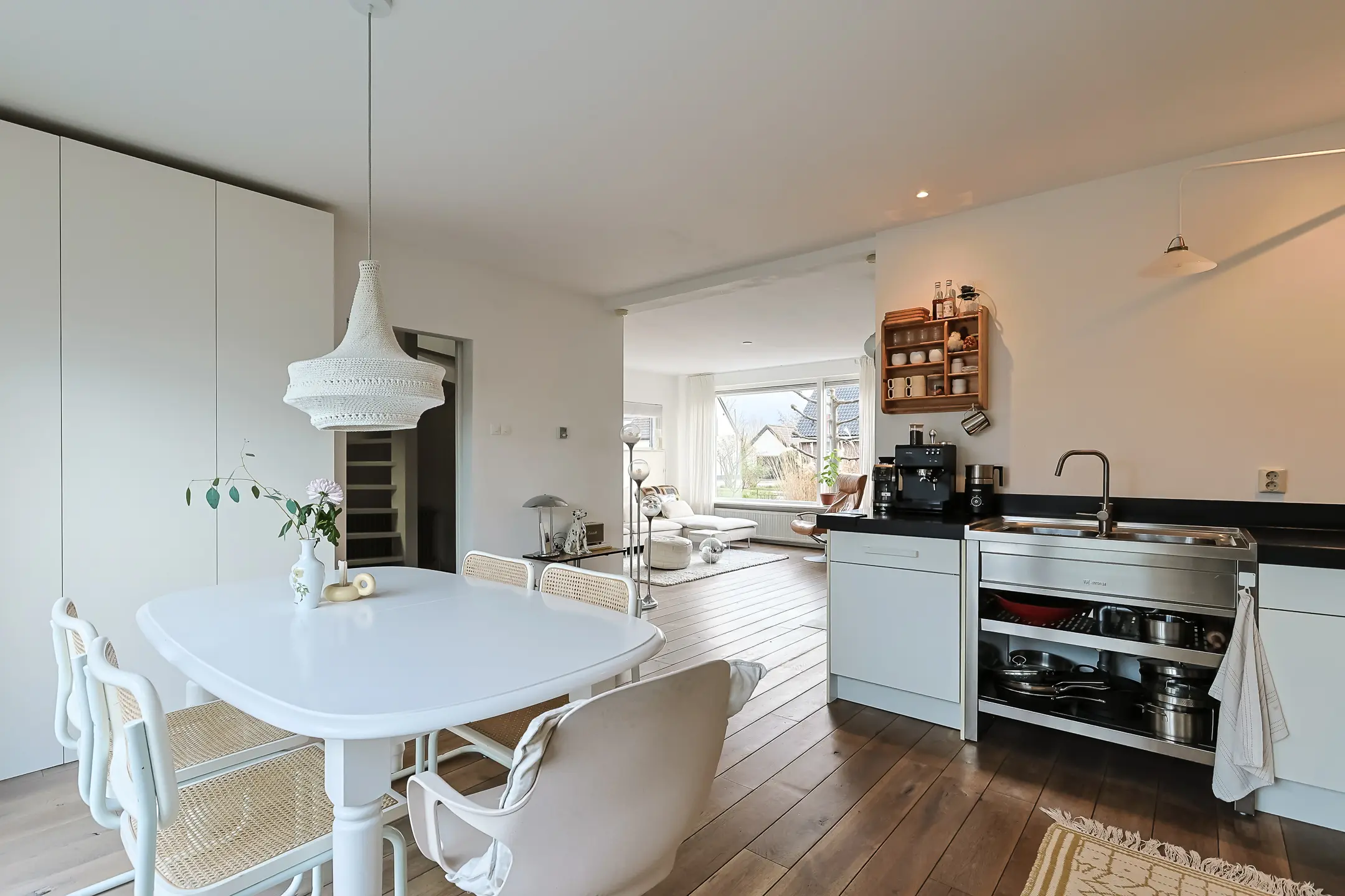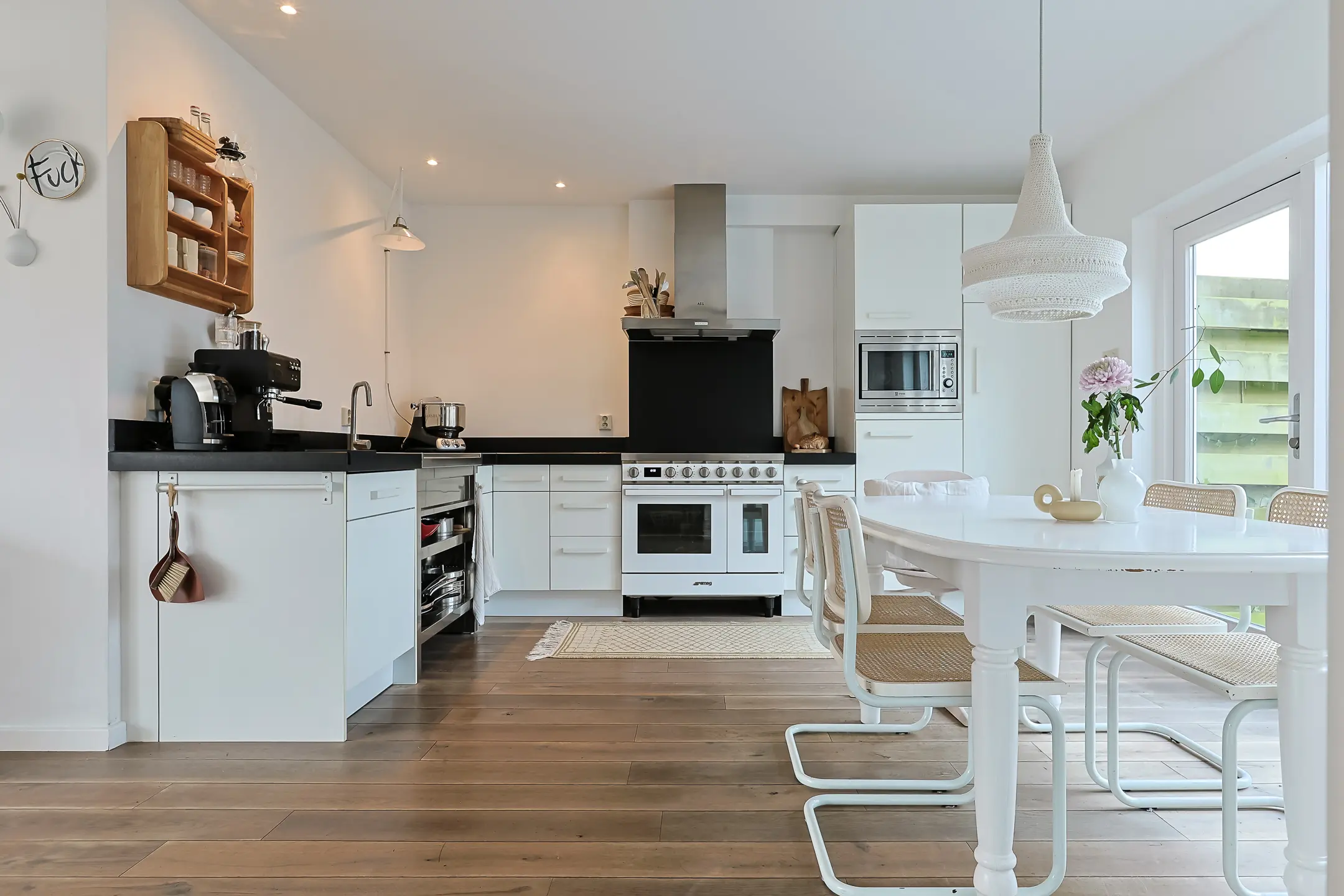De woonkamer ligt aan de voorzijde en voelt direct sfeervol aan dankzij de houtkachel (ter overname). Aan de achterzijde bevindt zich de woonkeuken, met een groot raam tot aan de vloer en een deur naar het terras. De keuken is ingericht met lichte fronten en een donker stenen werkblad. Voorzien van een groot SMEG kookfornuis, combi-oven, vaatwasser, dubbele spoelbak en koelkast; ideaal voor wie graag kookt. De gehele begane grond is afgewerkt met een massief eikenhout vloer, lichte wanden en plafonds.
