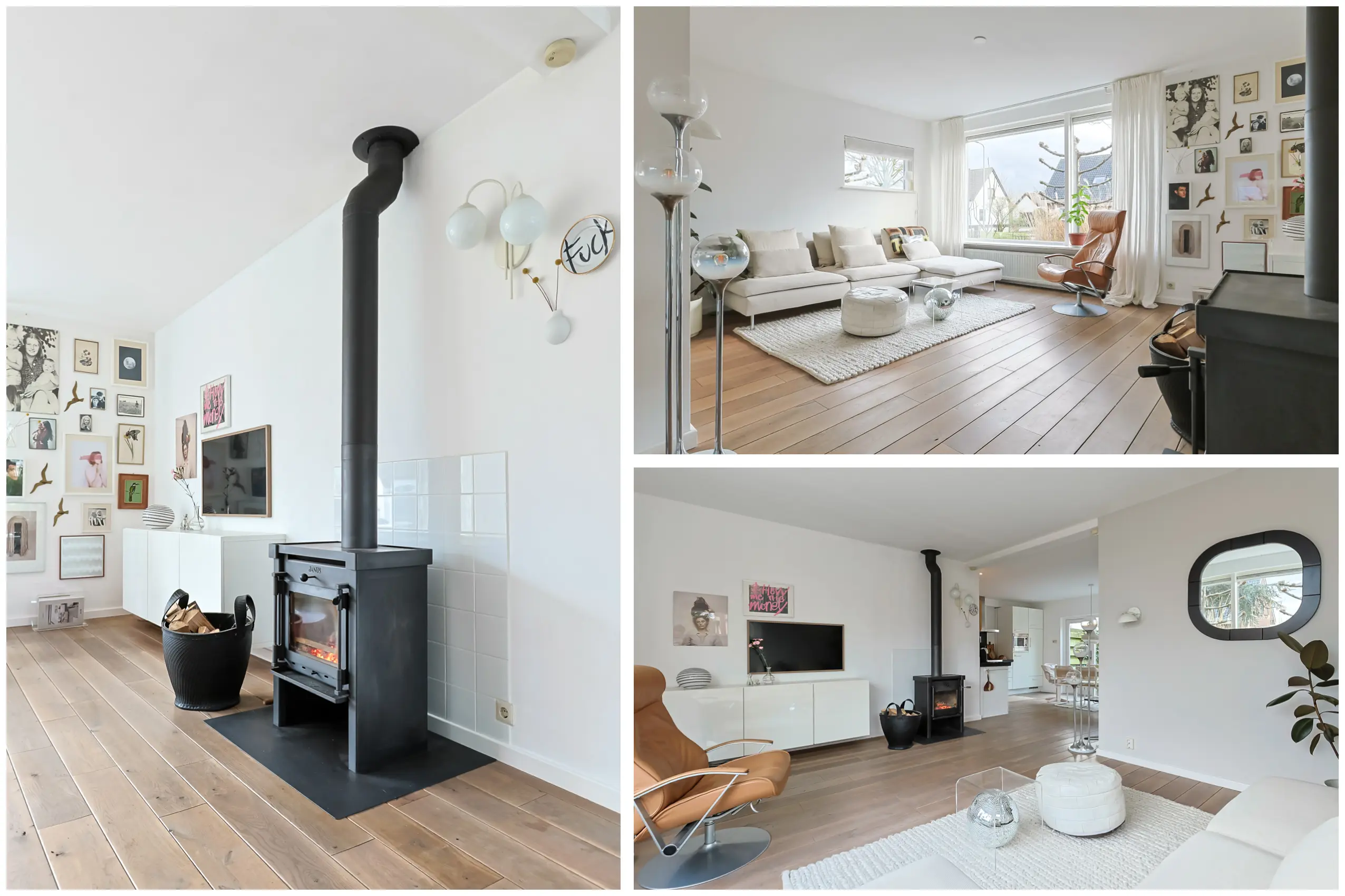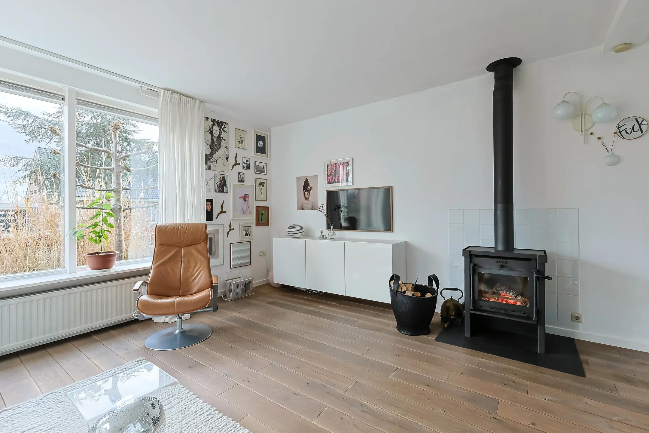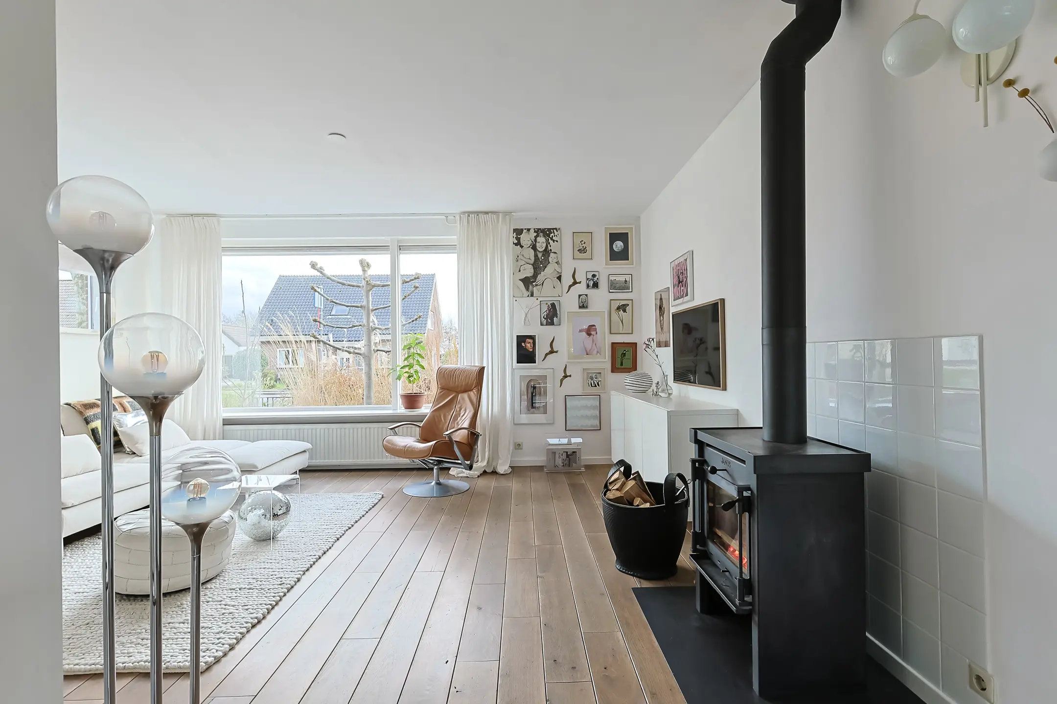 - lichte woonkamer met sfeervolle houtkachel