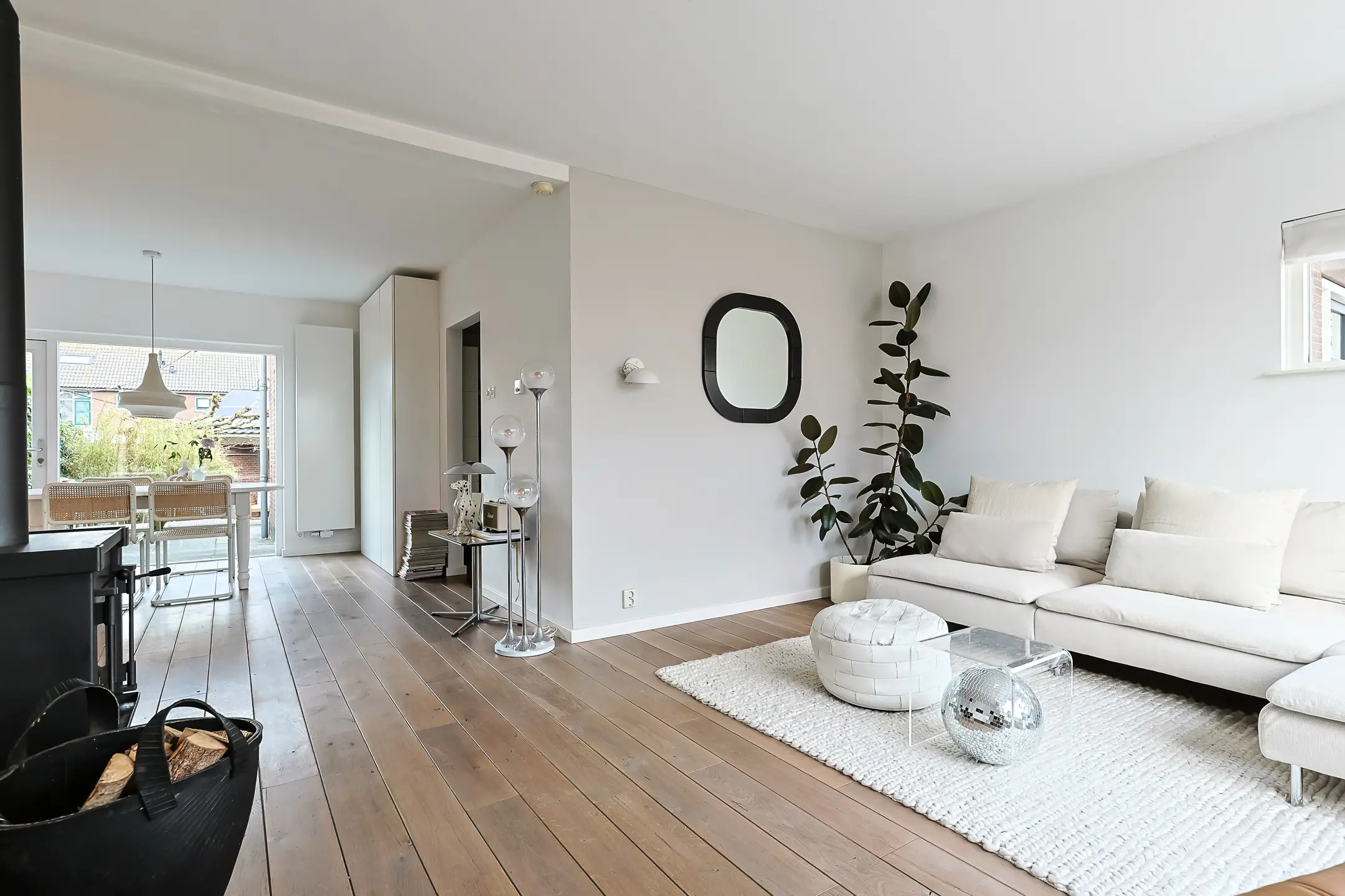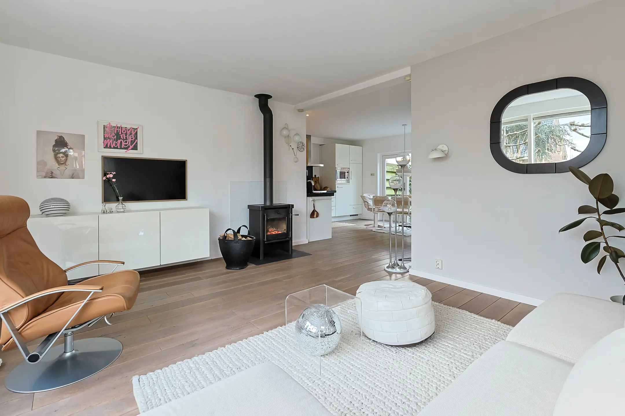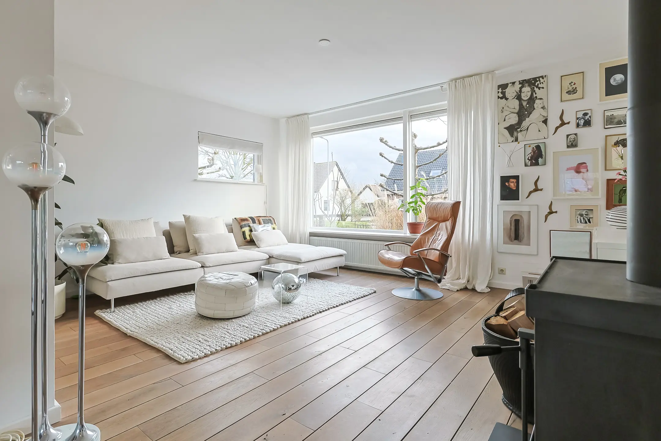 - lichte woonkamer met sfeervolle houtkachel