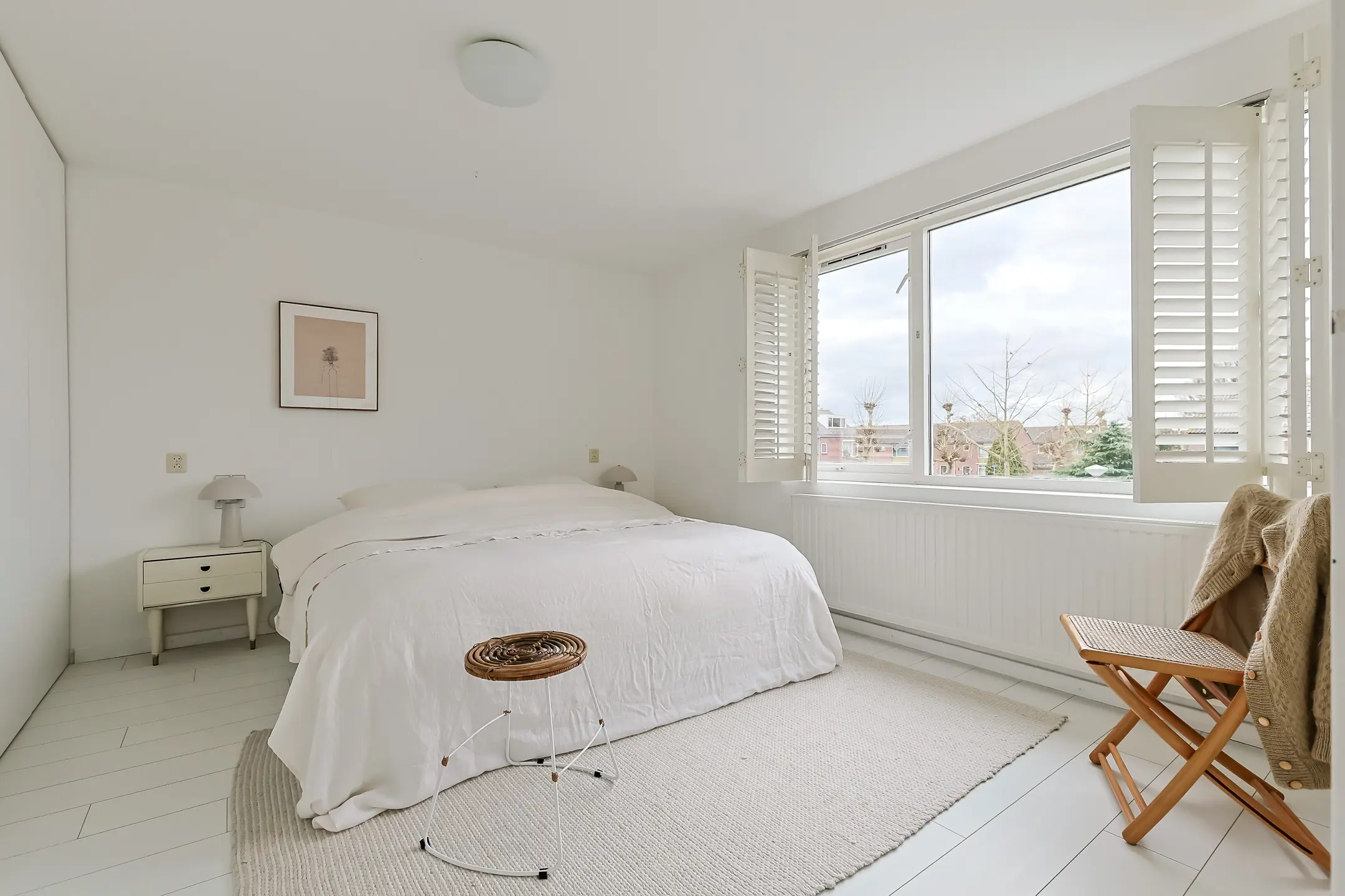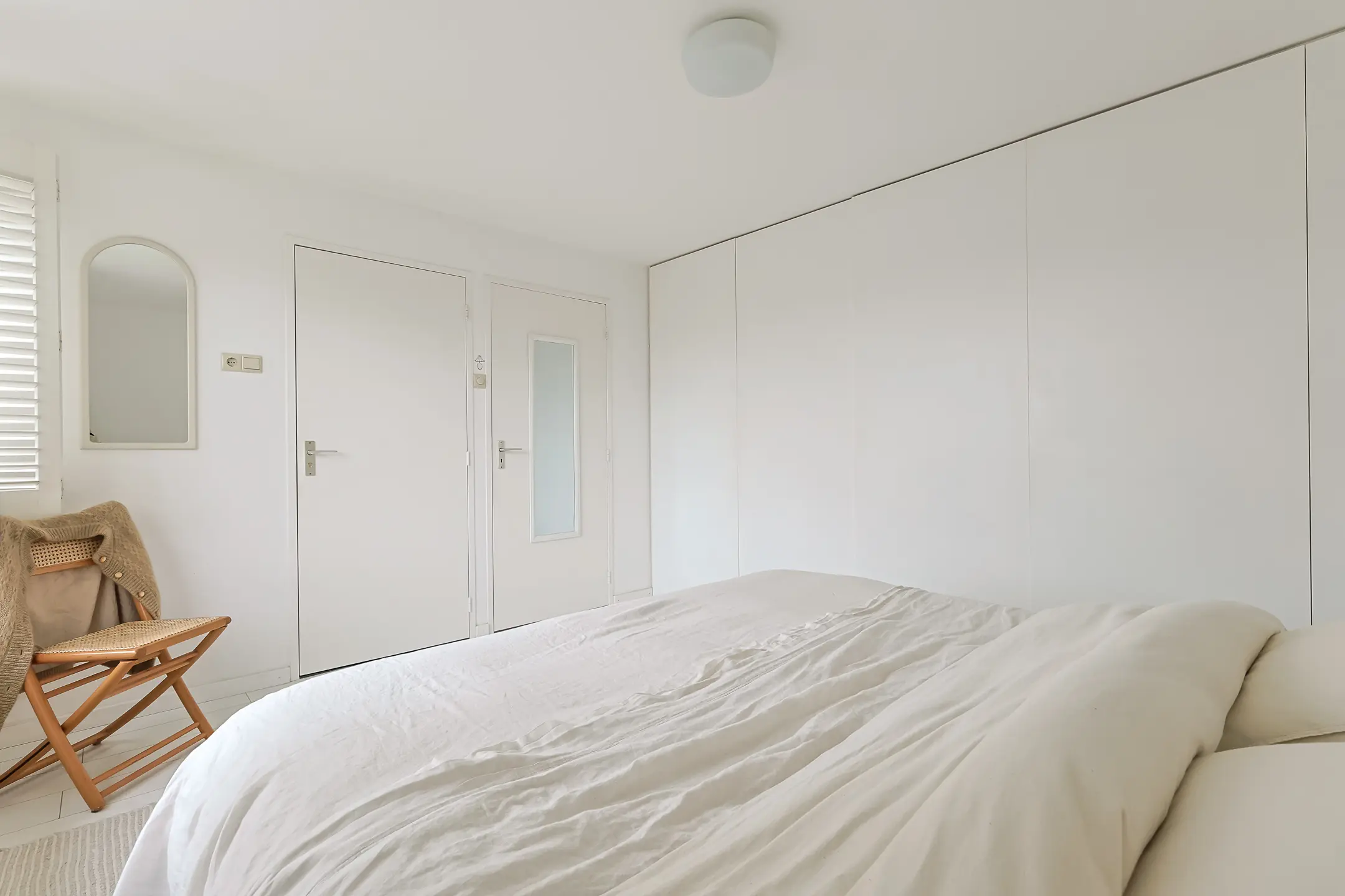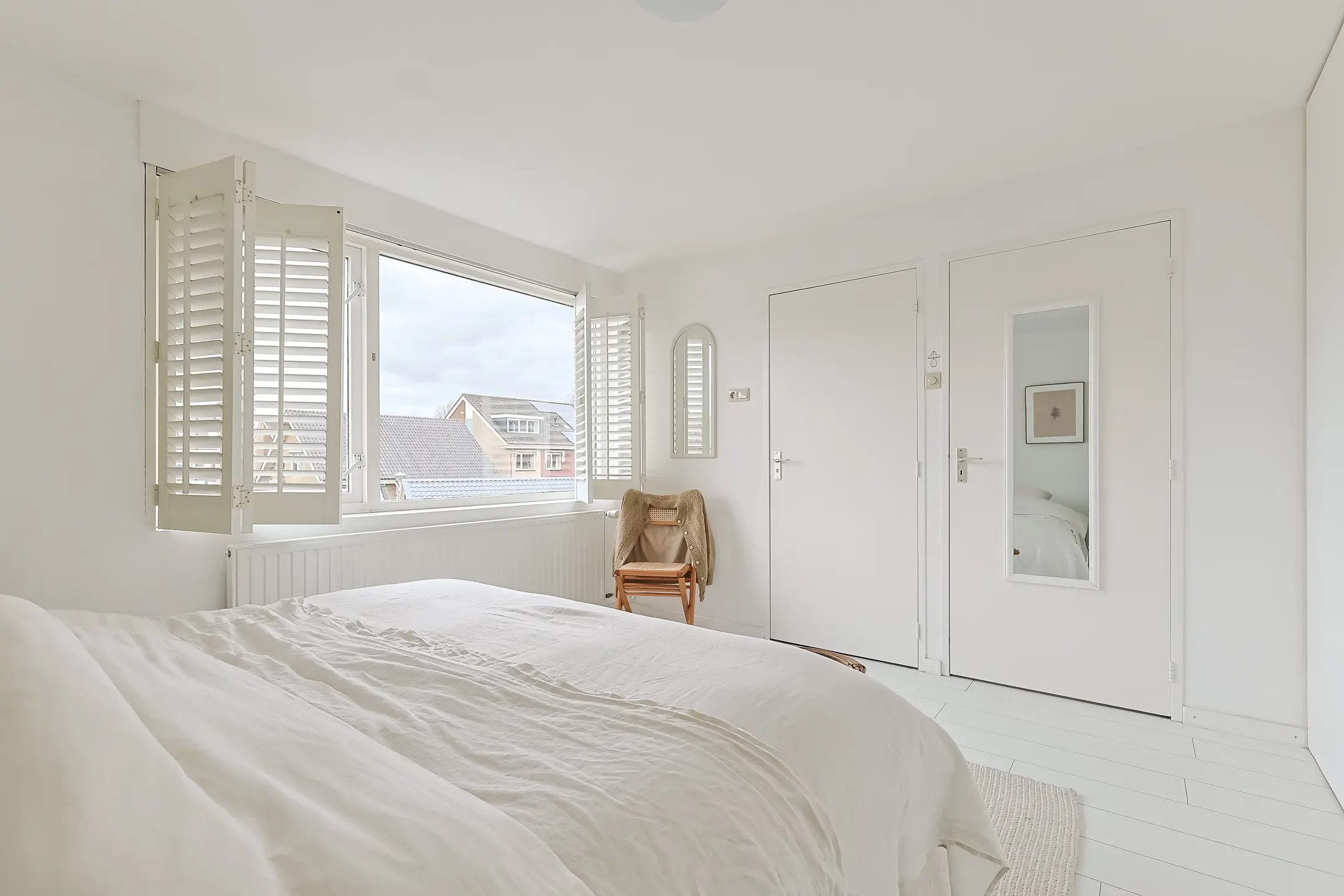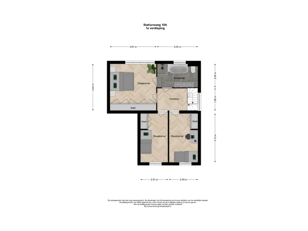 De overloop is voorzien van een zijraam en een witte laminaatvloer. Aan de achterzijde ligt de royale ouderslaapkamer van ca. 3.91 m x 3.44 m. met vaste kasten en shutters (die achterblijven). Vanuit deze kamer is er direct toegang tot de badkamer. Aan de voorzijde zijn nog twee slaapkamers van ca. 3.91 m x 3.44 m., beide met vaste kastruimte.