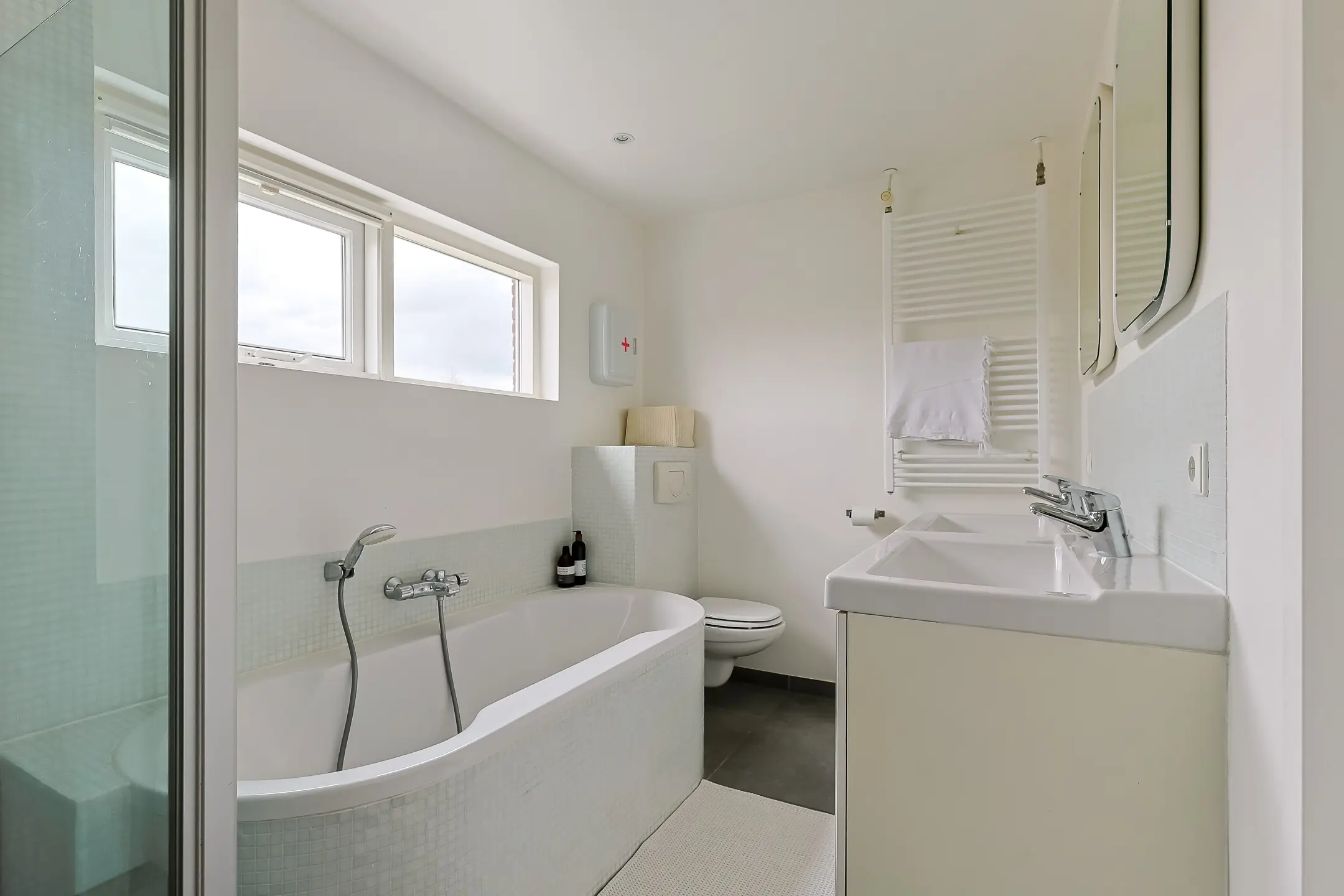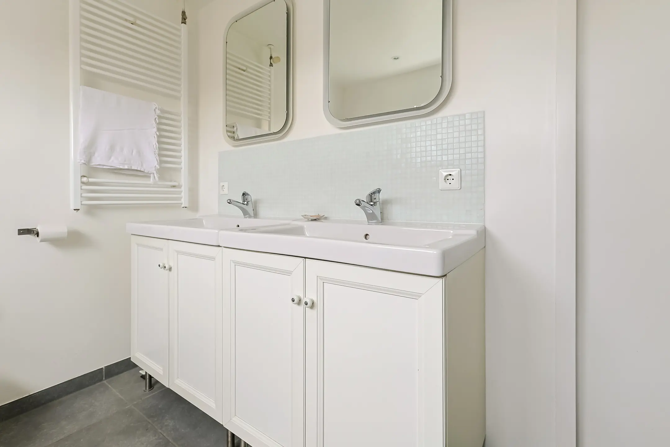 De badkamer is zowel via de overloop als via de ouderslaapkamer bereikbaar. De ruimte is praktisch en comfortabel ingericht met een ligbad, inloopdouche, dubbele wastafel, tweede toilet en handdoekradiator. Afgewerkt met een donkere vloer, lichte betegeling en strakke wandafwerking.