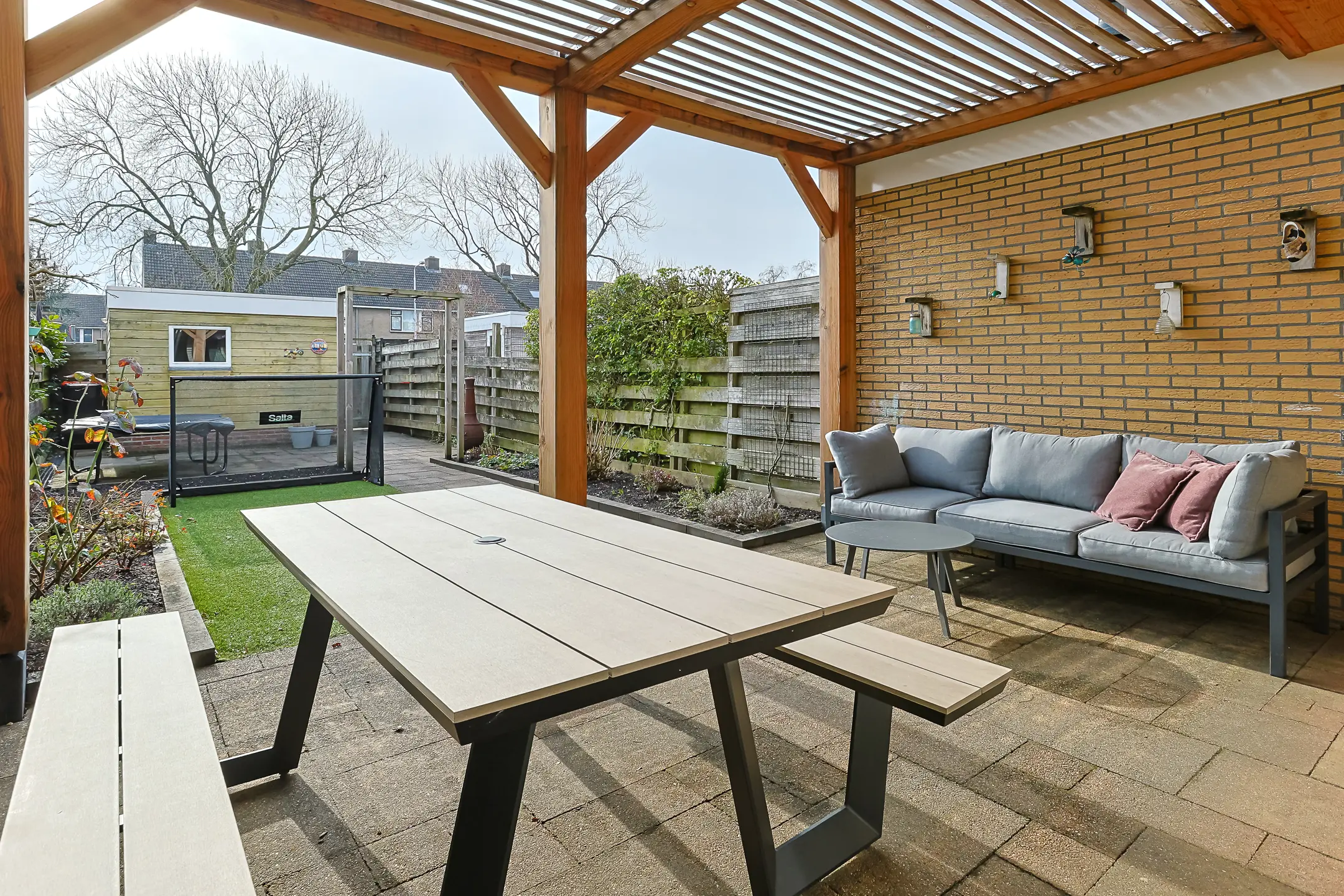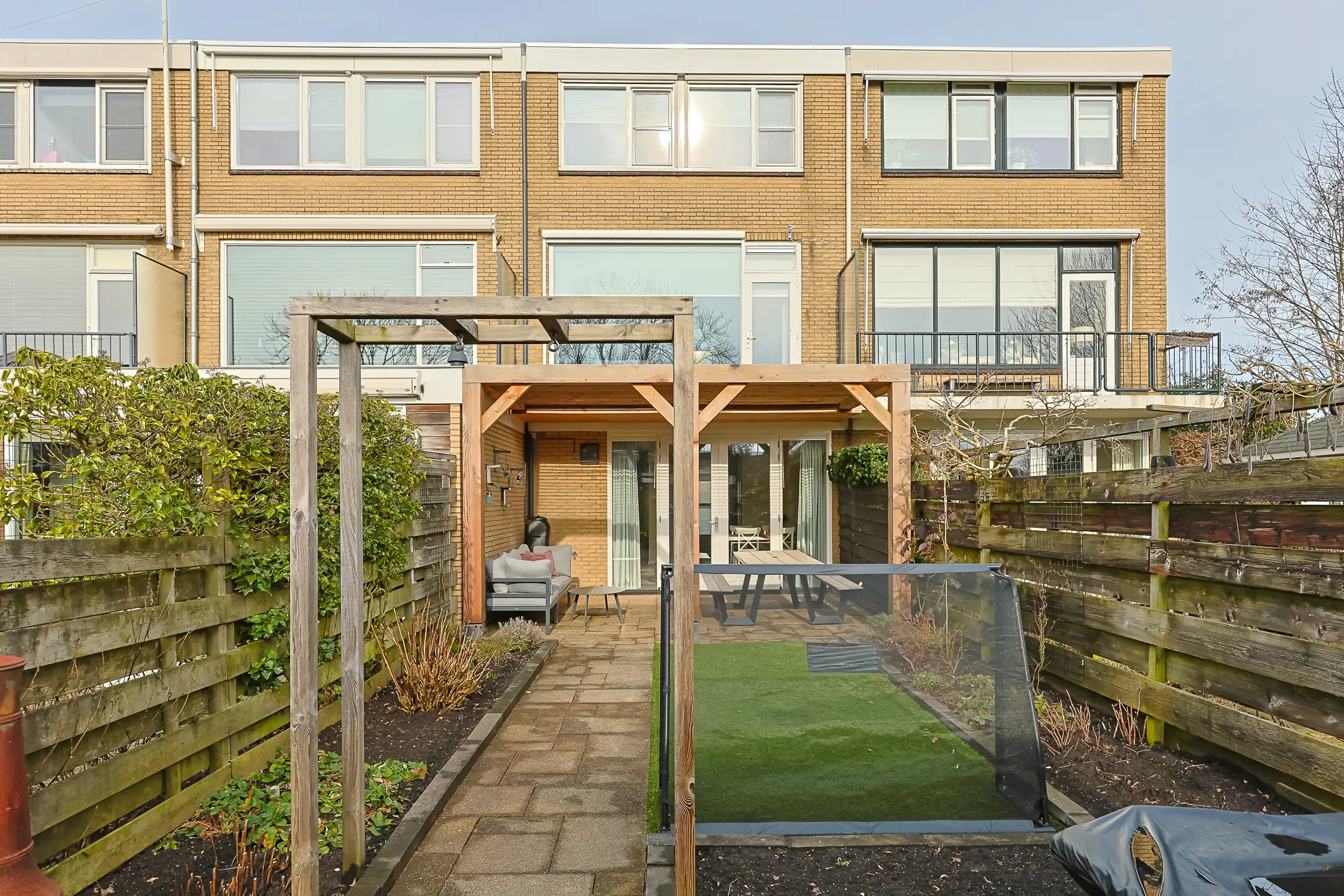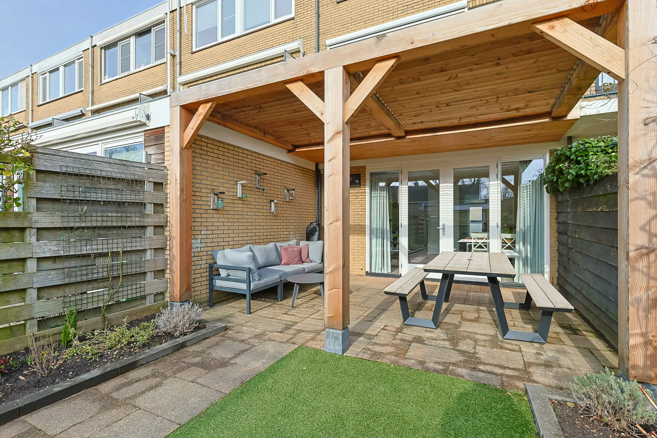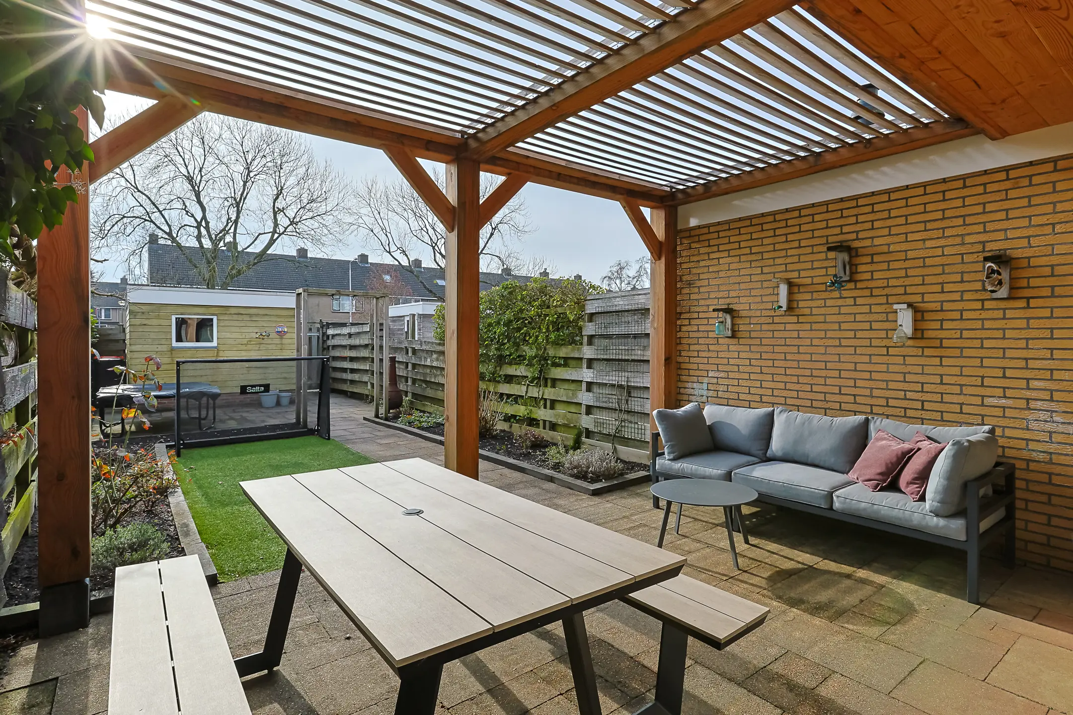 De achtertuin is met een lengte van circa 16,5 meter een absoluut pluspunt. Direct achter de woning bevindt zich een fijne overkapping waar je beschut kunt zitten. De tuin is verzorgd aangelegd met plantenborders, een gazon en een extra terras aan de achterzijde. Door de ligging op het zuidoosten en de royale diepte is er altijd wel een plek in de zon of juist in de schaduw te vinden. Een achterom en een houten berging maken het geheel compleet.