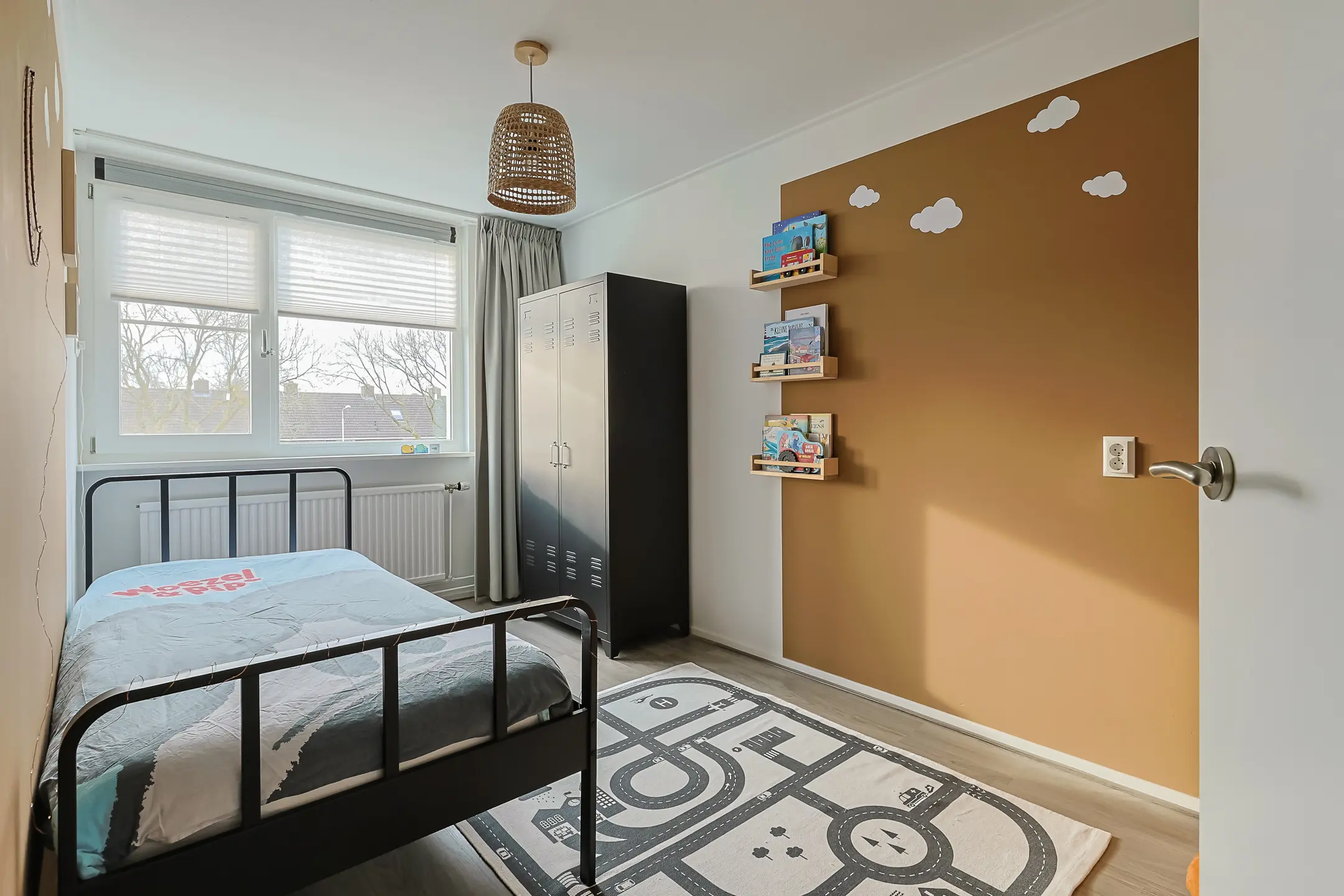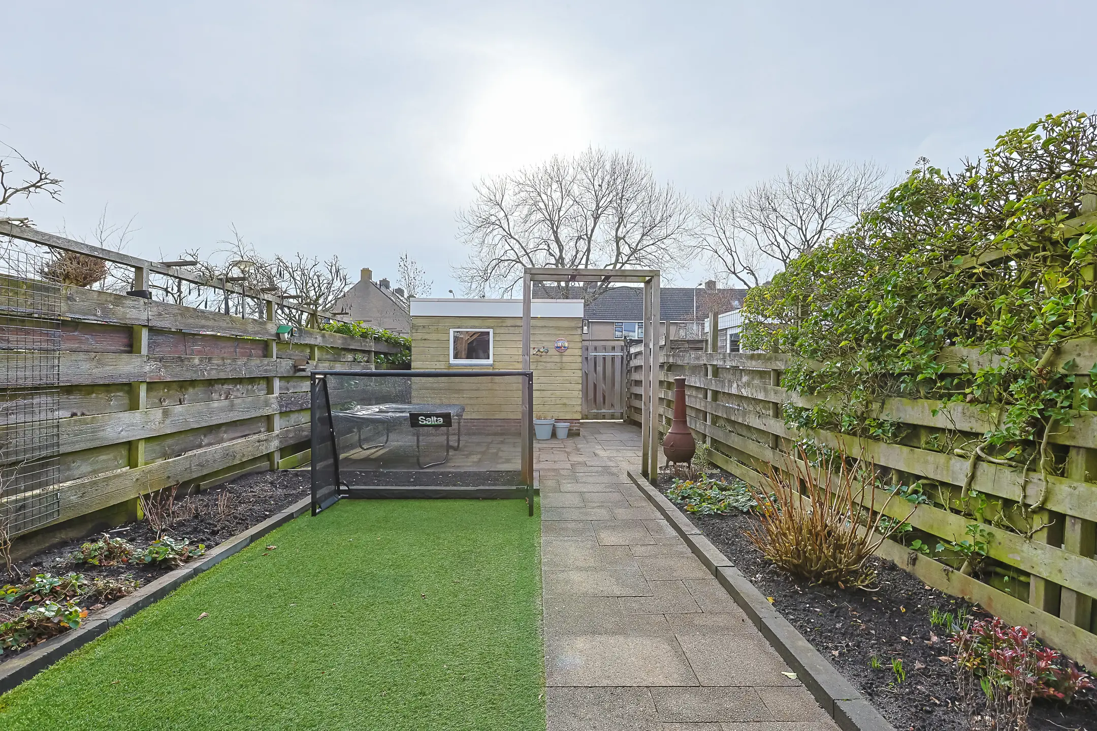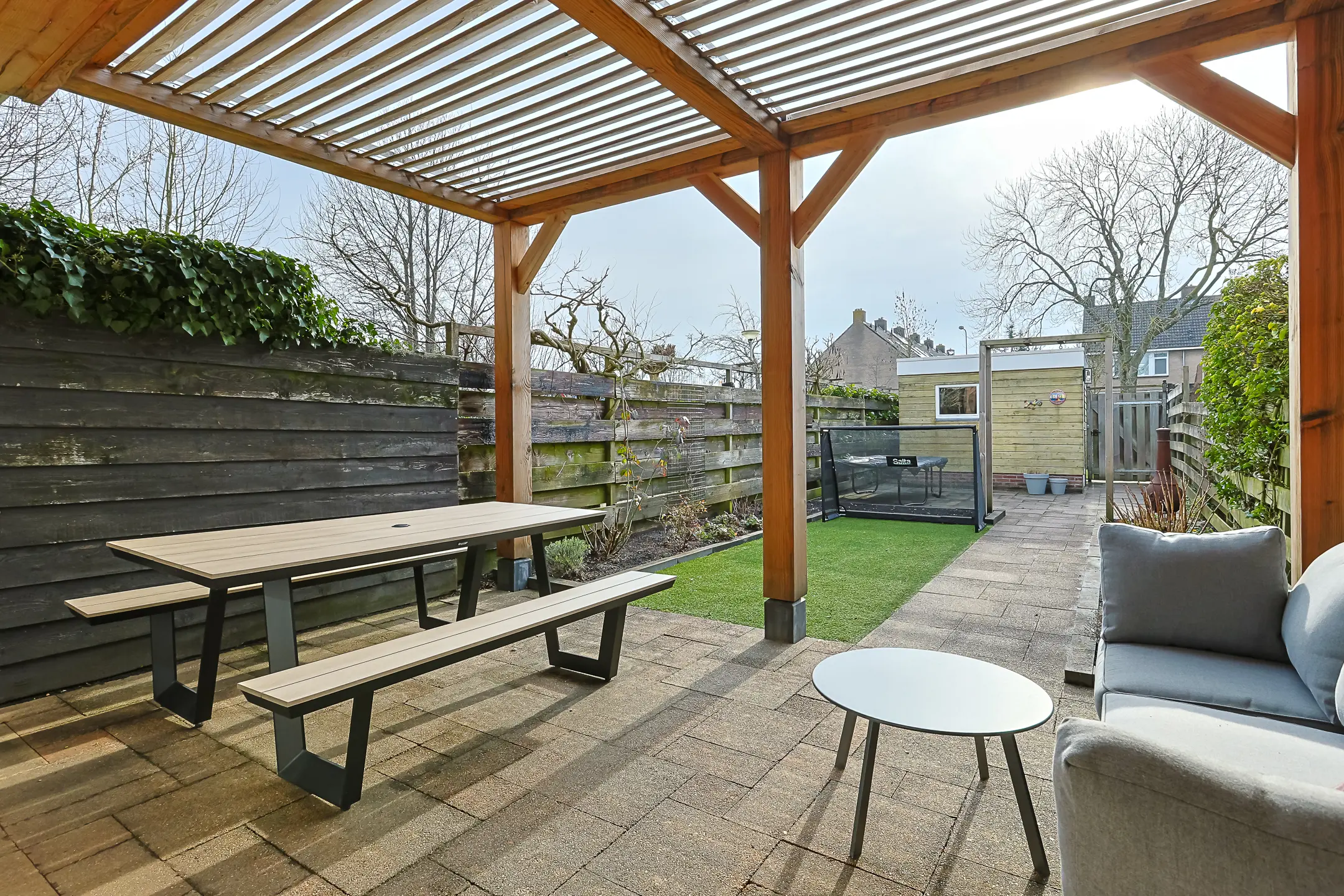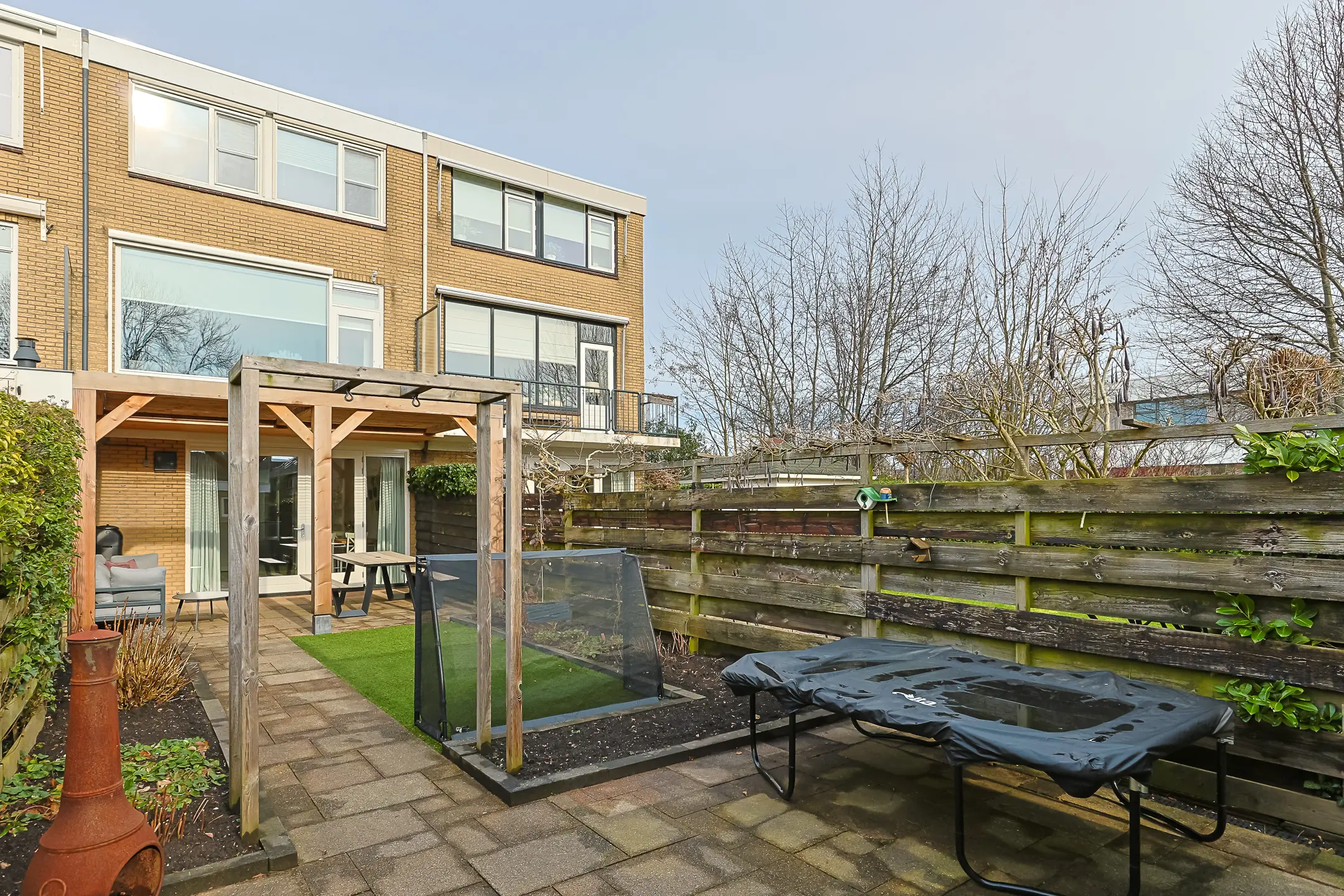 De achtertuin is met een lengte van circa 16,5 meter een absoluut pluspunt. Direct achter de woning bevindt zich een fijne overkapping waar je beschut kunt zitten. De tuin is verzorgd aangelegd met plantenborders, een gazon en een extra terras aan de achterzijde. Door de ligging op het zuidoosten en de royale diepte is er altijd wel een plek in de zon of juist in de schaduw te vinden. Een achterom en een houten berging maken het geheel compleet.