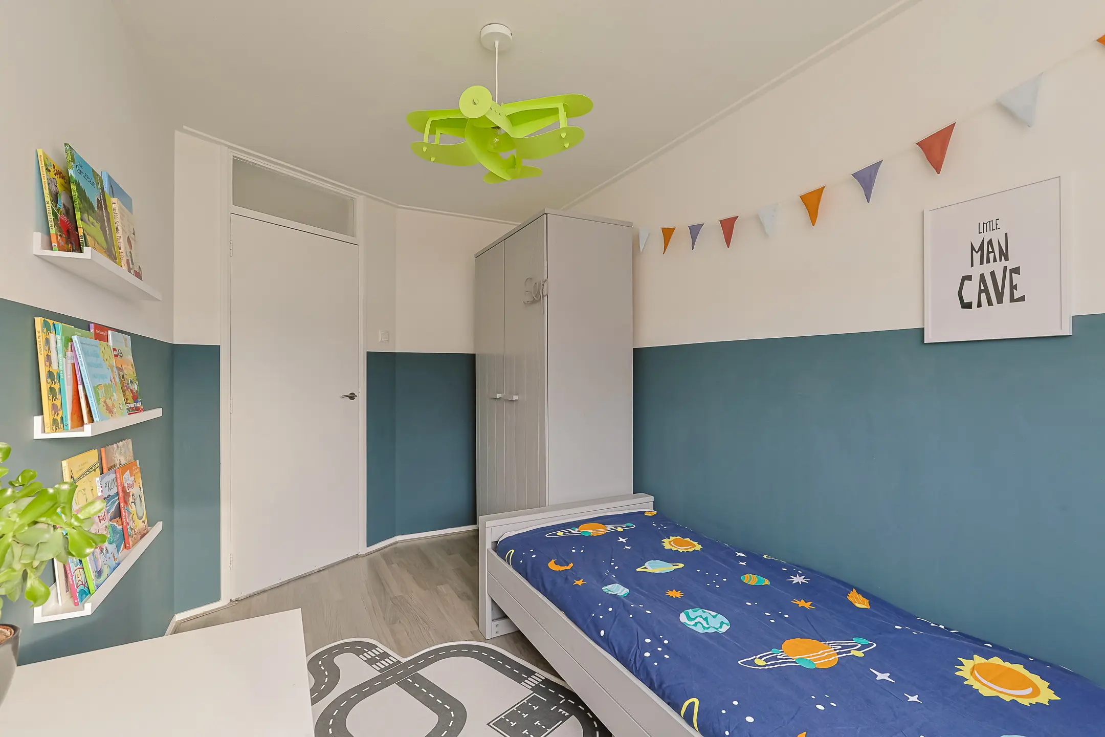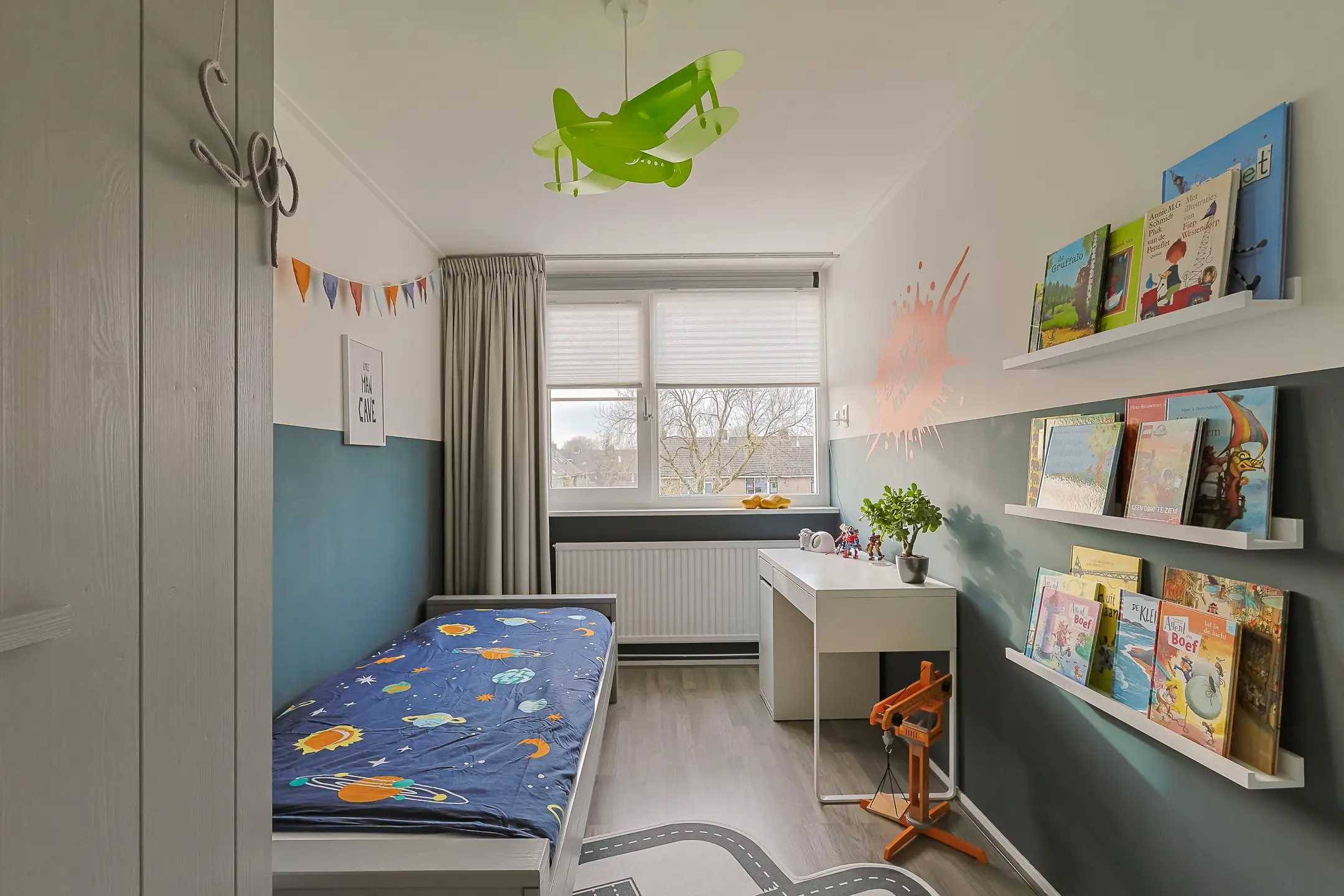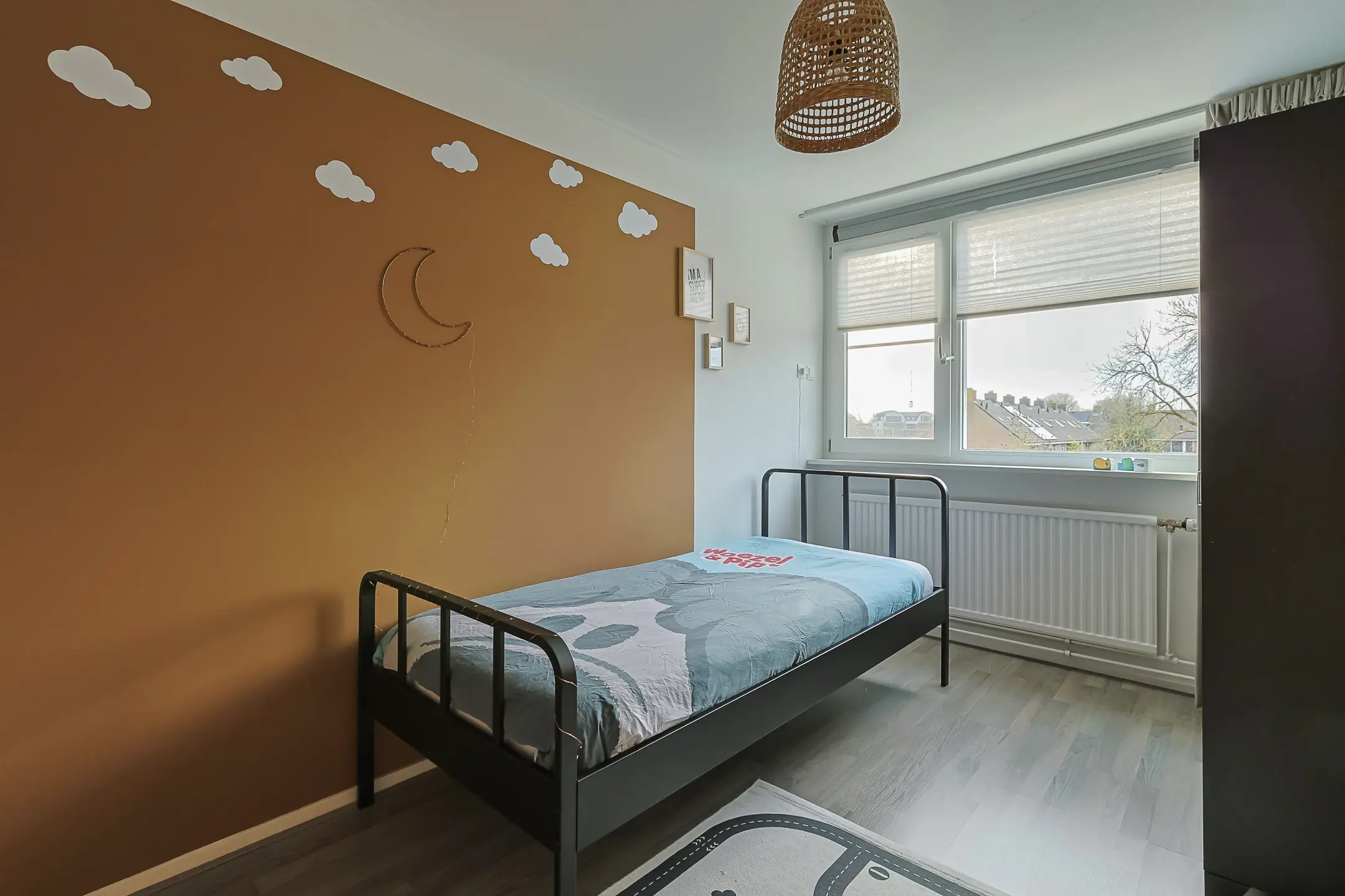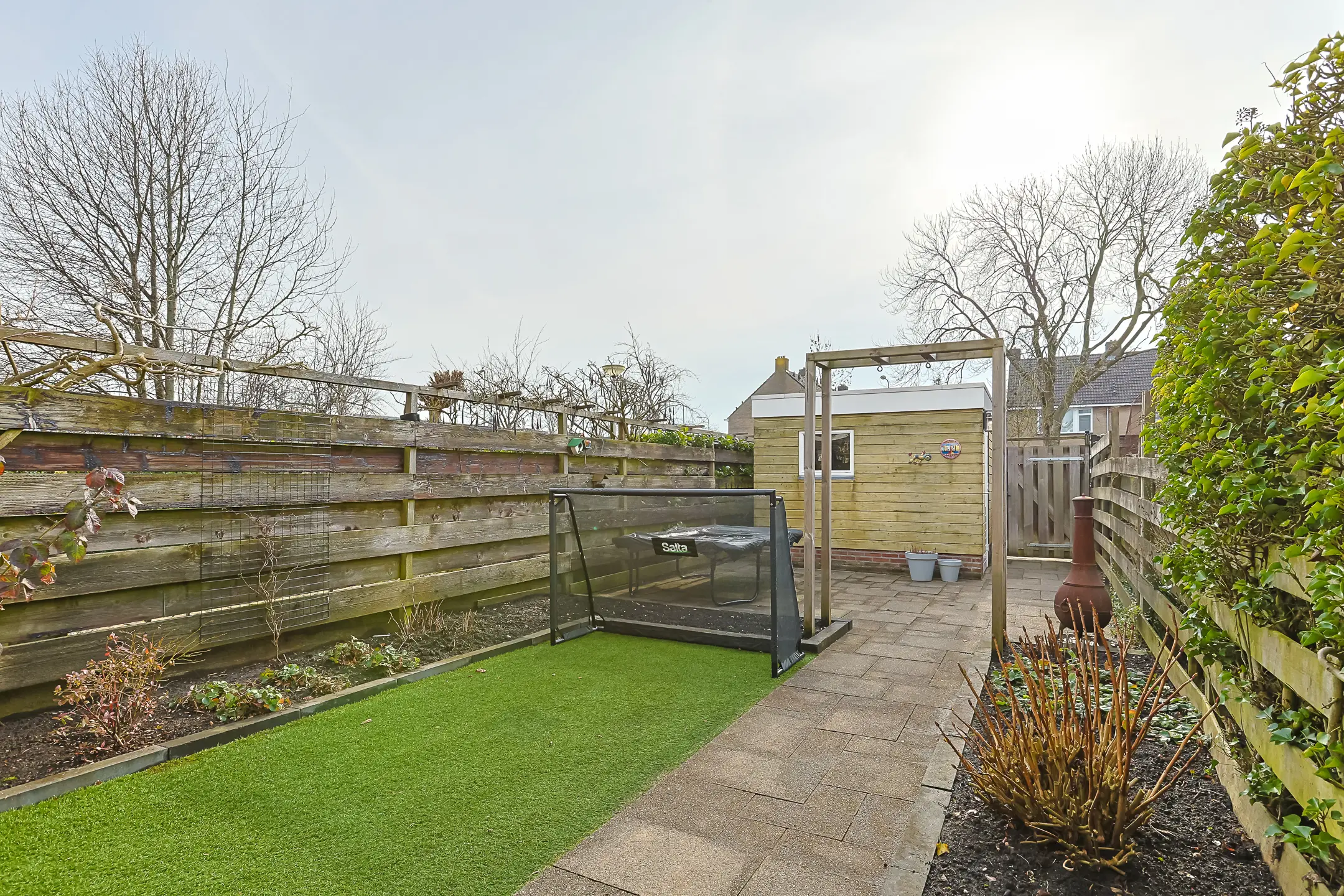 De achtertuin is met een lengte van circa 16,5 meter een absoluut pluspunt. Direct achter de woning bevindt zich een fijne overkapping waar je beschut kunt zitten. De tuin is verzorgd aangelegd met plantenborders, een gazon en een extra terras aan de achterzijde. Door de ligging op het zuidoosten en de royale diepte is er altijd wel een plek in de zon of juist in de schaduw te vinden. Een achterom en een houten berging maken het geheel compleet.