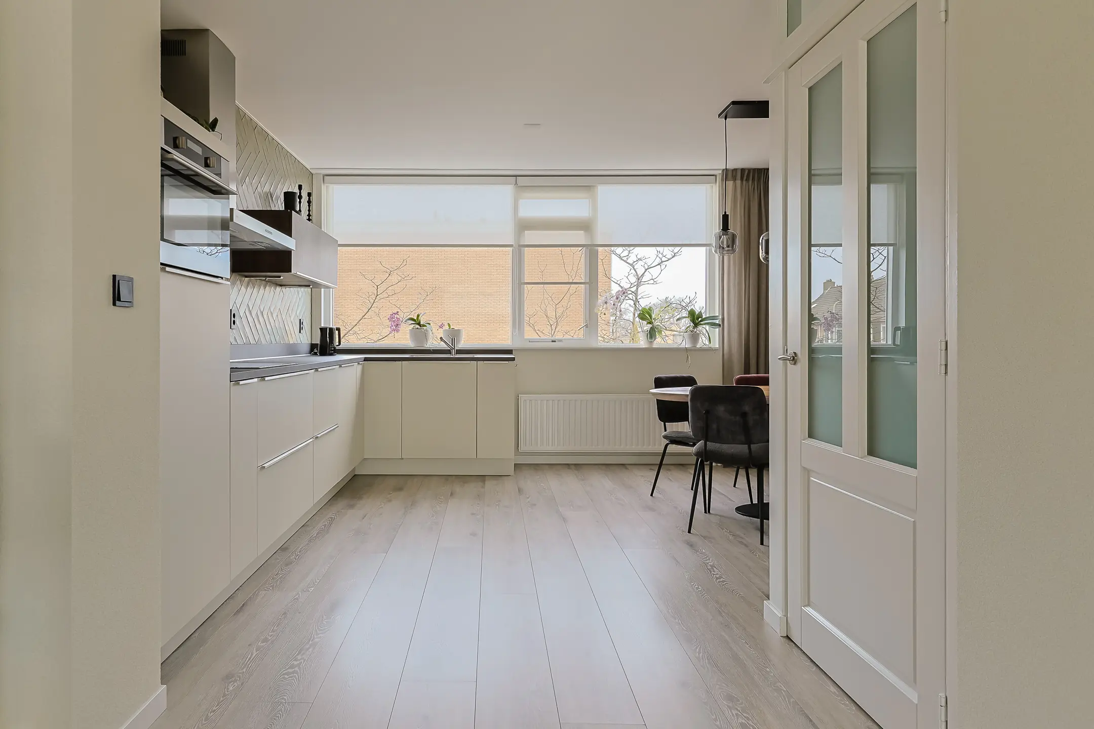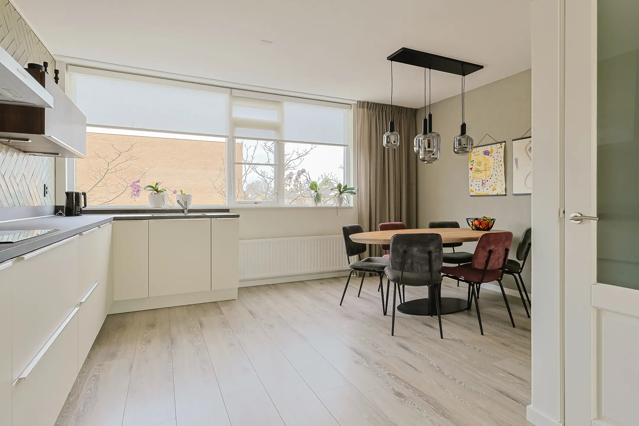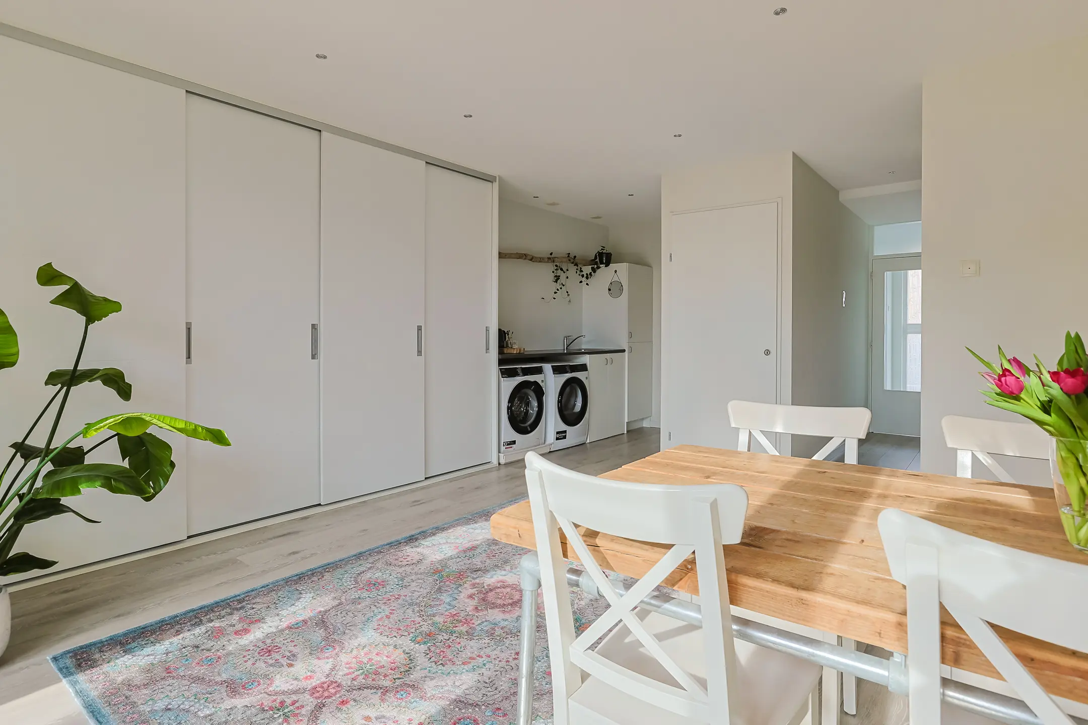 Aan de voorzijde bevindt zich de moderne eetkeuken in hoekopstelling. De keuken is stijlvol afgewerkt met een donker werkblad, lichte fronten en een stoere visgraattegel als achterwand. Uiteraard voorzien van diverse inbouwapparatuur, waaronder een inductiekookplaat met afzuigkap, vaatwasser, koelkast en combi-oven. Er is voldoende ruimte om een grote eettafel te plaatsen waardoor je gezellig met familie en vrienden kunt tafelen.