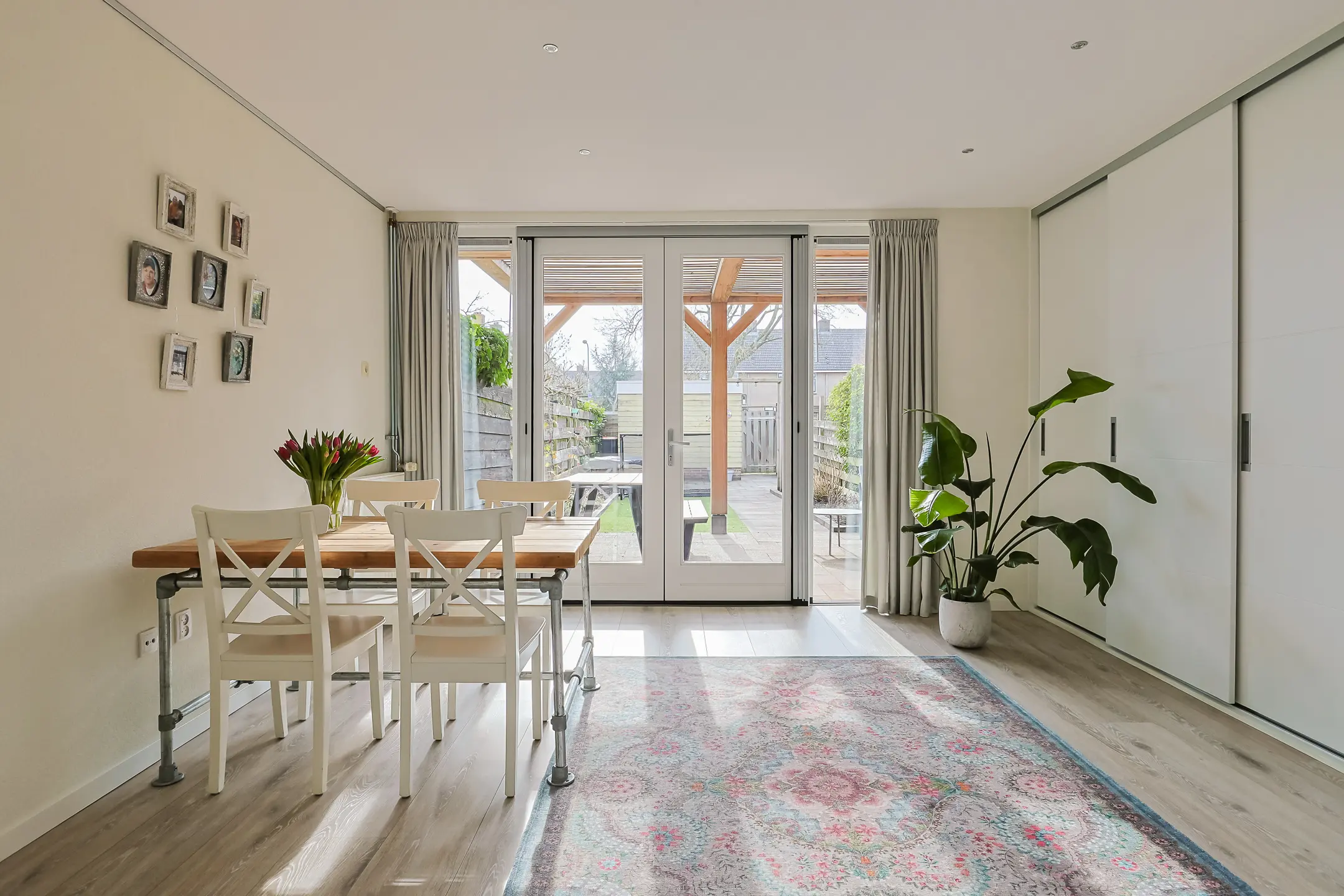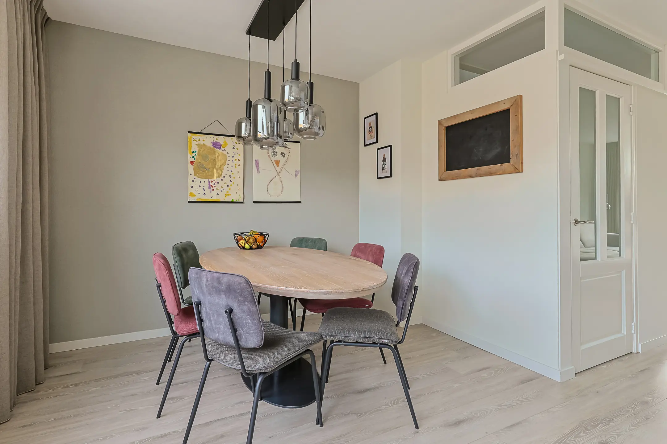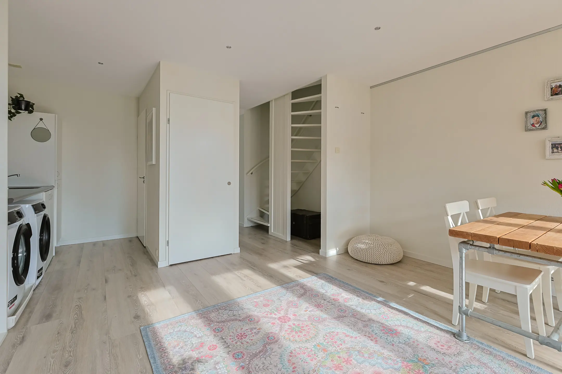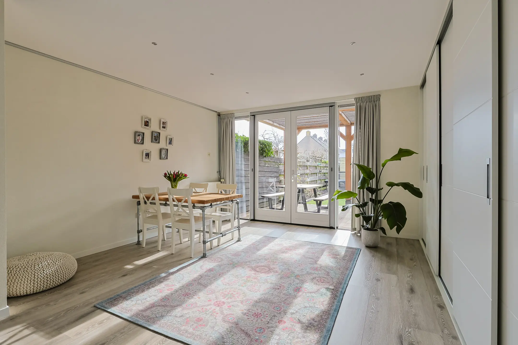 Aan de voorzijde bevindt zich de moderne eetkeuken in hoekopstelling. De keuken is stijlvol afgewerkt met een donker werkblad, lichte fronten en een stoere visgraattegel als achterwand. Uiteraard voorzien van diverse inbouwapparatuur, waaronder een inductiekookplaat met afzuigkap, vaatwasser, koelkast en combi-oven. Er is voldoende ruimte om een grote eettafel te plaatsen waardoor je gezellig met familie en vrienden kunt tafelen.