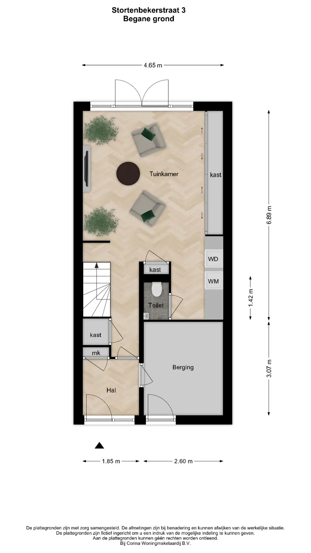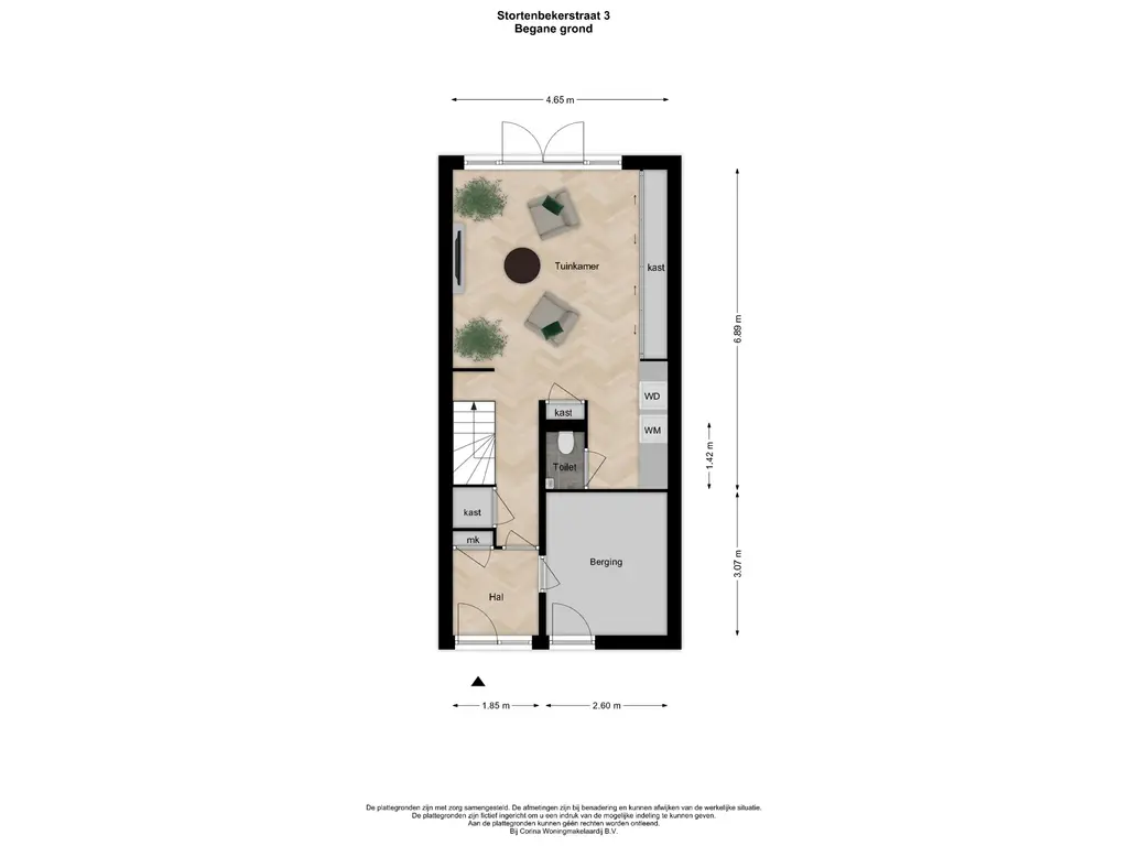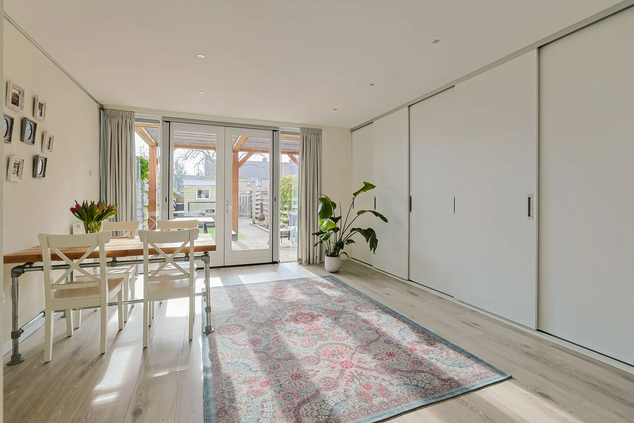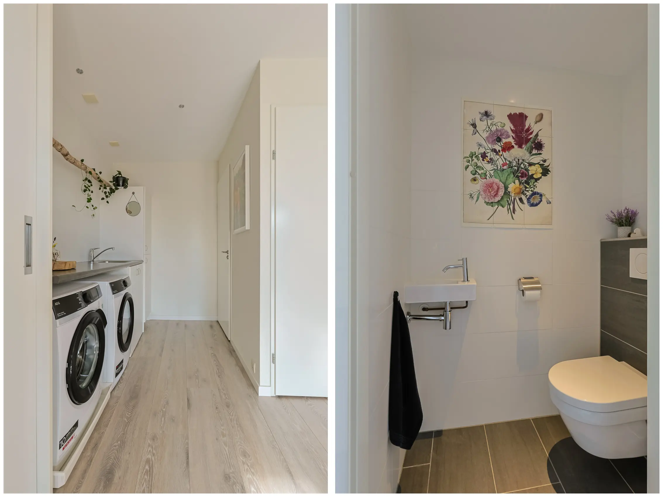 Entree met toiletruimte, trapopgang en toegang tot de praktische berging (de voormalige garage). Aan de achterzijde bevindt zich een fijne tuinkamer die voor diverse doeleinden geschikt is. Denk aan een tweede woonkamer, woonkeuken, werkruimte aan huis of het realiseren van een extra slaapkamer. De ruimte beschikt over een praktische schuifkastenwand met volop bergruimte en de aansluitingen voor de was-apparatuur. Het plafond is strak afgewerkt en beschikt over inbouwspots. Via openslaande deuren bereik je de heerlijke achtertuin.