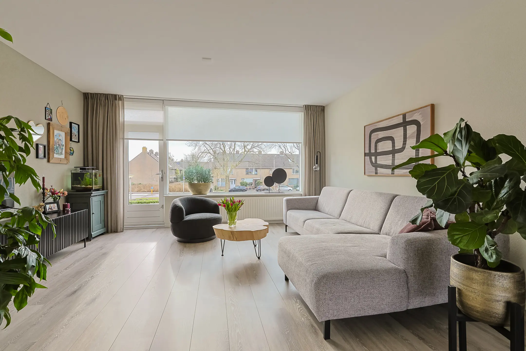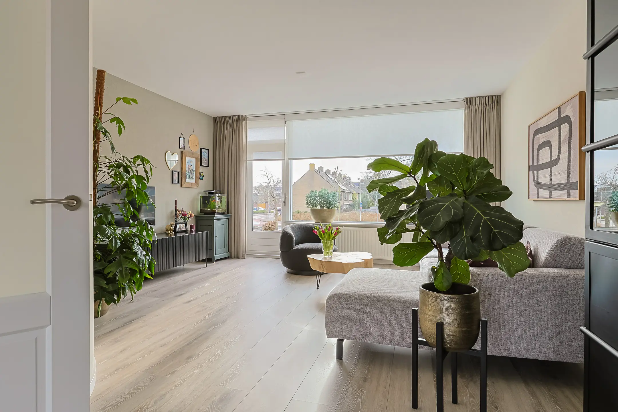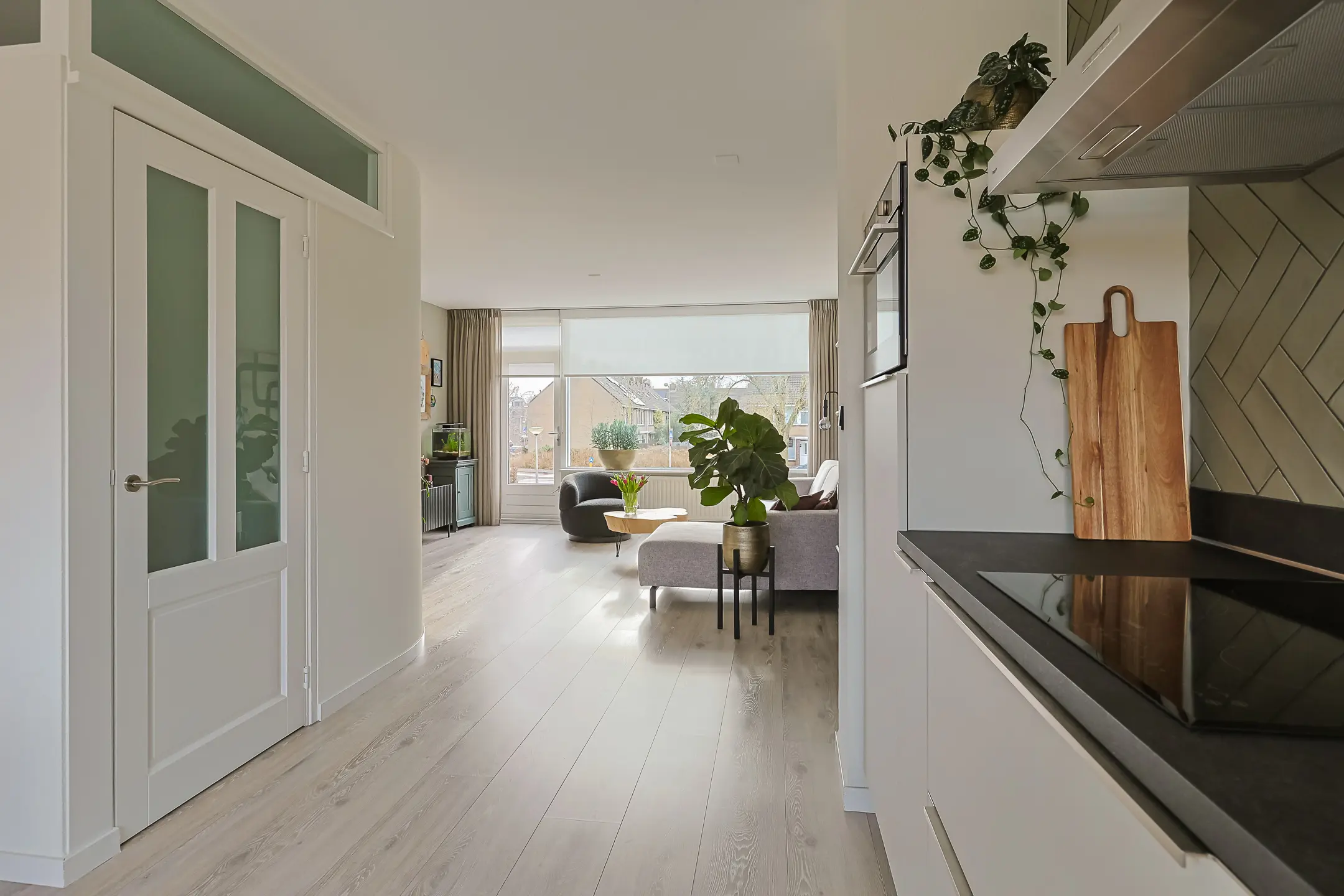 Wat een licht! Doordat de woonkamer en keuken met elkaar in verbinding staan, profiteert deze verdieping van een fijne lichtinval aan zowel de voor- als achterzijde. De woonkamer ligt aan de achterzijde en biedt een vrij uitzicht over de tuin en de groene omgeving.