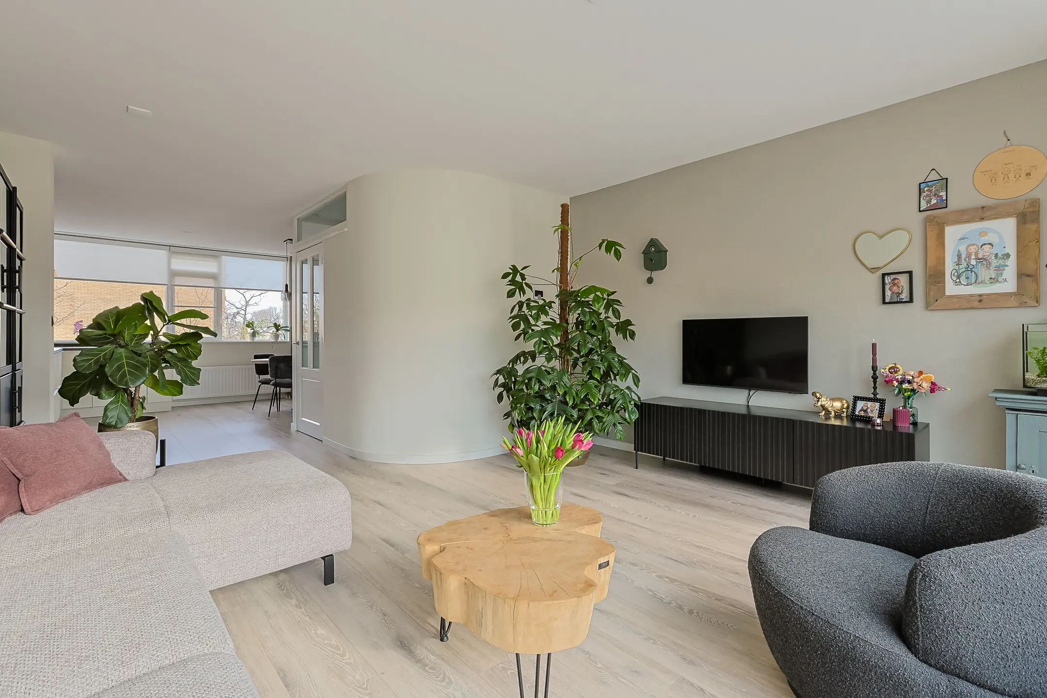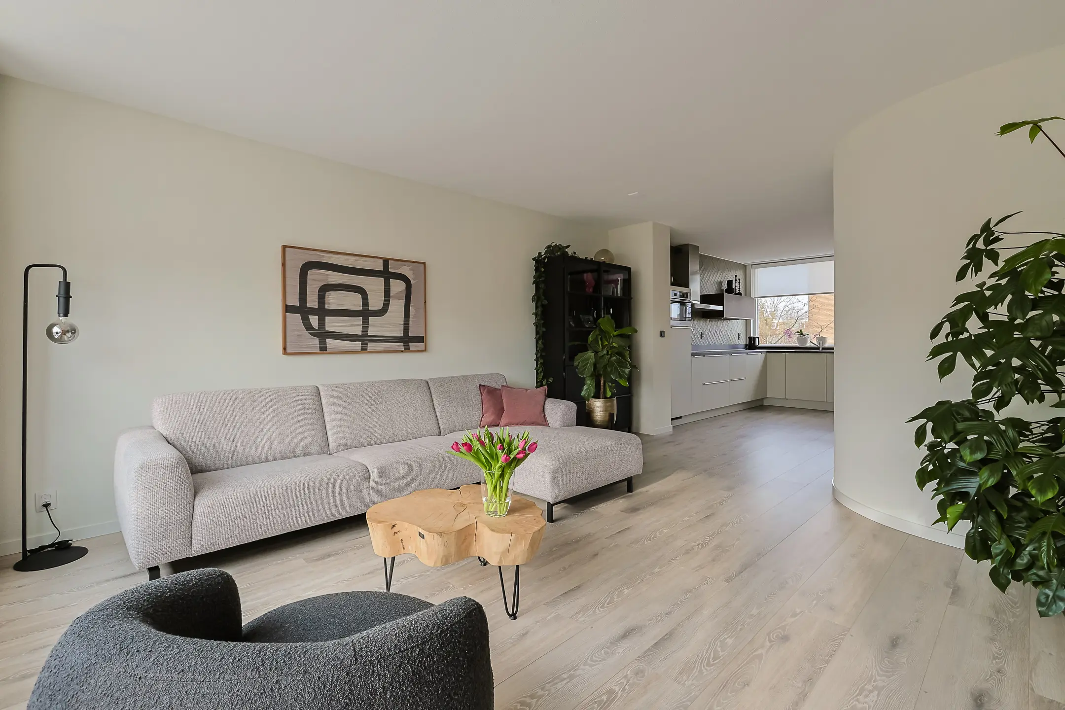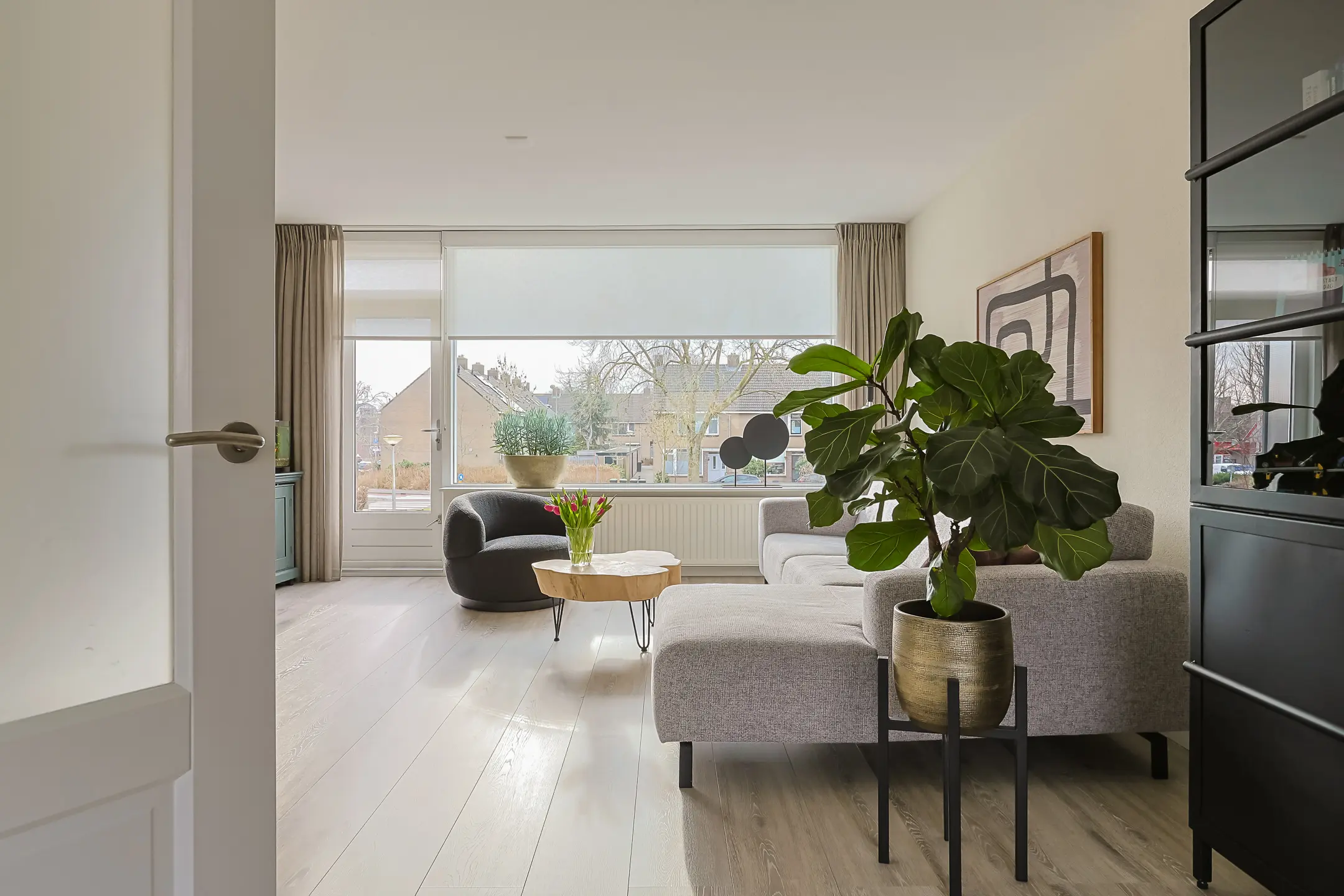 Wat een licht! Doordat de woonkamer en keuken met elkaar in verbinding staan, profiteert deze verdieping van een fijne lichtinval aan zowel de voor- als achterzijde. De woonkamer ligt aan de achterzijde en biedt een vrij uitzicht over de tuin en de groene omgeving.