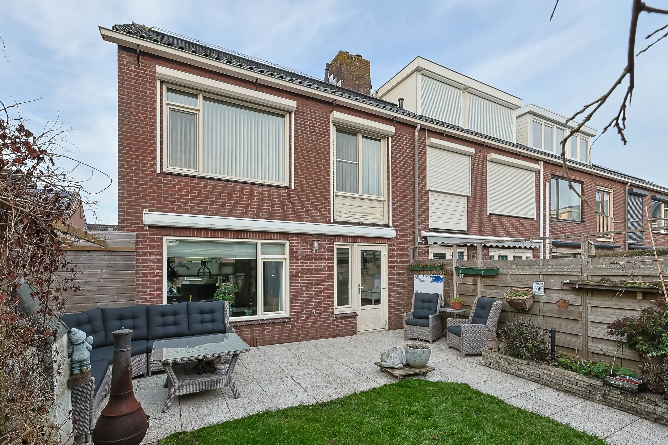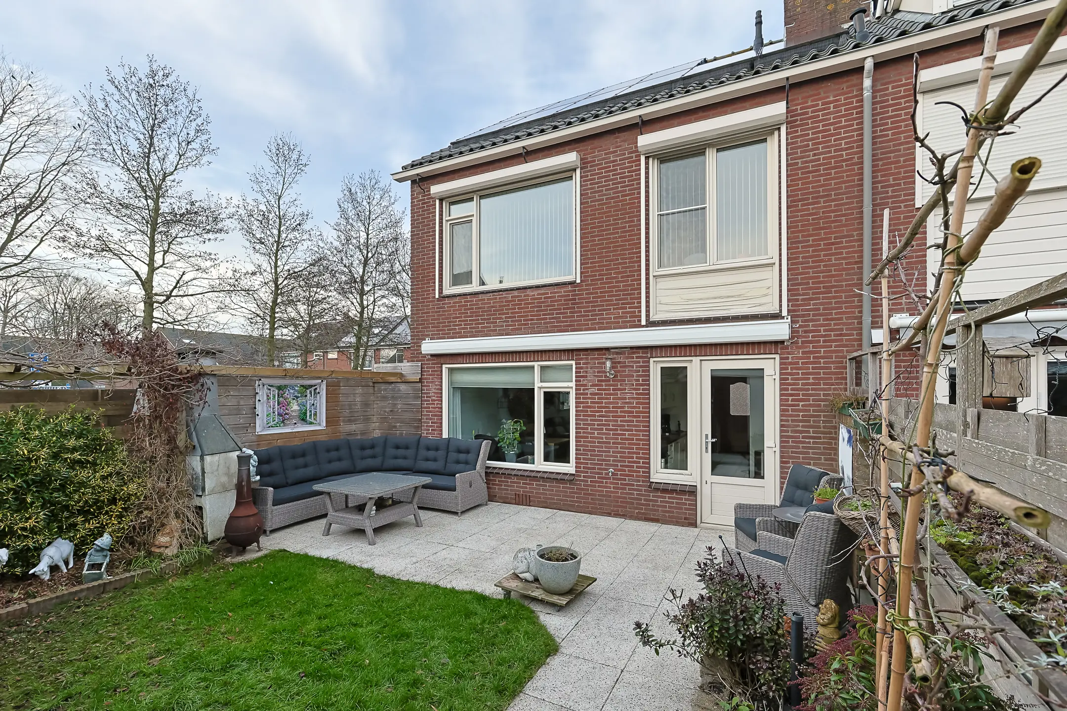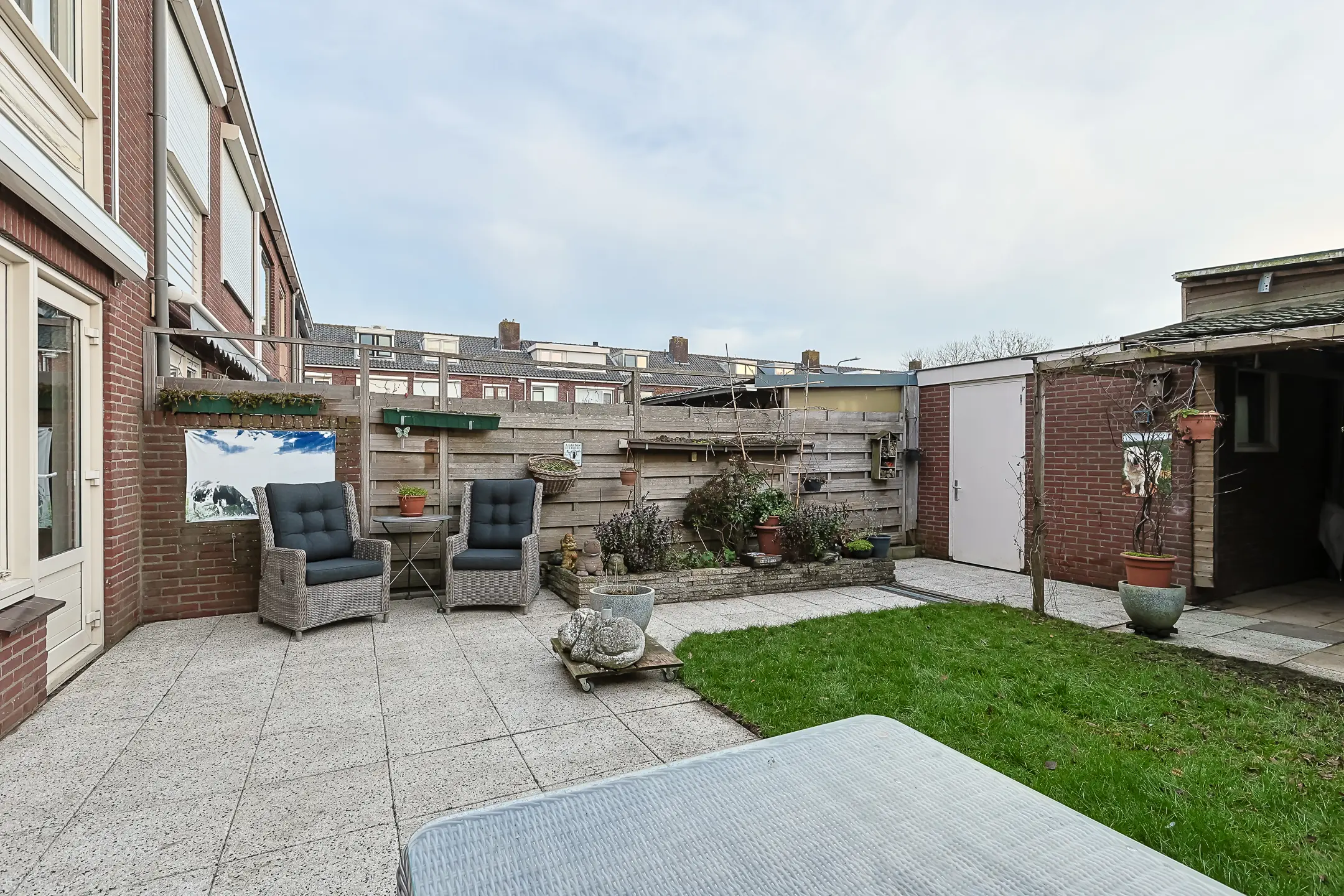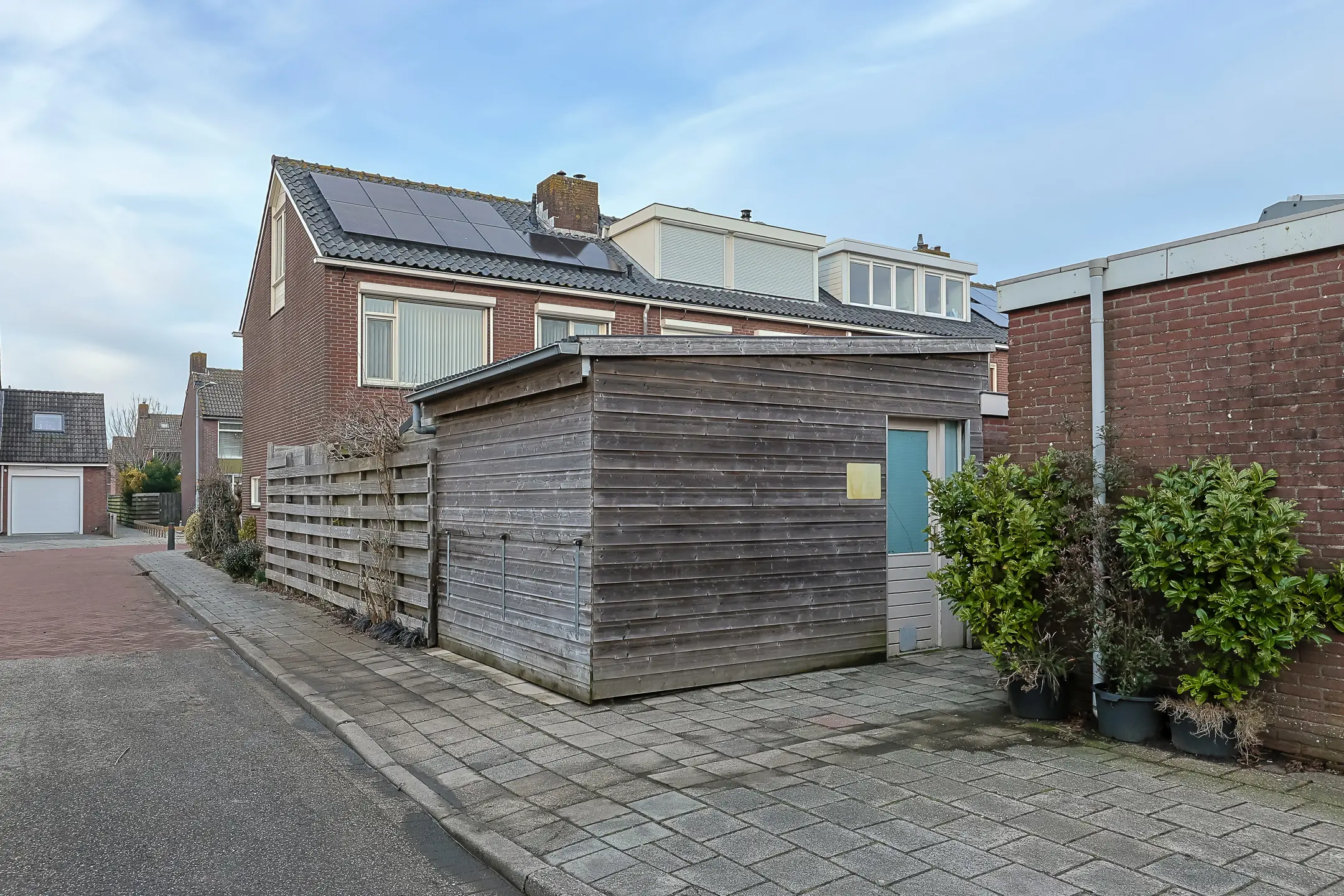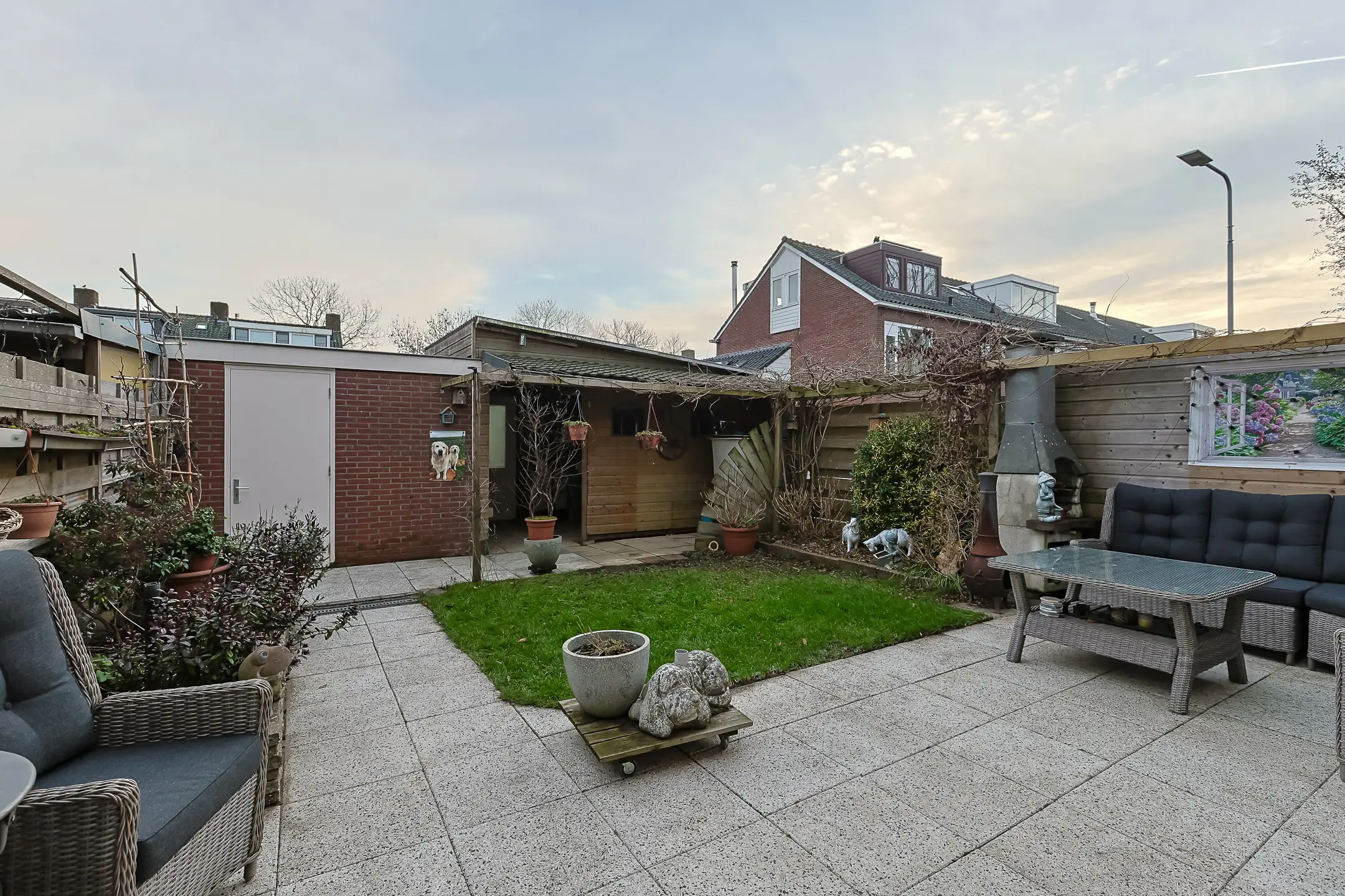 De achtertuin ligt op het zuidoosten en biedt veel zonuren. Achterin de tuin vind je een vrijstaande berging en een overkapping: ideaal voor fietsen, tuingereedschap of een fijne zitplek in de schaduw. Via de achterom is de tuin ook gemakkelijk bereikbaar.