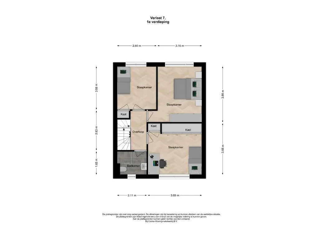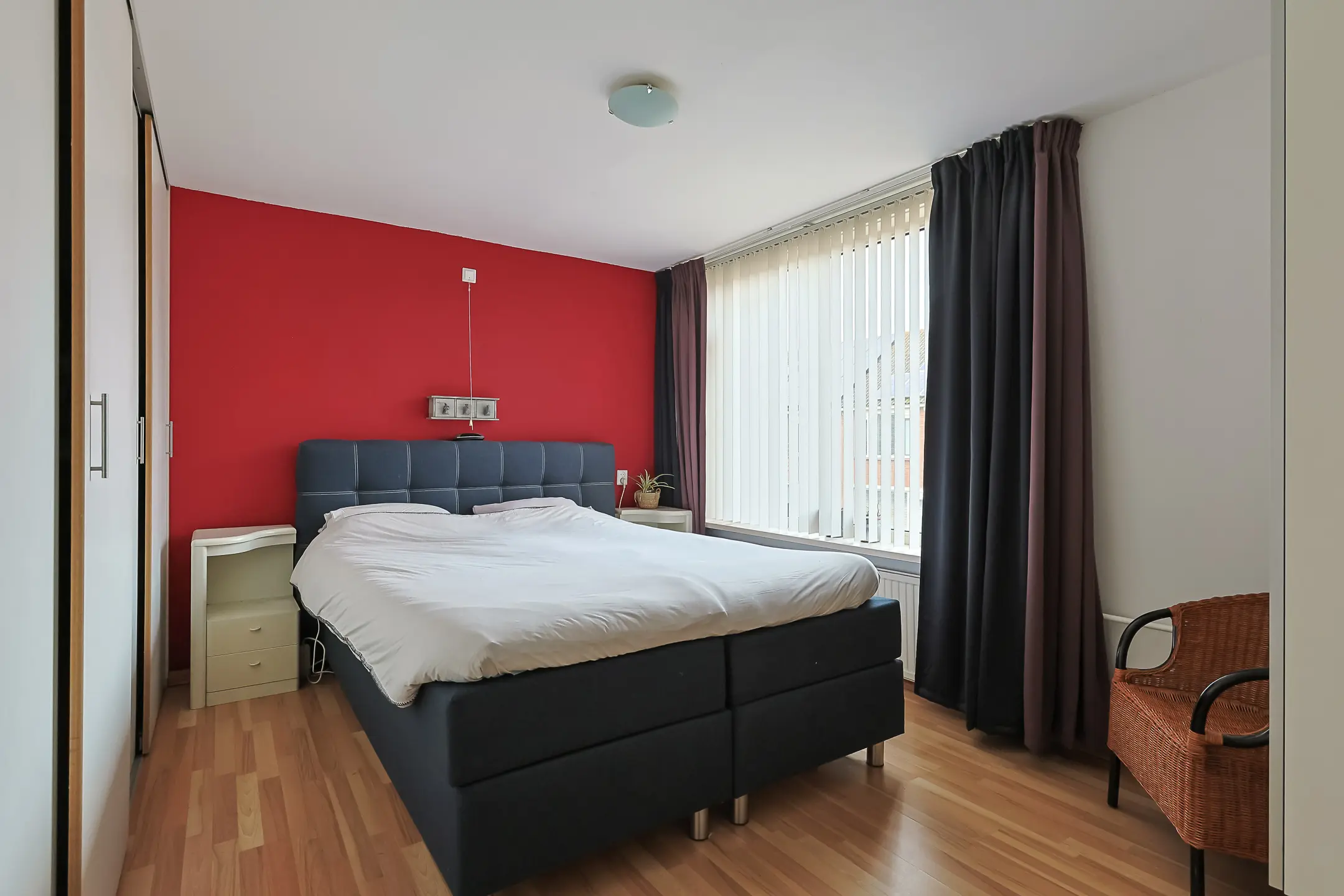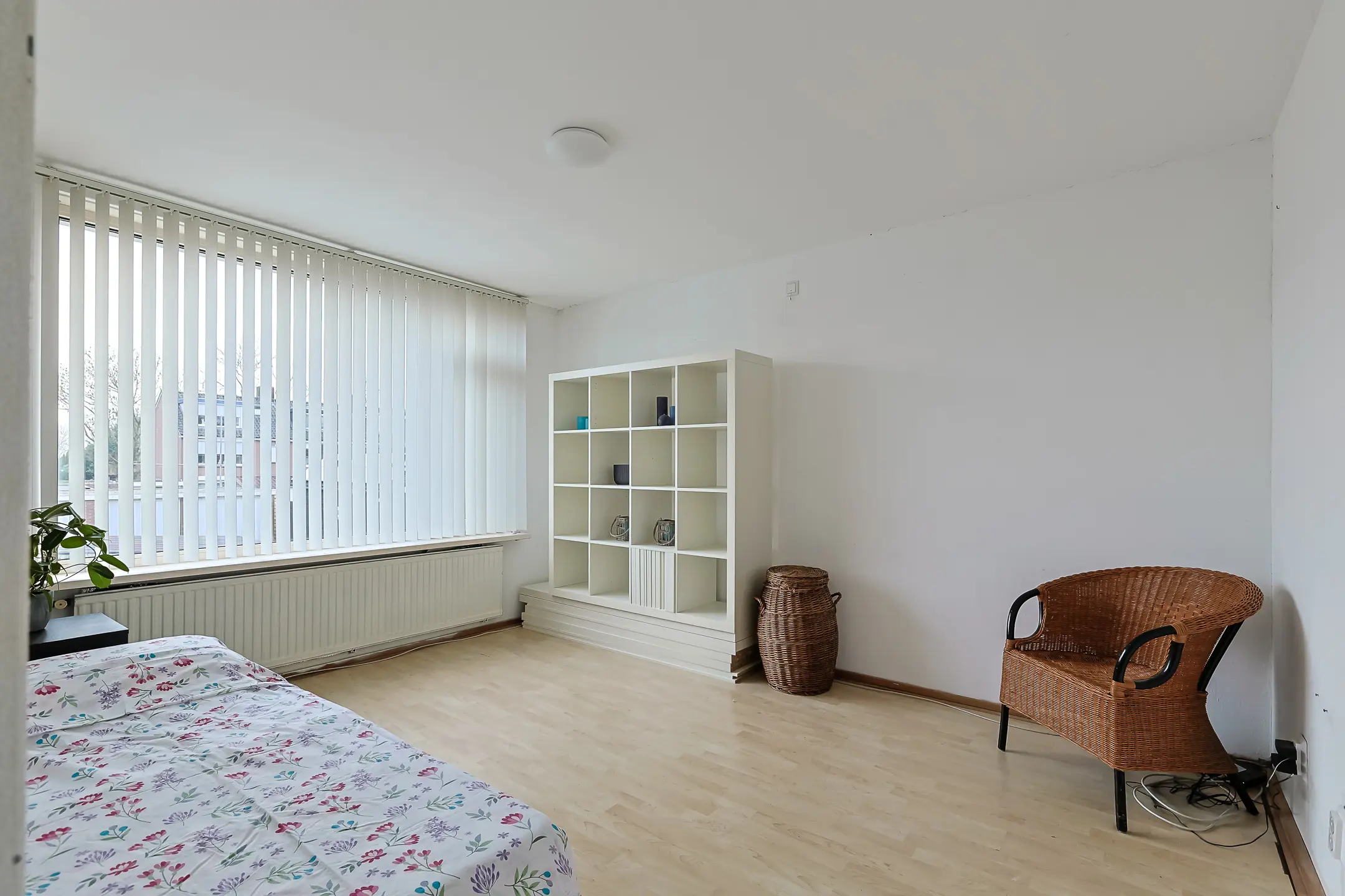Via de overloop zijn drie slaapkamers en de badkamer bereikbaar. De grootste slaapkamer aan de voorzijde beschikt over een brede schuifwandenkasten. Aan de achterzijde liggen twee slaapkamers welke voorzien zijn van rolluiken. De eenvoudige badkamer is voorzien van een douche, toilet en wastafel. De hele verdieping is afgewerkt met een licht laminaat.