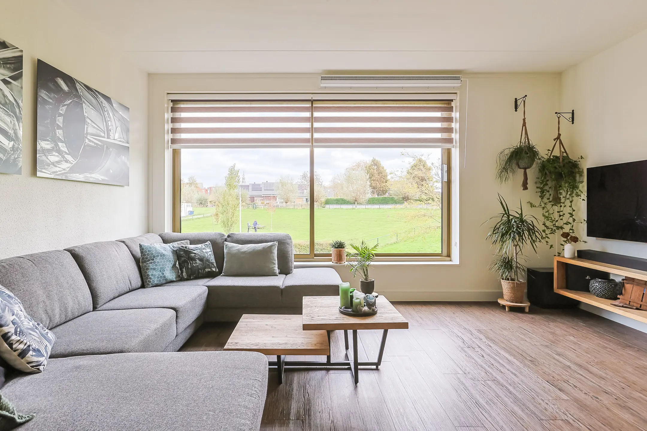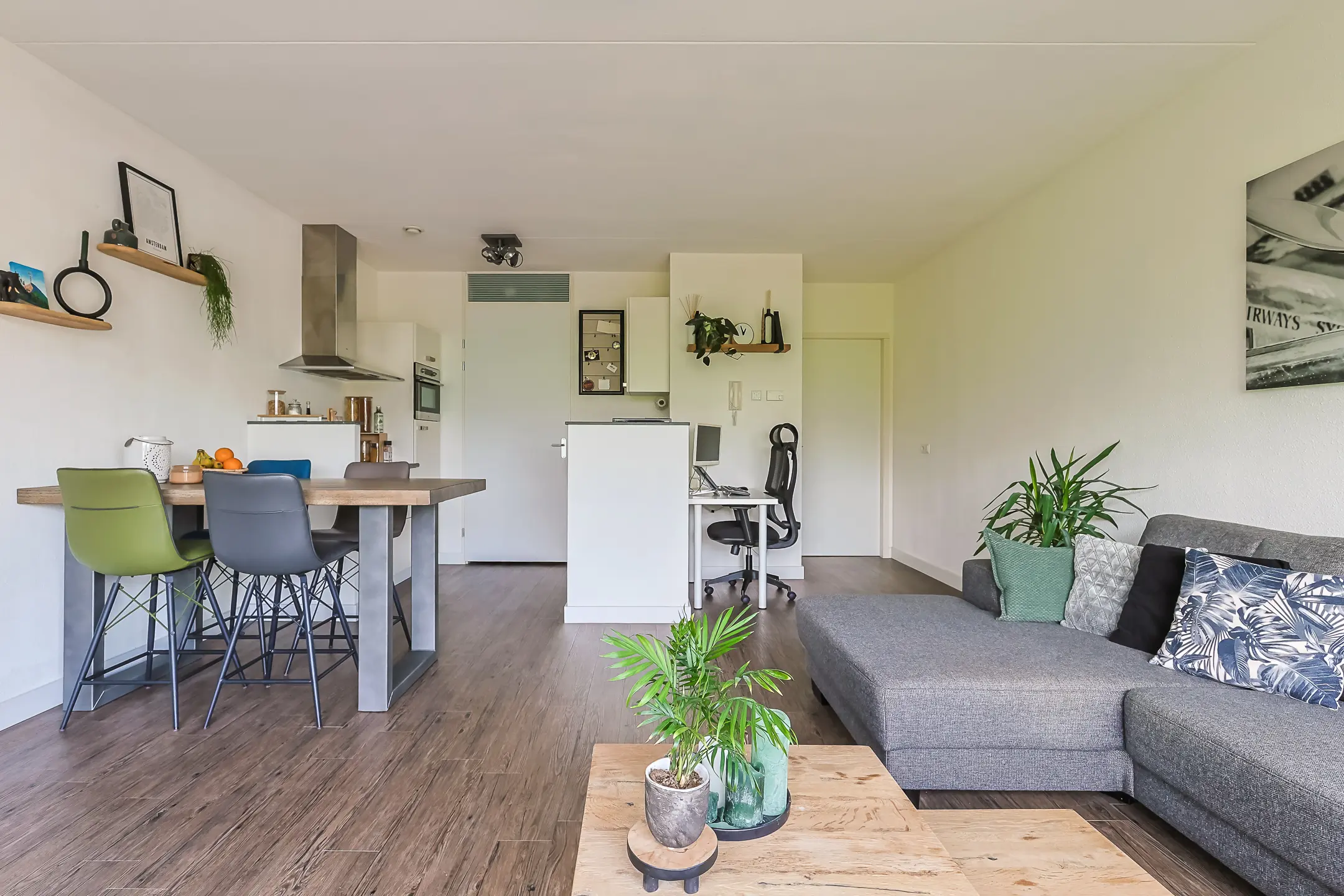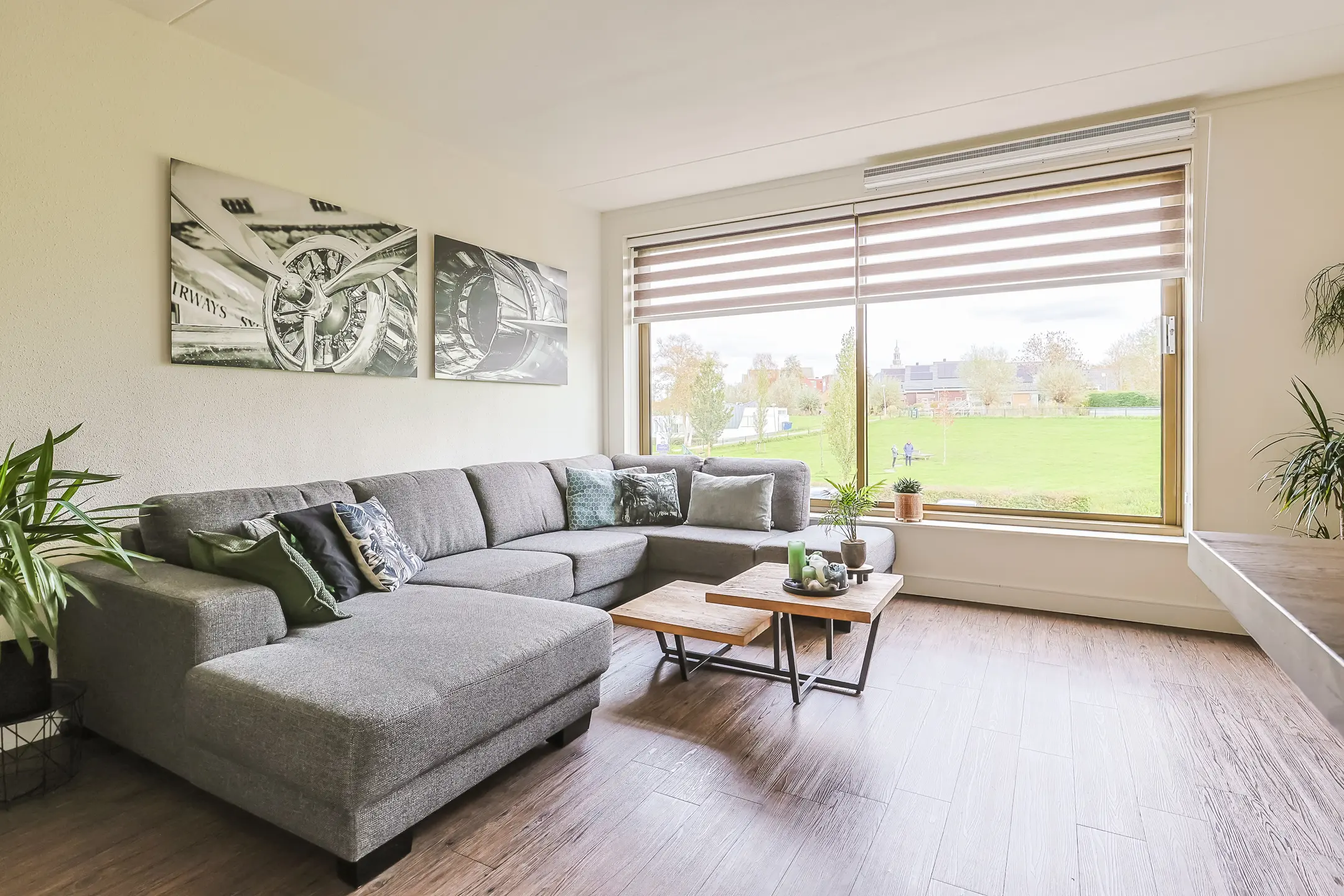 Via de centrale entree met bellenplateau, lift en trappenhuis bereik je de eerste verdieping. Je komt het appartement binnen in de hal met meterkast en met toegang tot de woonkamer. De woonkamer ligt aan de achterzijde en heeft dankzij het grote schuifraam een fijne lichtinval, uitzicht over een groenstrook en richting de dijk en het centrum van Nieuwkoop. De ligging op de eerste verdieping zorgt voor een open gevoel, zonder directe inkijk.