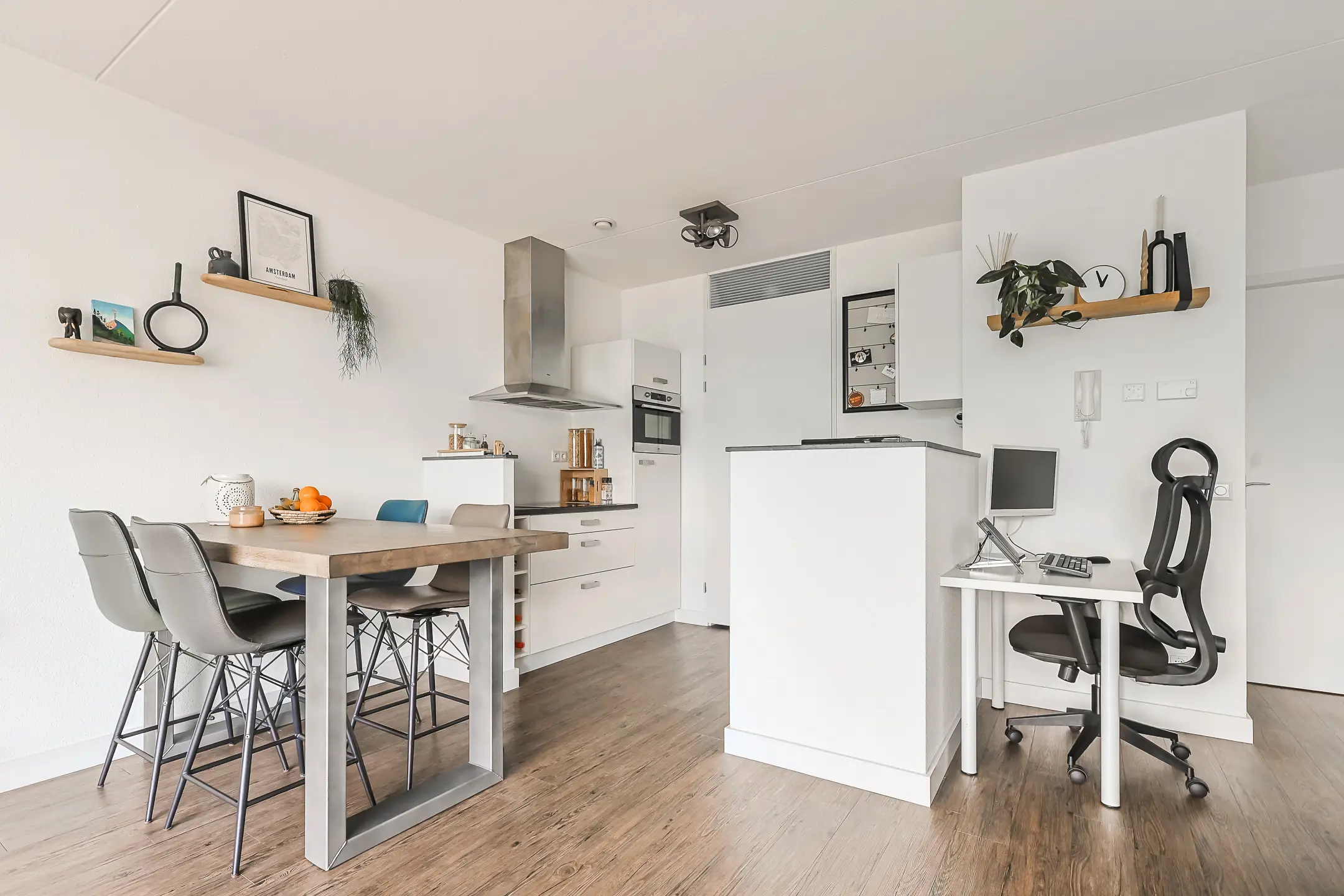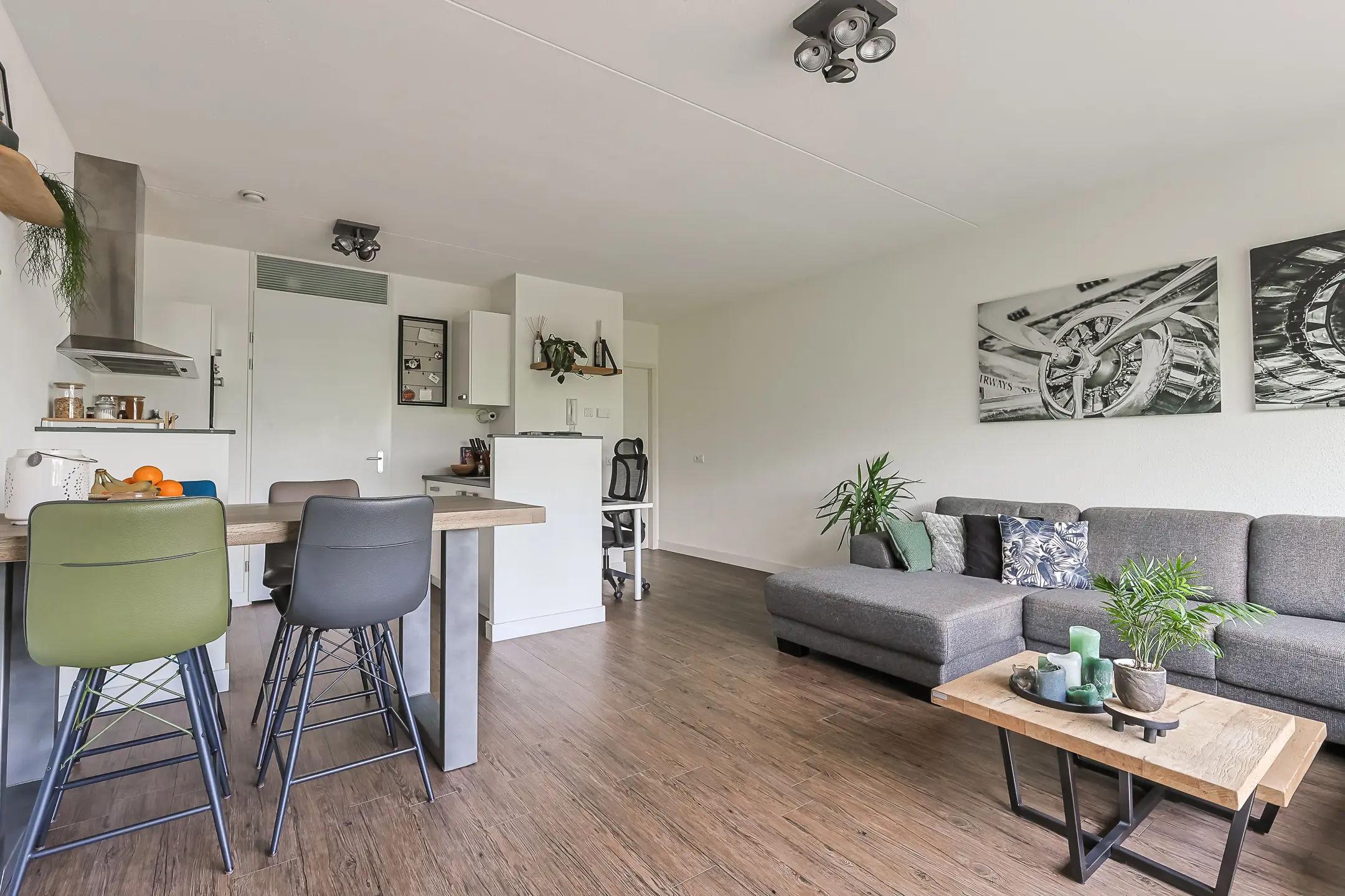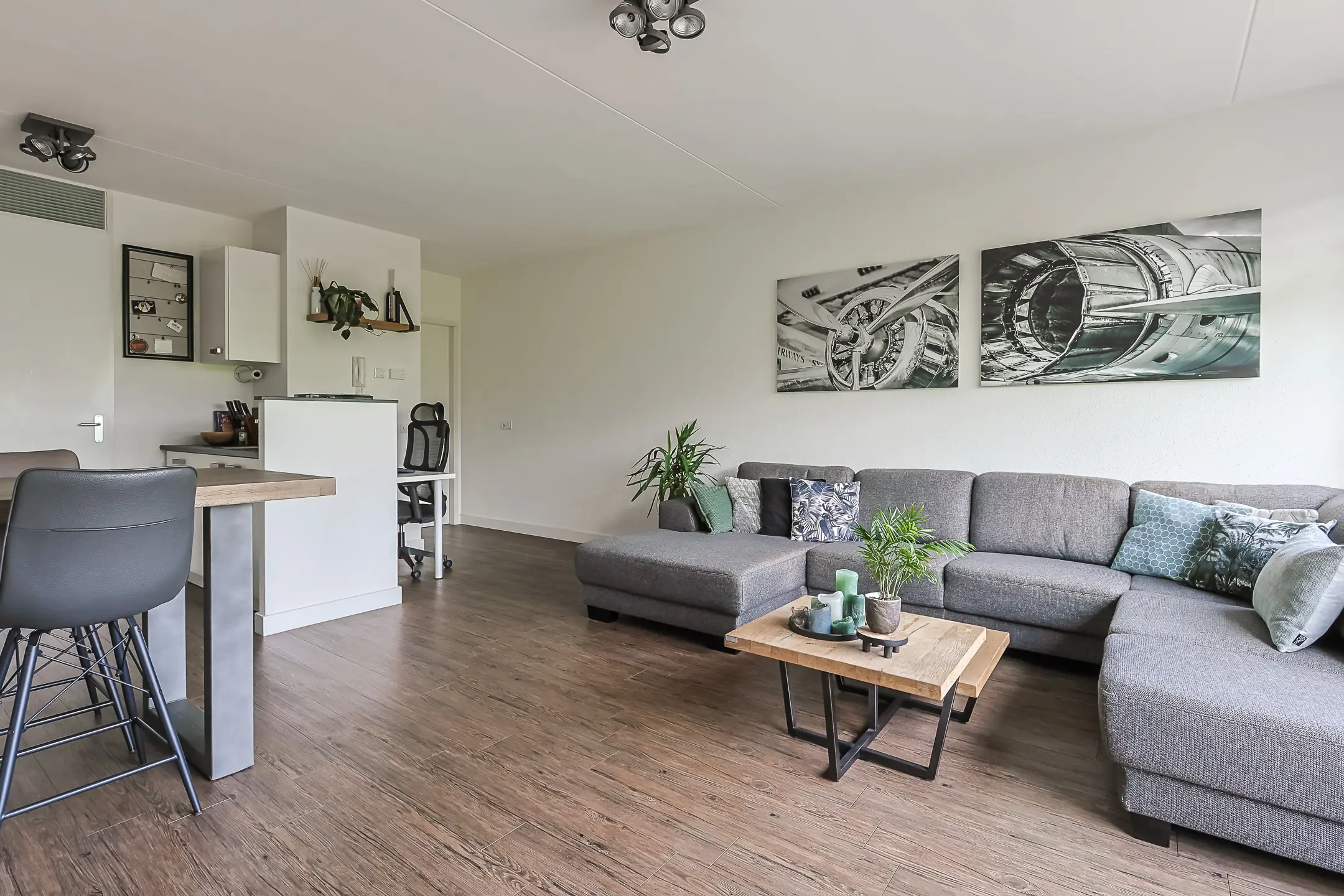 Via de centrale entree met bellenplateau, lift en trappenhuis bereik je de eerste verdieping. Je komt het appartement binnen in de hal met meterkast en met toegang tot de woonkamer. De woonkamer ligt aan de achterzijde en heeft dankzij het grote schuifraam een fijne lichtinval, uitzicht over een groenstrook en richting de dijk en het centrum van Nieuwkoop. De ligging op de eerste verdieping zorgt voor een open gevoel, zonder directe inkijk.