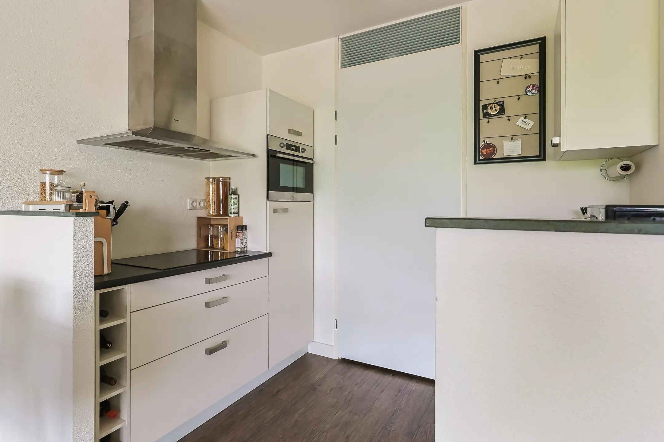 De open keuken sluit hier mooi op aan en is uitgerust met een inductiekookplaat, afzuigkap, combimagnetron, koel-vriescombinatie en vaatwasser. Aansluitend ligt de bijkeuken, waar je naast extra bergruimte ook de wasmachine-aansluiting en de technische installaties vindt, zoals de warmtewisselaar en de pomp voor de vloerverwarming.