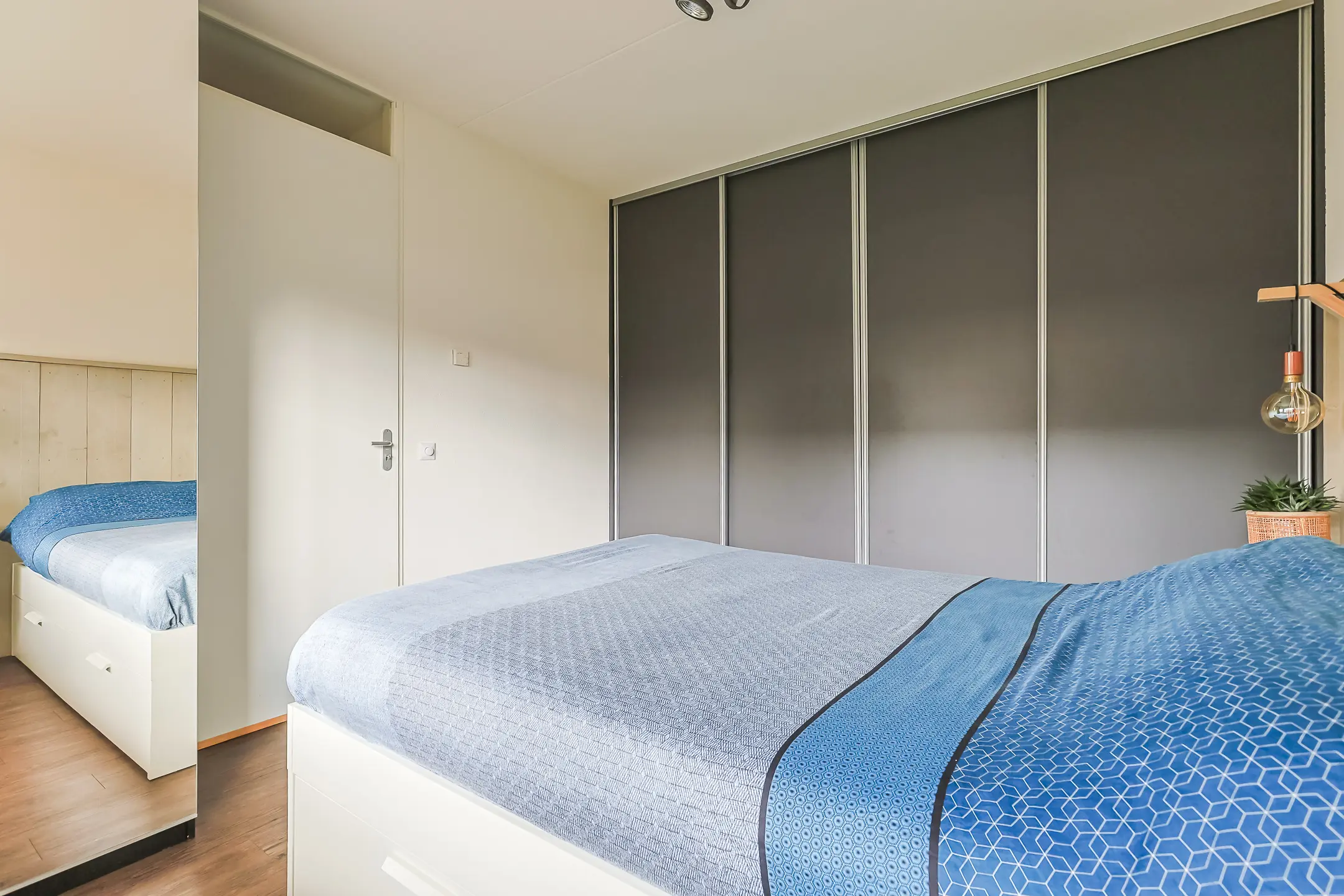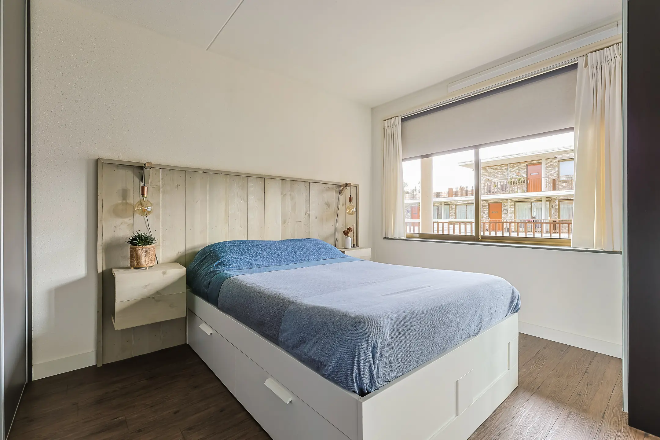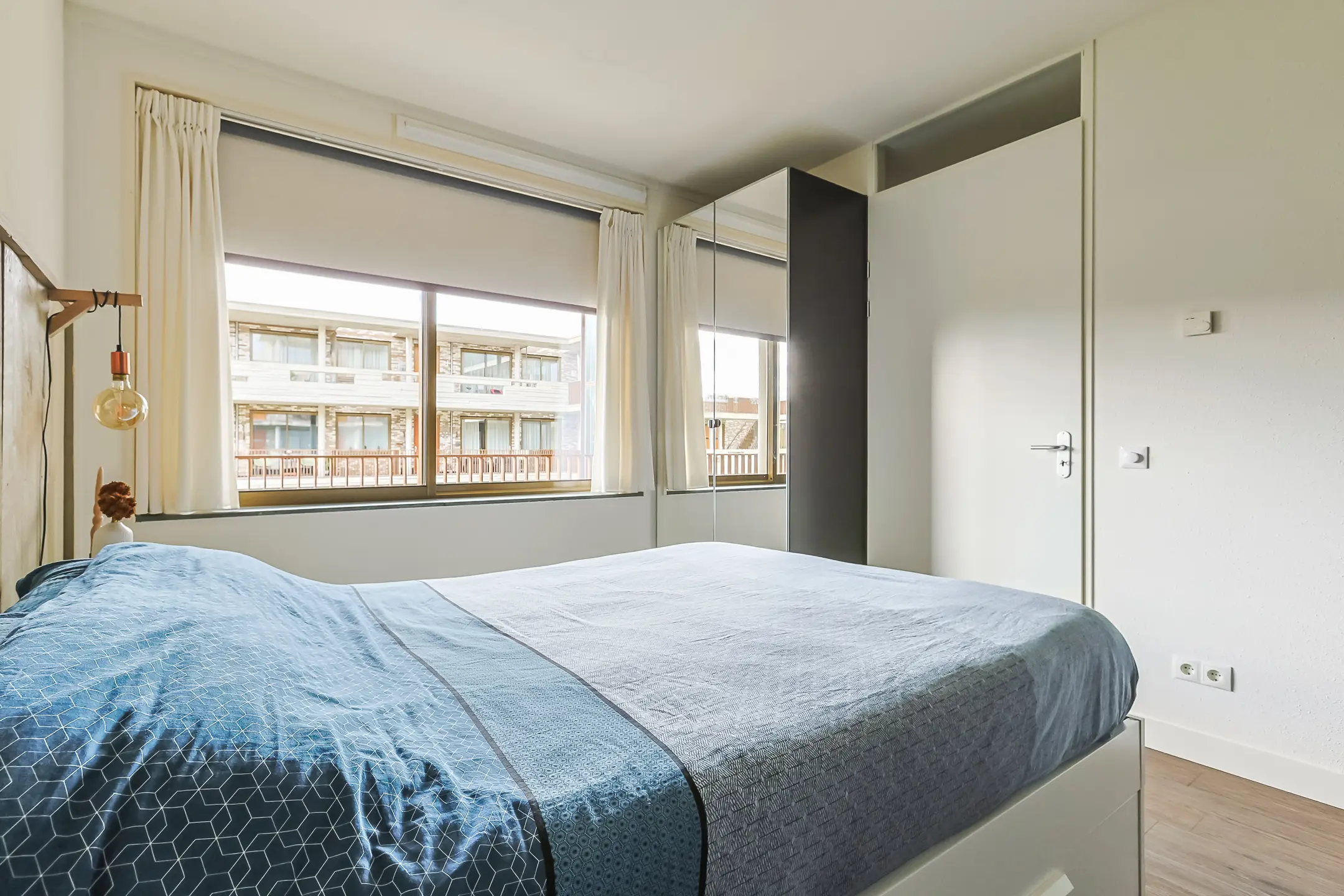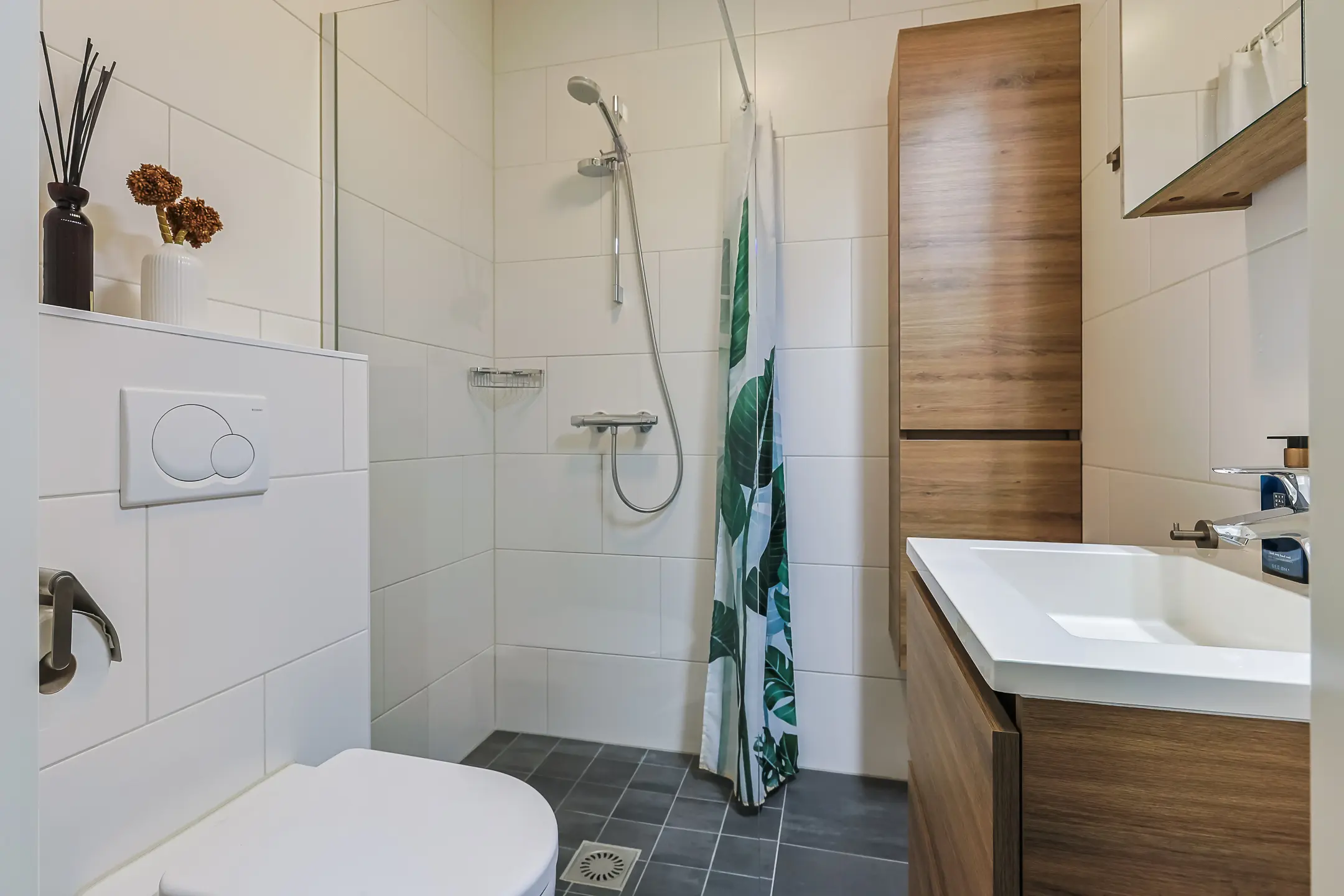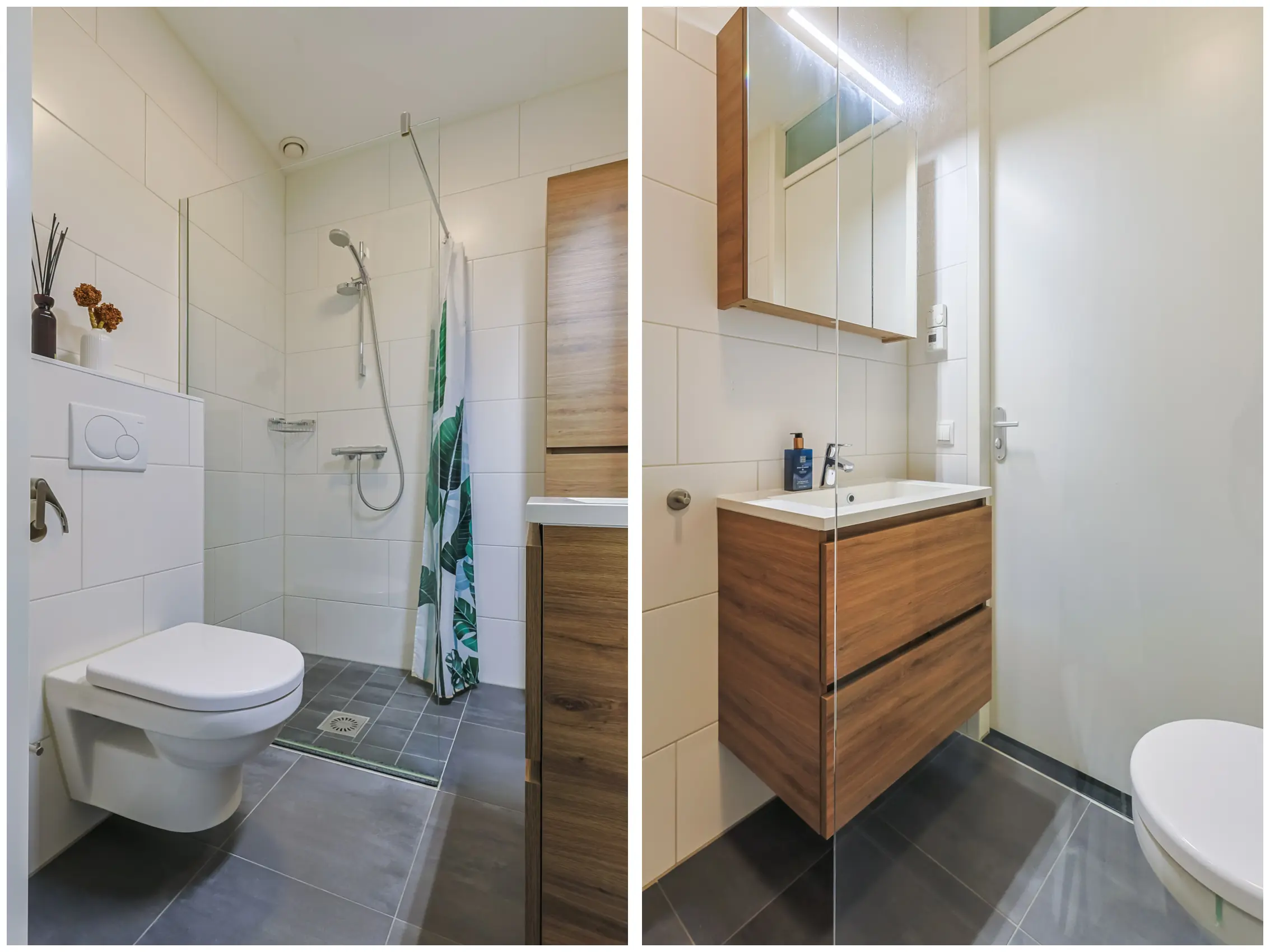 De slaapkamer ligt aan de rustige galerijzijde en beschikt over een vaste schuifkastenwand. De badkamer is fris afgewerkt in grijs-witte tinten en biedt een douchehoek, wastafelmeubel in houtlook en een vrijhangend toilet.